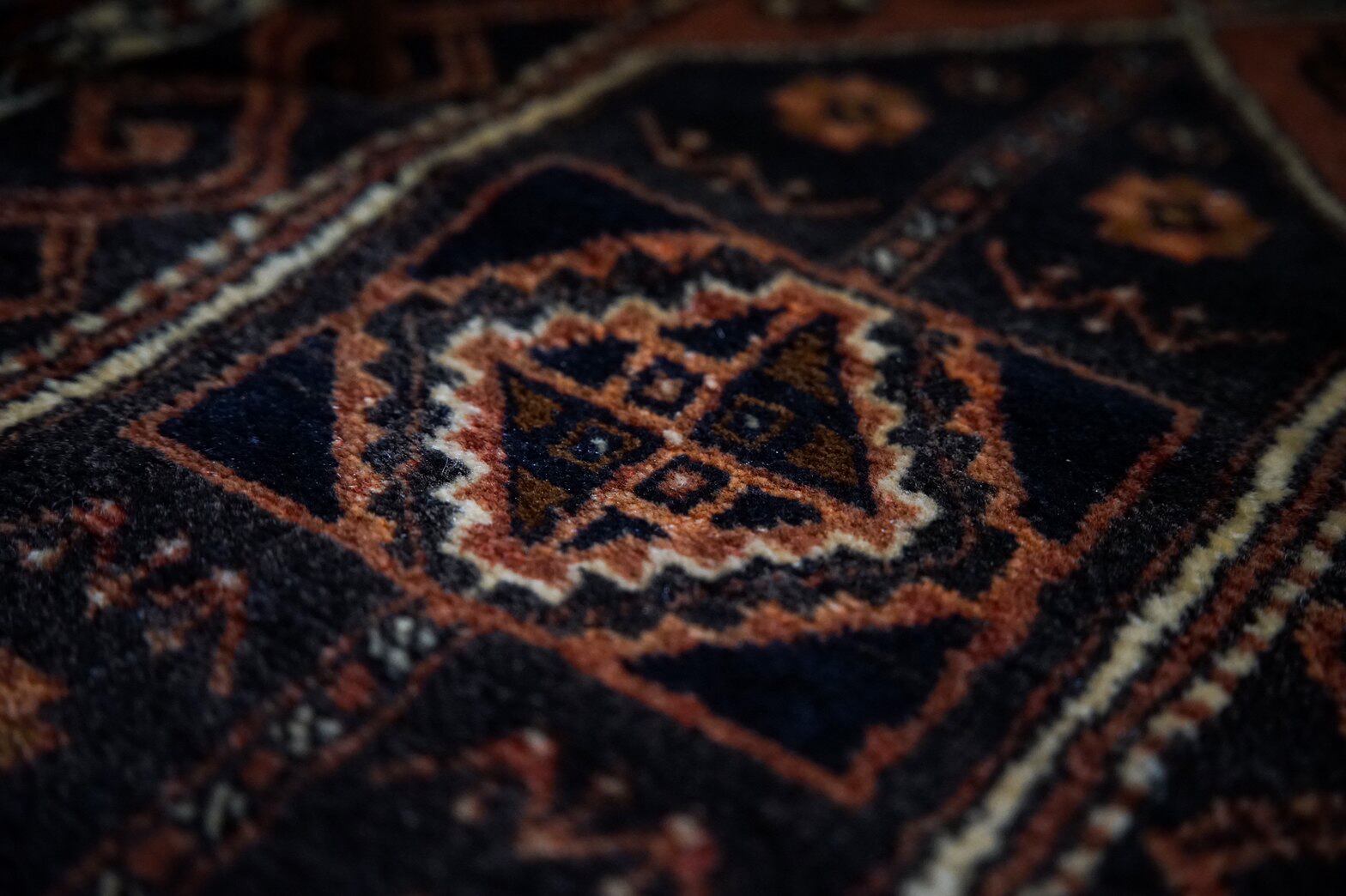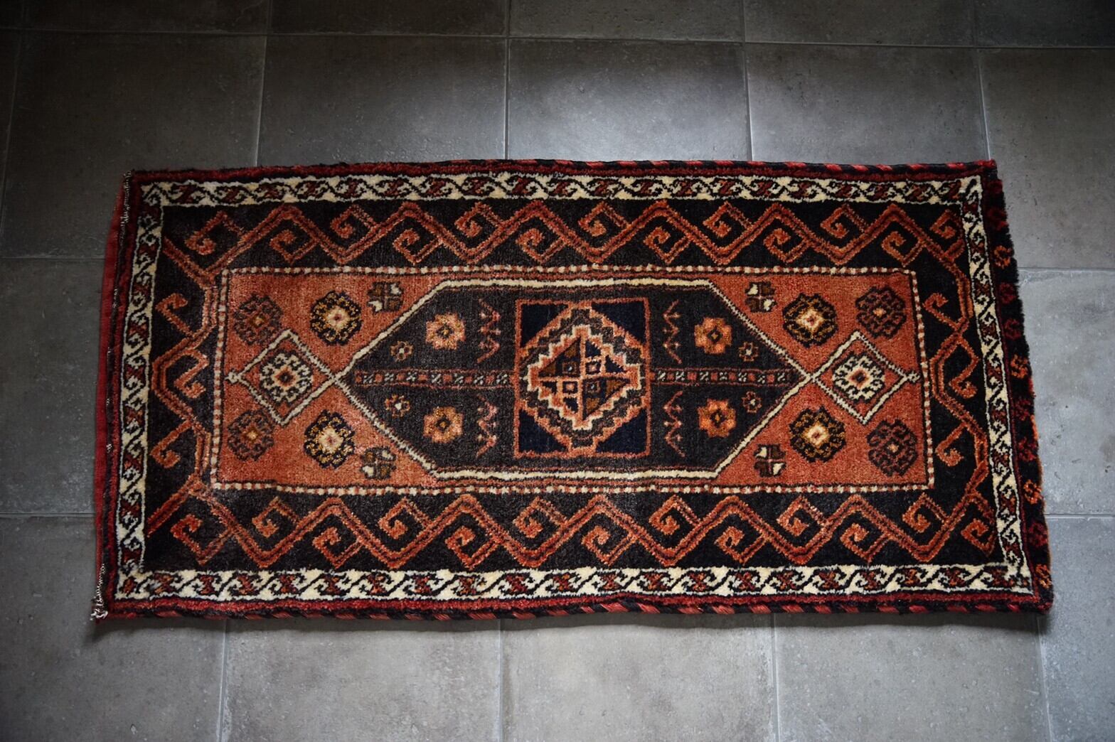 ヤストゥクというクッションカバーを開いて絨毯としてリメイクしたラグですが、こちらの商品は2枚重ねのままになっており、裏面は真っ赤なキリムになっています。パイルは1〜2㎝ほどで、2枚合わせになっているため素足で乗っても厚いのでフカフカで暖かく、床の冷たさを通さない踏み心地。ブラウンに近い褪色したオレンジで秋冬にぴったり。艶のある色合いは色気すら感じます。玄関やベッドサイド、キャンプ、キッチンラグにと使い勝手がいいサイズ感です。