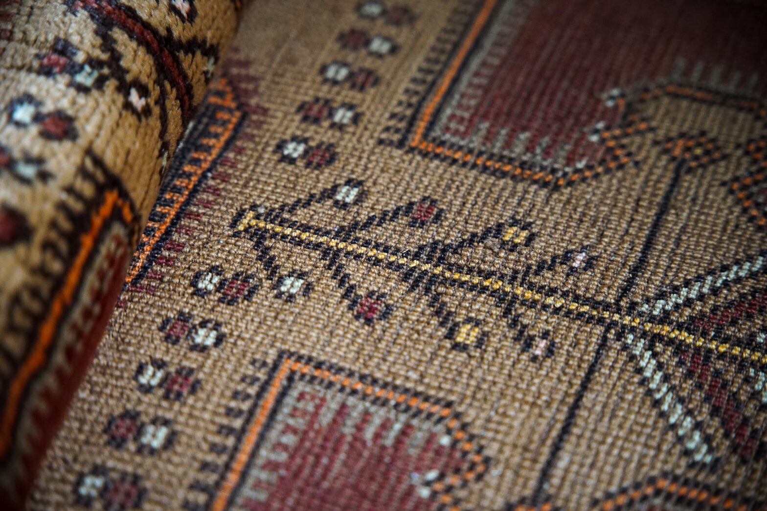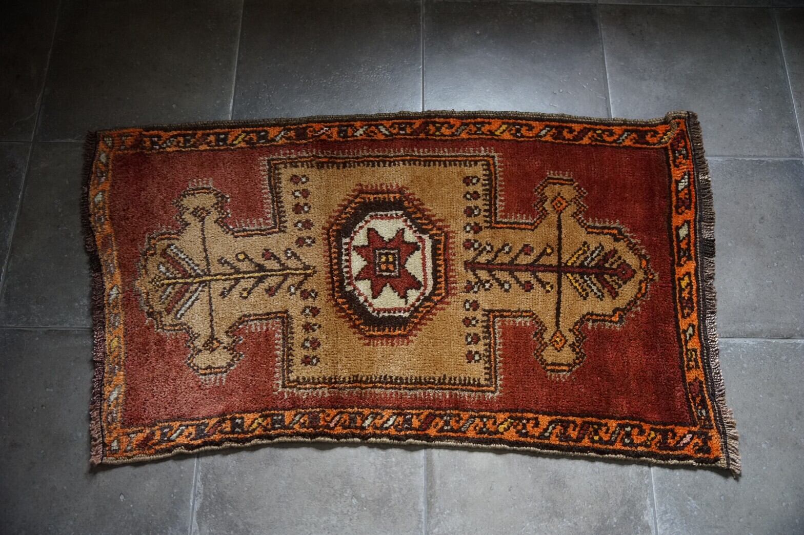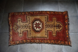 50年前に織られたラグ。暖色系(褪色した赤、オレンジ、ベージュ、アイボリー)のかわいい感じの色合いが部屋のインテリアに合わせやすいです。八角星がアクセントになっています。長すぎず短すぎずちょうどよいパイルは密度が詰まっていて滑らかで柔らかく、素足で踏みしめたくなる肌心地。光に当たるとわかる艶感が美しいです。こちらのラグは歪みが結構あるため、値段にも反映させて頂いております。手織りの素朴感を愛してくれる方へ。