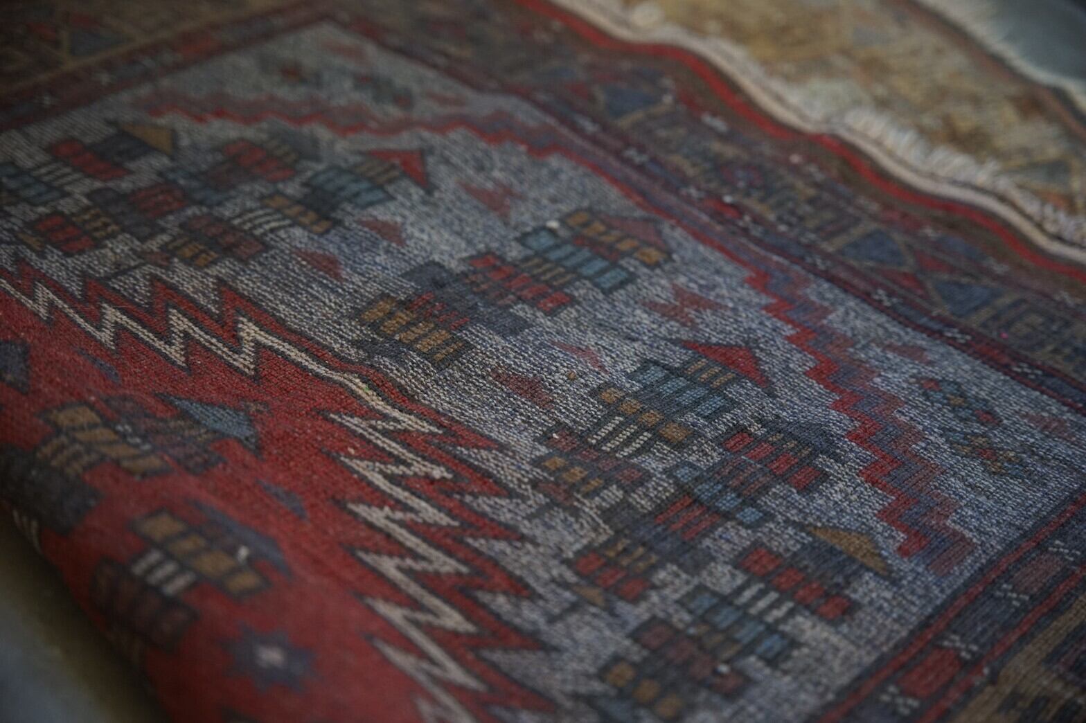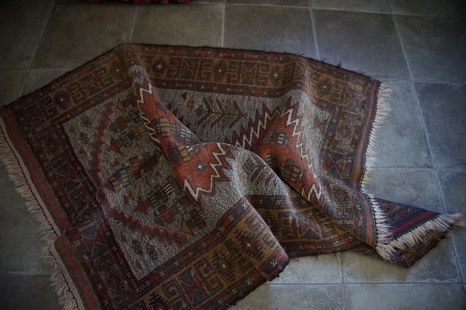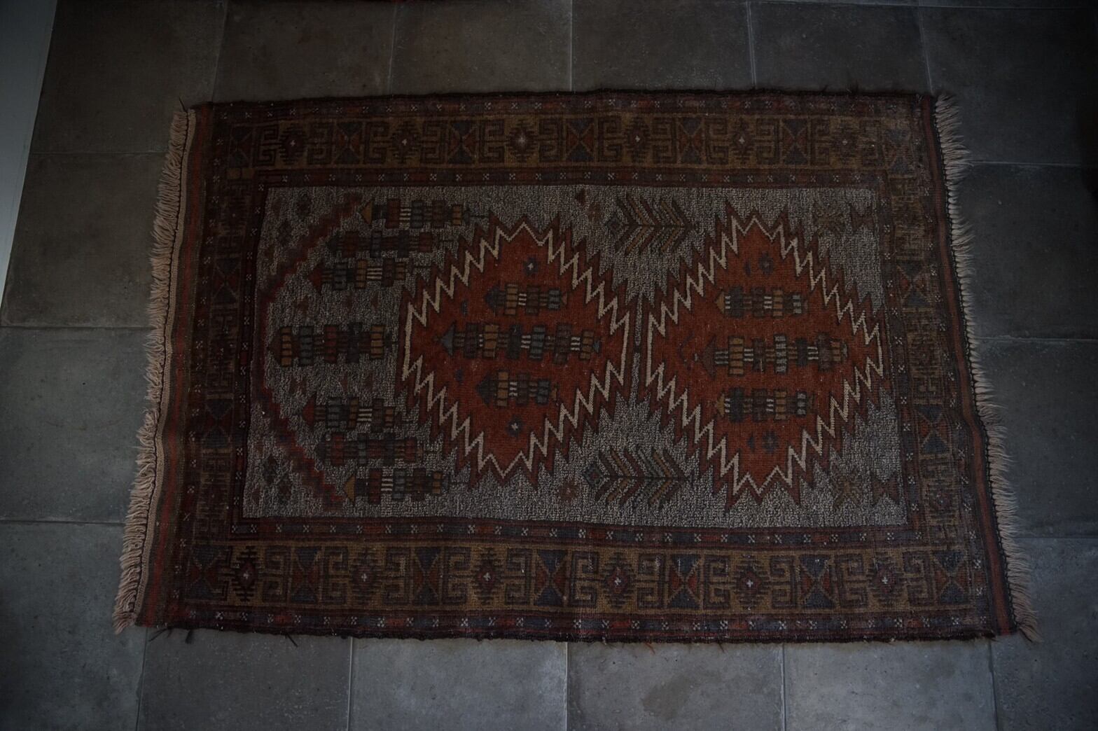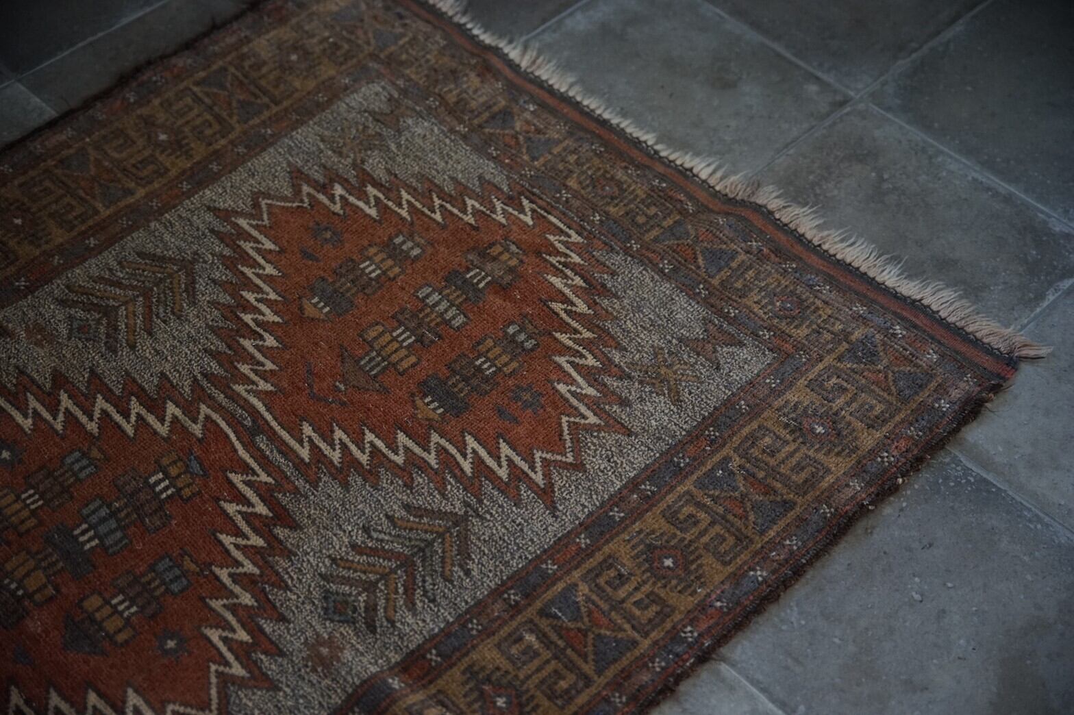 バルーチ族アフガニスタンのヘラト地方で作られたラグ。ブルーグレーを基調とした落ち着いた渋い色合いに朱色のメダリオン。周りには自然賛美を意味する生命の樹のモチーフもあり、豊作を願って織られたラグなのでしょう。きらびやかなラグよりも部屋に馴染む色合いのラグをお探しの方へ。玄関マットより少し大きいのでリビングに敷いたり、ベッドサイド、キッチンラグとしてオススメのサイズです。