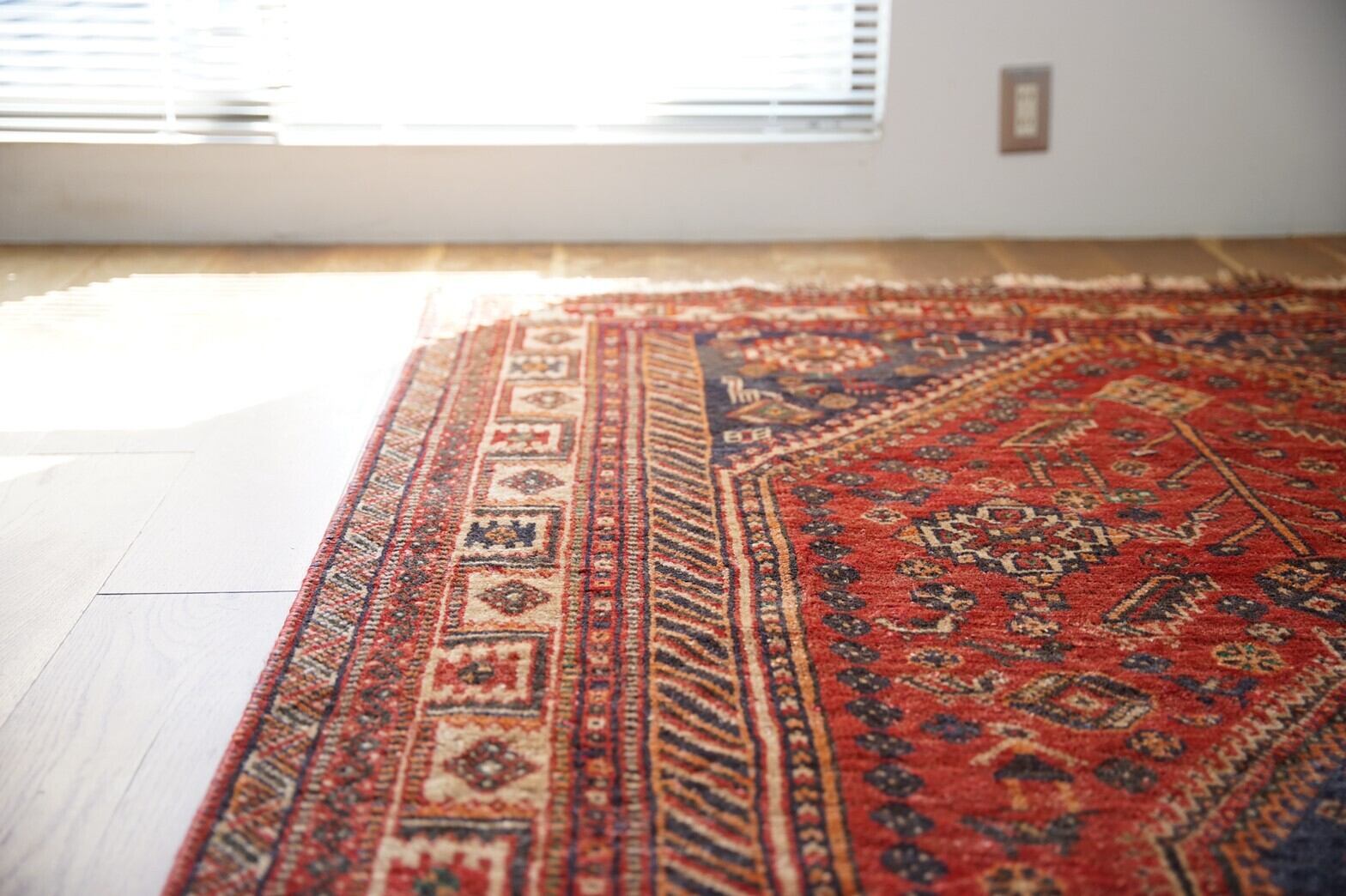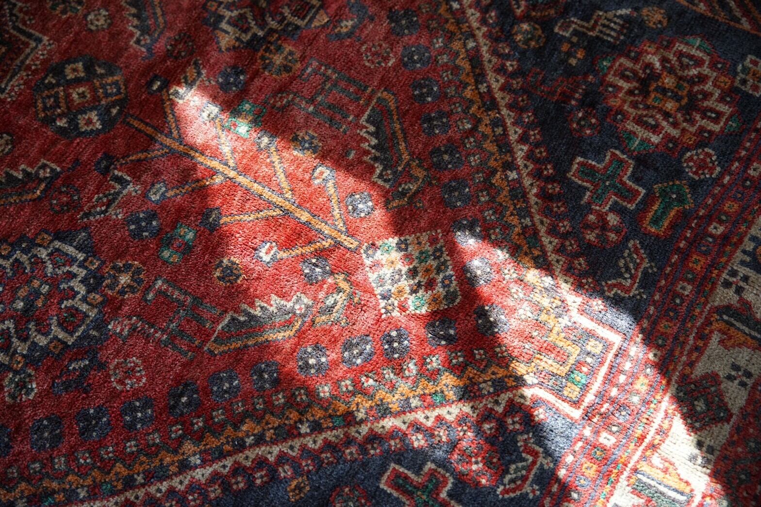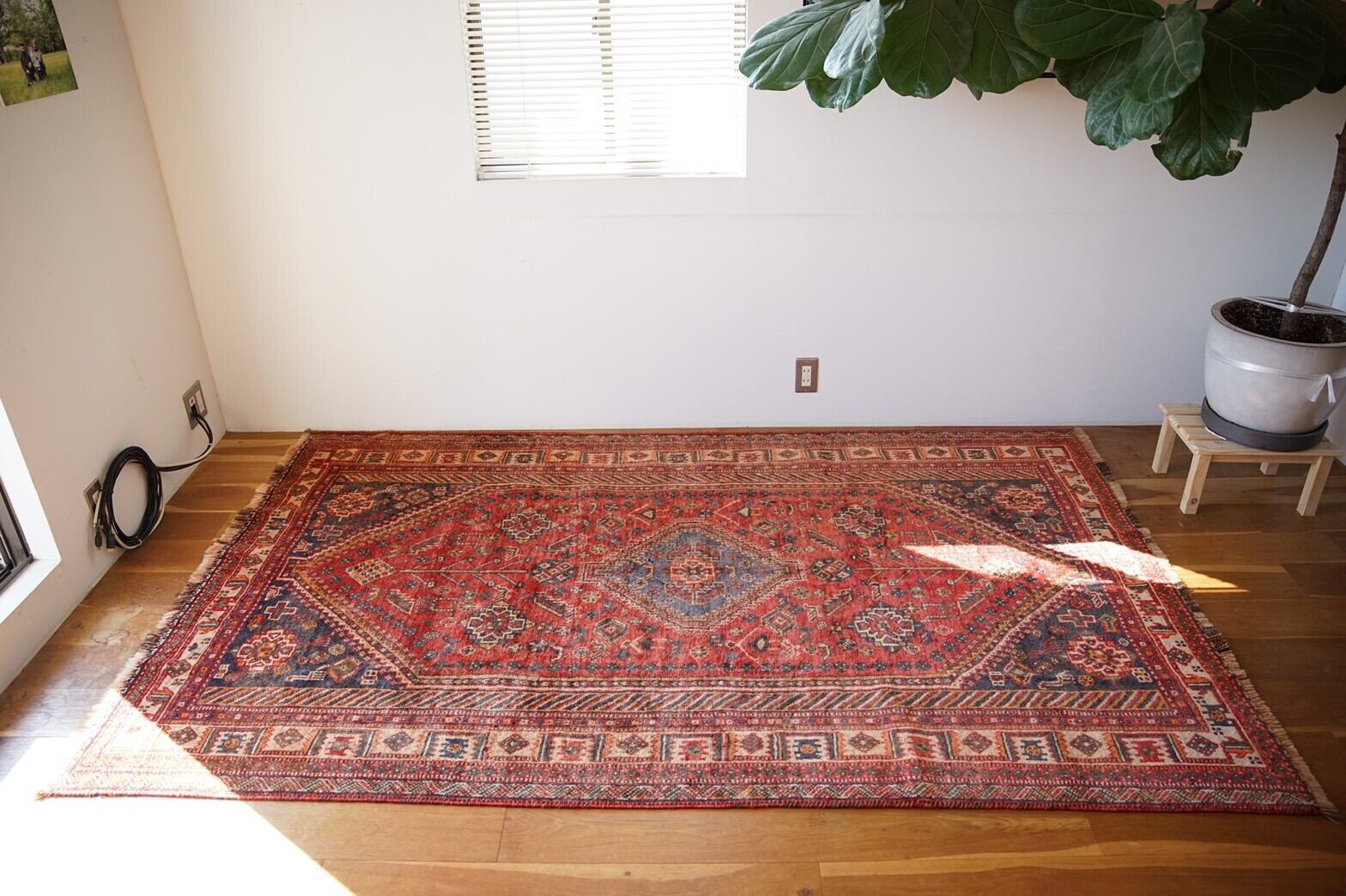「カシュガイ族」が織った、約50〜60年前のトライバルラグです。中央とコーナーにはカシュガイ族の伝統的なメダリオンが配され、鳥や花や子供などさまざまな伝統的な模様が織り込まれています。家族の健康を願い幸せを祈り自然への賛美などたくさんの思いが詰まっています。またこちらは新品デッドストックでとても良い状態を保っています。大きいサイズなので部屋の主役として、また広いリビングの仕切りとしても。離れてみるとかっこいいですが、近くで見ると色々なかわいい模様にときめくこと必至です。自然光に当てると神々しくキラキラ輝いて見える艶を感じてくれますか?