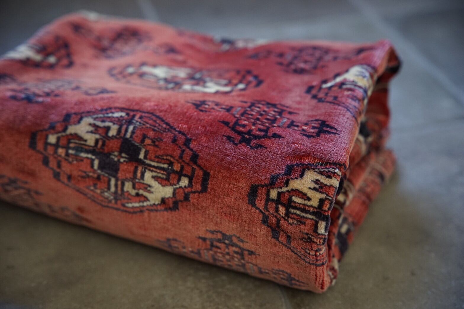 トルクメンラグはギュルと呼ばれる部族や家柄を示す紋章が記されており、フックのようなものは羊の角のモチーフです。羊は遊牧民にとって大切な家族であり財産。羊の角は男性の力やたくましさ、そして豊かさを象徴します。このラグの魅力は何と言っても絶妙な色合いとツヤ感、滑らかでビロードのような肌触り。ぜひ素足で乗ってみてほしいです。経年変化によるパイル抜けが多少ございますのでご理解頂ける方のみご購入ください。小さめサイズなので日本の住宅事情的には家のあらゆるシーン(キッチン、鏡の前、ペットのお気に入りの場所として)で使い勝手の良いラグです。