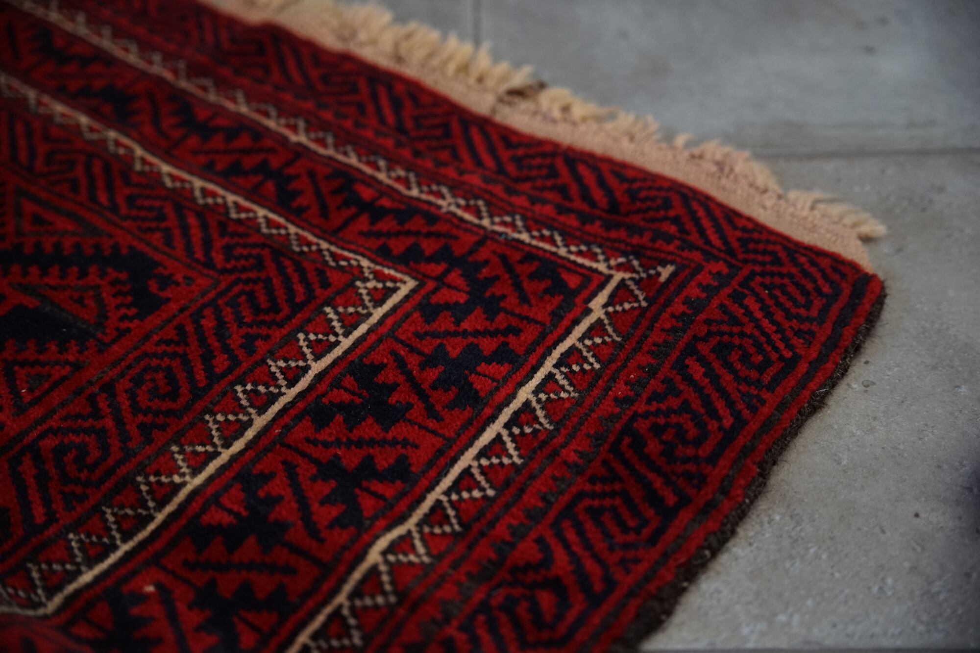 赤と濃紺ベースにアイボリーのラインがアクセントになっているスタンダードなバルーチ族のラグ。使われている色は少ないですがフローリングにも和室の畳にもどんなインテリアにも馴染んでくれる懐の深さを感じるラグ。パイルは少し短めで厚過ぎず柔らかく、肌触りは滑らか。何箇所かヴィンテージ特有の擦れや下糸の露出、手織り特有の歪みがあるため少しお安くしております。