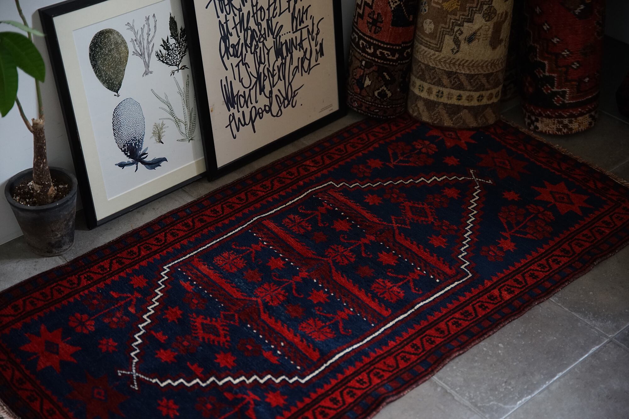 新品デッドストックの綺麗に保管されていたラグ。赤×濃紺のシンプルな色使いなのでインテリアに馴染みやすいです。色合いはシンプルですが、描かれている紋様は豊富で自然賛美を現す花や安定の象徴のゴボウ、幸せを願う星などラグの織手の想いを感じることができます。パイルは長すぎず短すぎずのちょうどいい滑らかな肌触り。玄関やベッドサイド、キャンプ、キッチンラグにと使い勝手がいいサイズ感です。