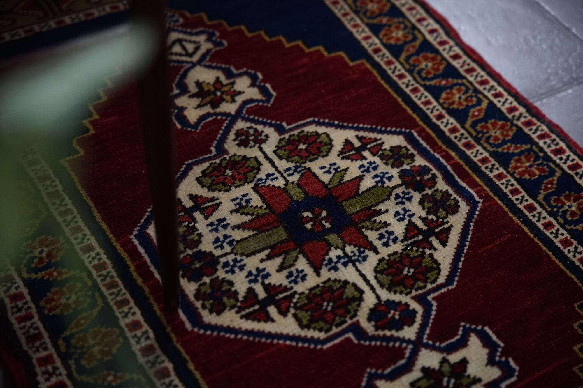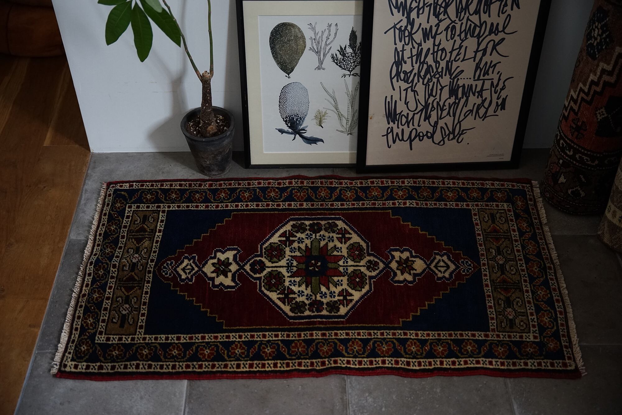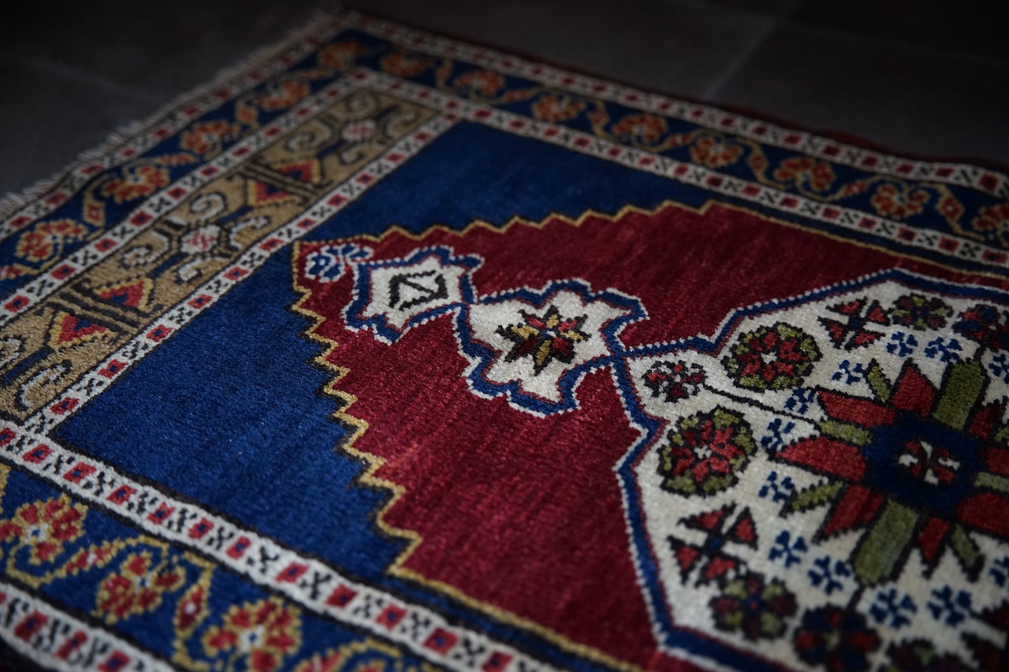ちょうどいいサイズ感と真ん中のメダリオンがポイント。インディゴブルーの部分は艶もありとても綺麗で見とれてしまいます。ボーダー部分にはたくさんの花が描かれているので可愛らしさも。フカフカ感のあるパイルのラグで素足でも気持ちいいです。男の人のインテリアにも合う色合いと雰囲気はクリスマスプレゼントにもおすすめです♪玄関やベッドサイド、キャンプ、キッチンラグにと使い勝手がいいサイズ感です。