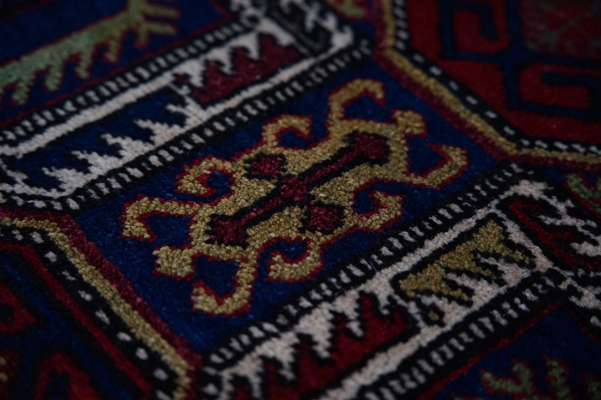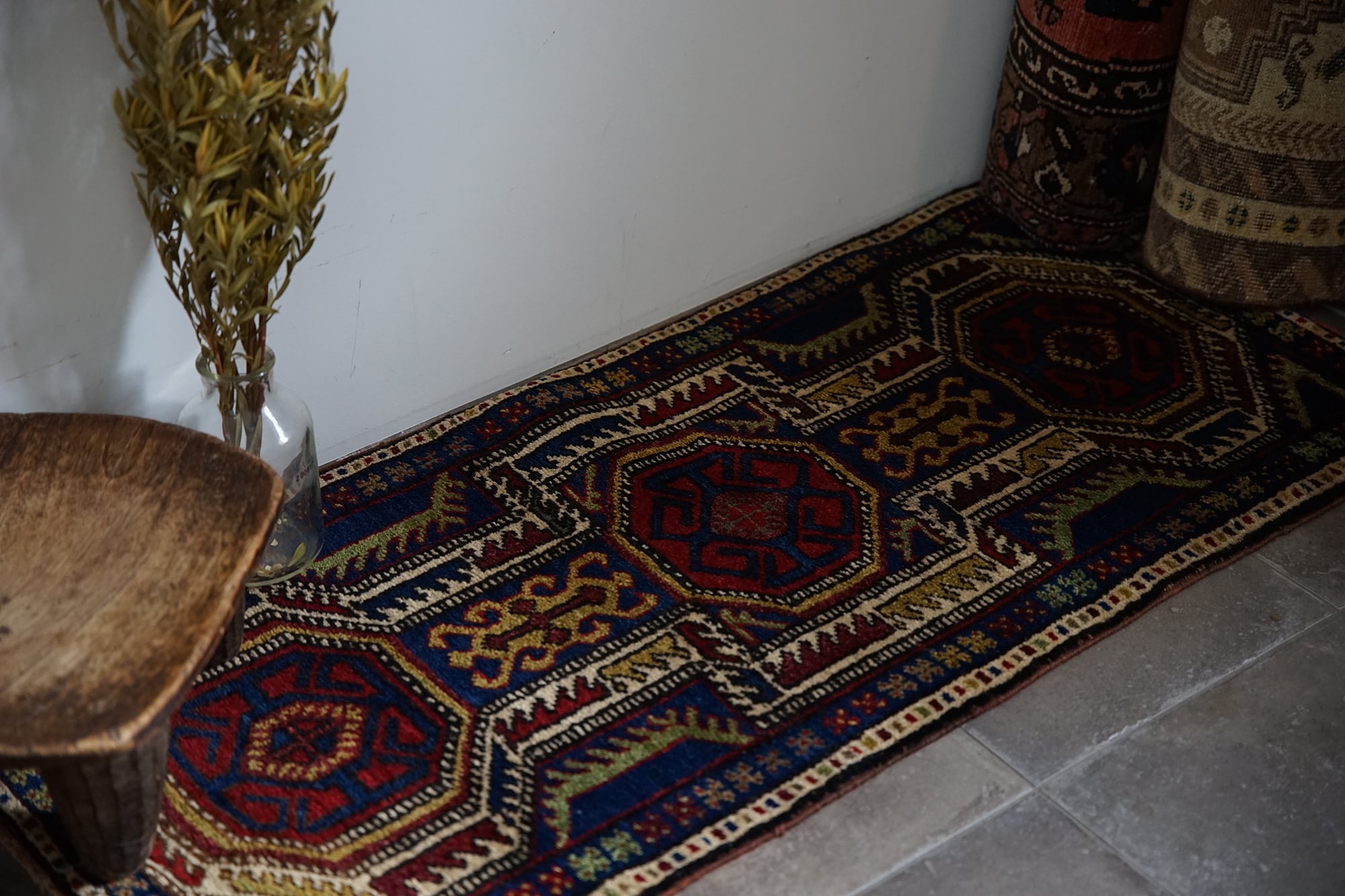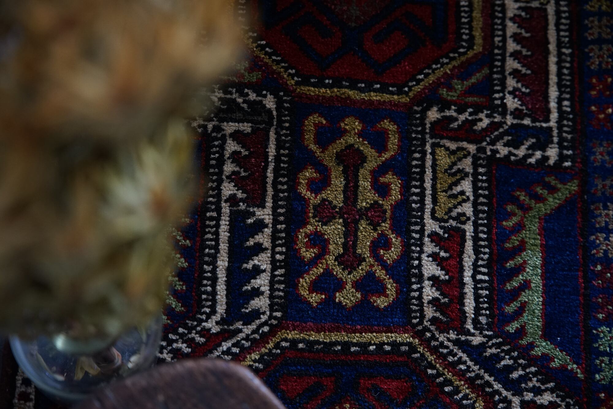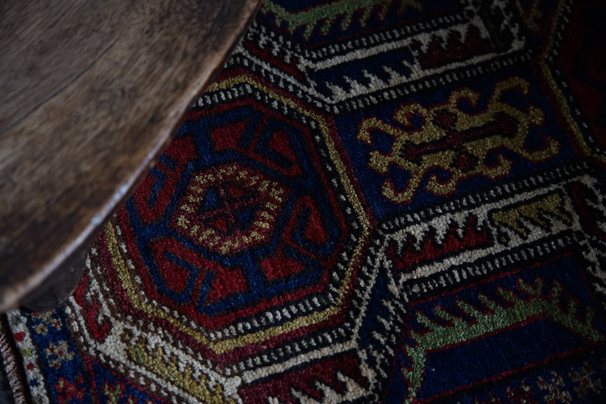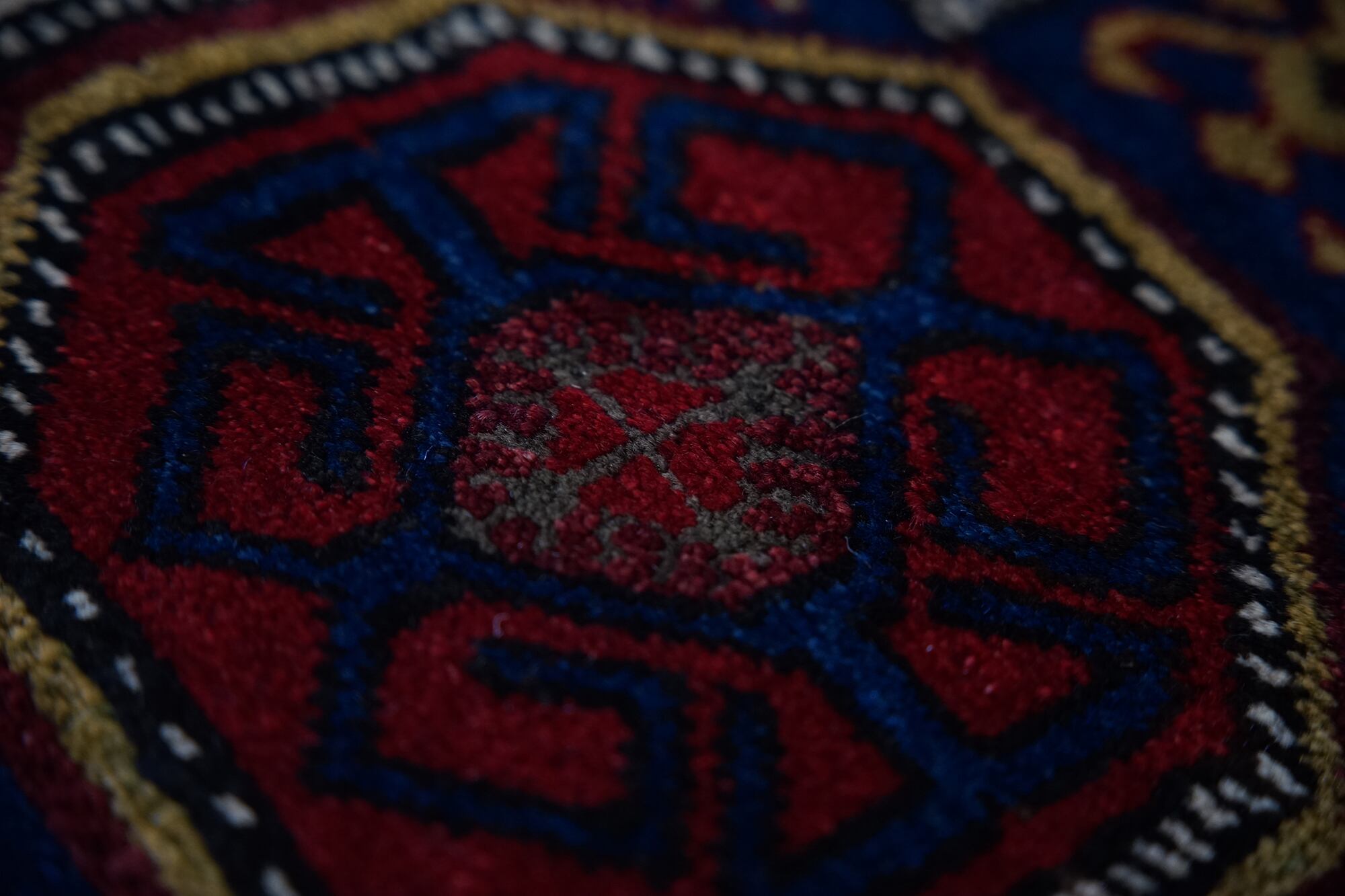 デザインは無骨ですが、インディゴブルーをメインに様々な色使いがかわいらしさも感じるラグ。3つ並んだ紋様は「チボユヌズ」と云われ雄羊の角を現します。男らしさや勇壮さ、力強さの象徴。ラグは嫁入り道具として持たせることが多く、未来のだんな様が力強い人でありますようにとの願いの込められているようです。床の冷たさを通さない少し厚手で玄関やベッドサイド、キッチン、キャンプ、姿見の前にと使い勝手がいいサイズ感です。