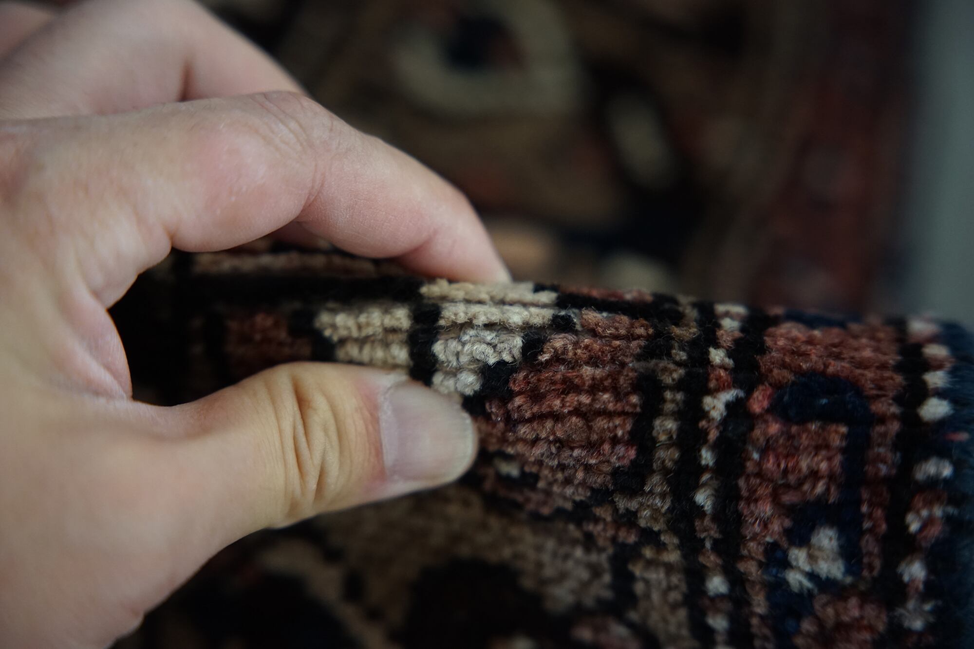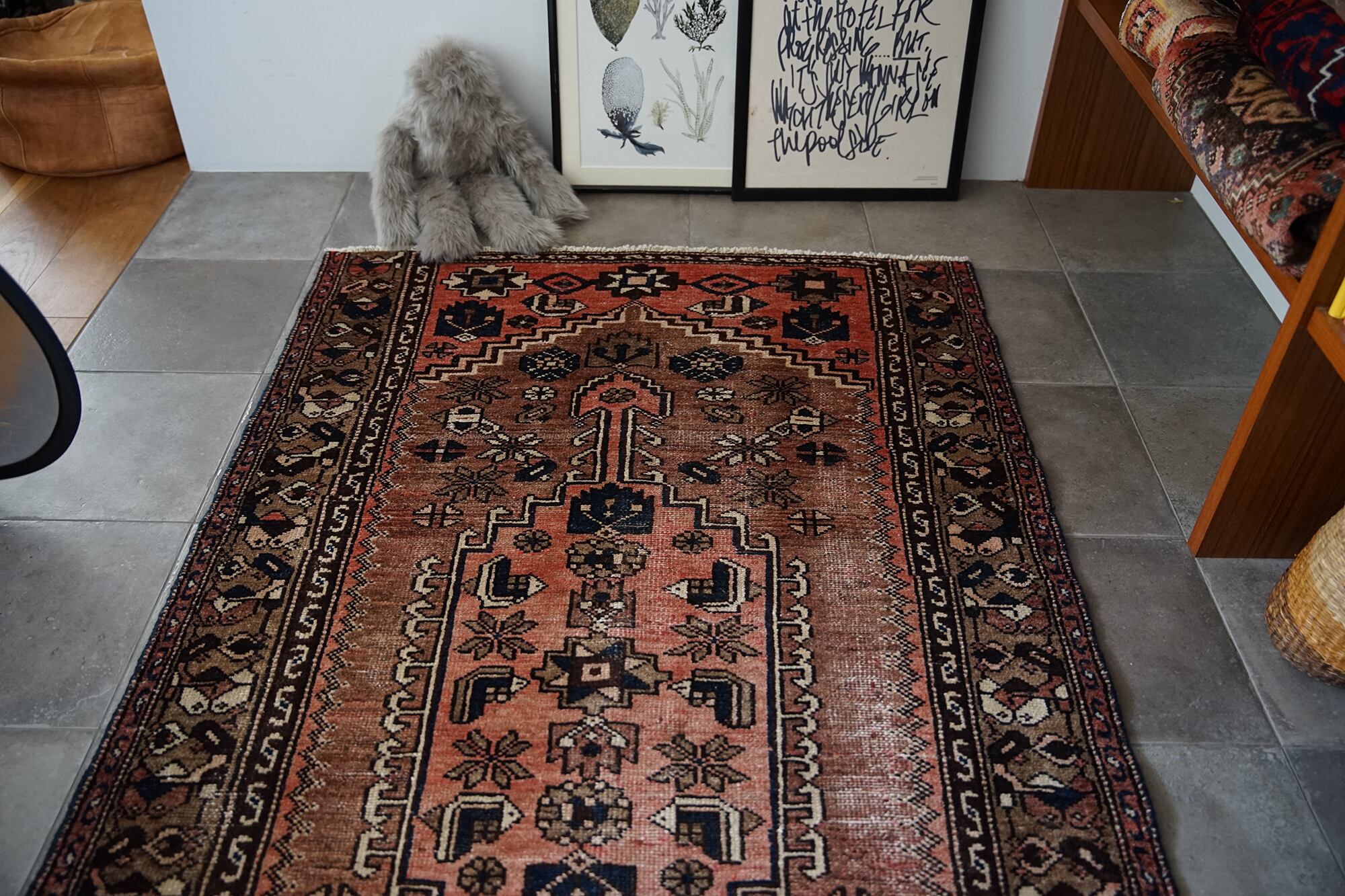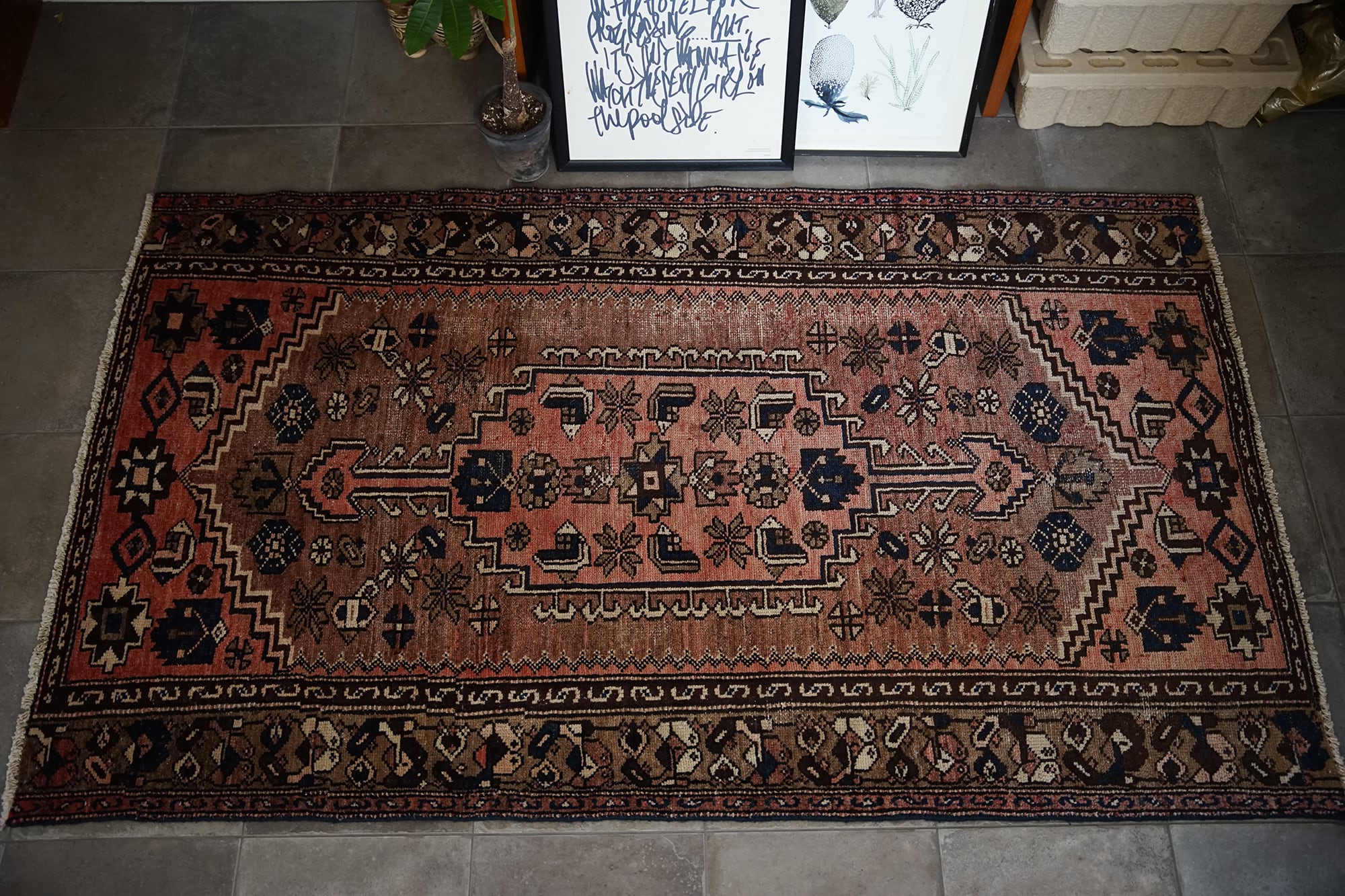 ブラウンよりのピンクはヴィンテージならではの褪色具合がとてもかっこいいラグ。クラシカルな雰囲気と細かい紋様がたくさん散りばめられています。厚みはないのですが、チクチク感は全く無く、踏みならされたラグは滑らかさを感じます。セレクトショップや古着屋さんにありそうな雰囲気で一気にお部屋のオシャレ度がアップしそうです♪ソファの前やリビング、書斎、ベッドサイドに置くのにちょうど良いサイズです。