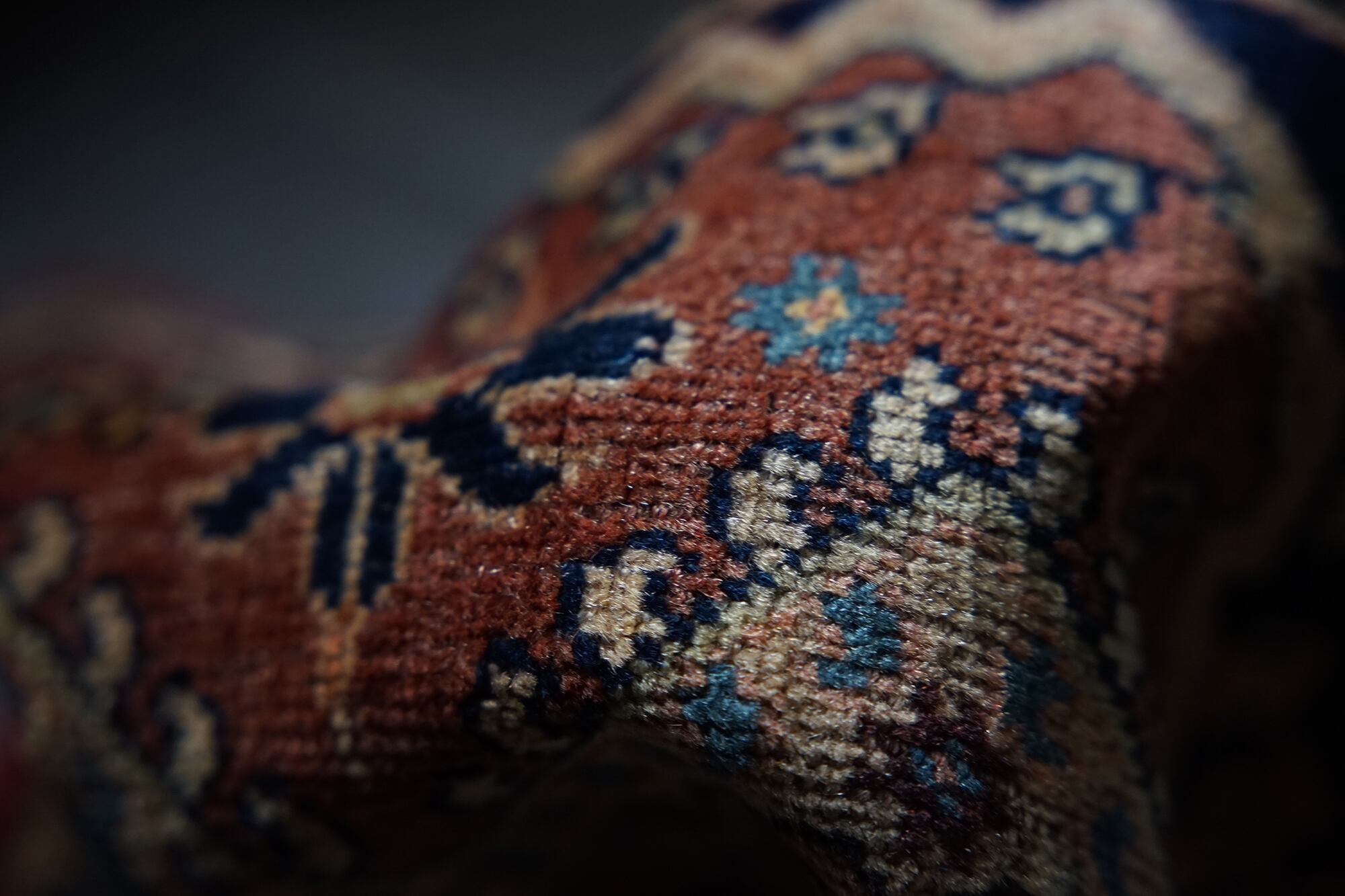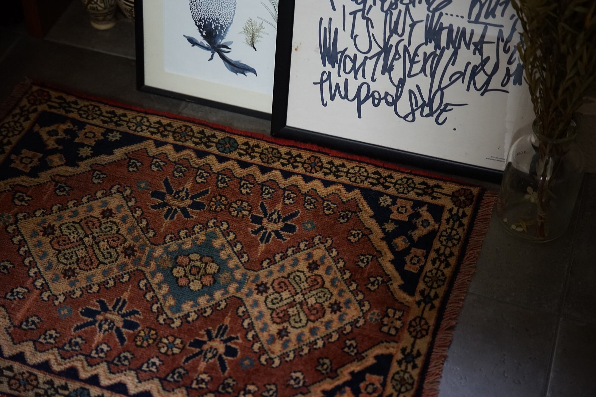 まんなかに描かれた菱形のメダリオンとイエローベースの深みのある渋い色味がヴィンテージ好きの心をくすぐるラグ。メダリオンの中にはエンドレスノットといわれる吉祥紋様。パイルは短めで滑らかな手触り。ボーダー部分は花反復的模様のミナハニ模様が描かれています。薄手なので軽くて簡単に持ち運びができ、お部屋の色んなとことで使ったりキャンプでの使用もおすすめです。手織りならではの歪みが多少ございますので、そこを含めて手織りの素朴感を愛してくれる方へ。