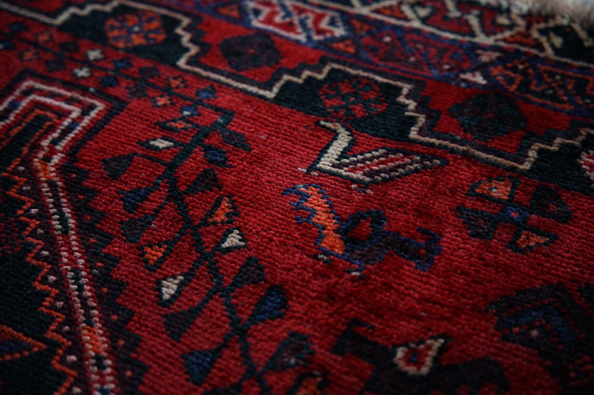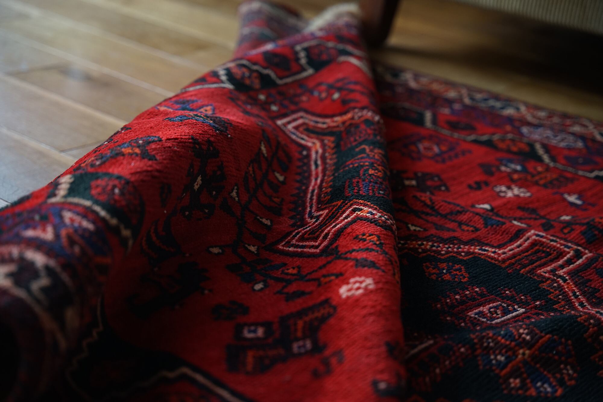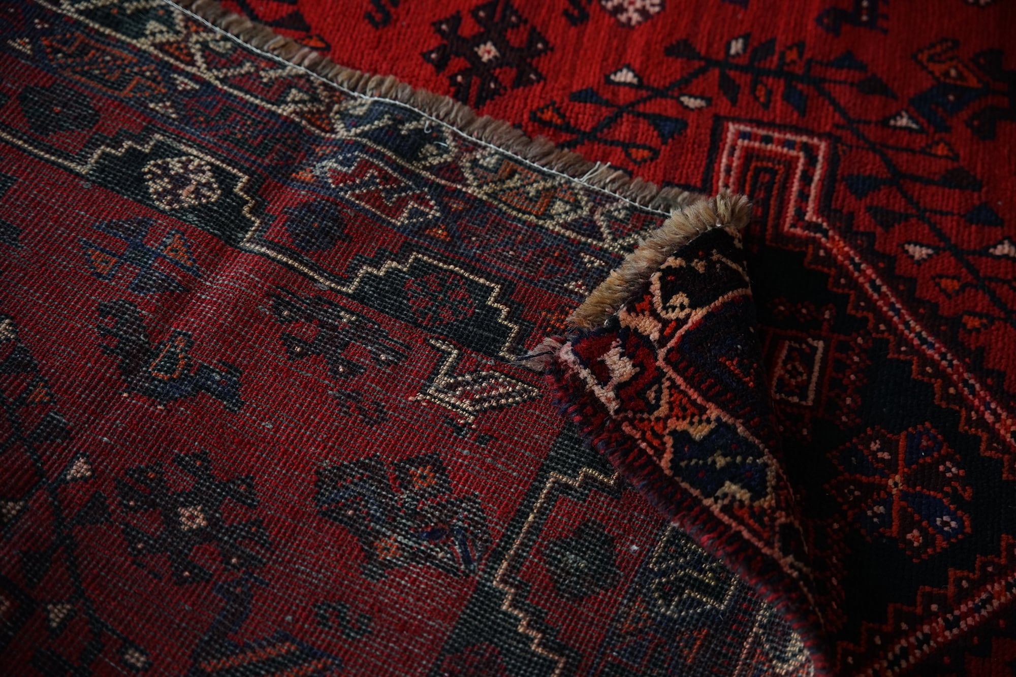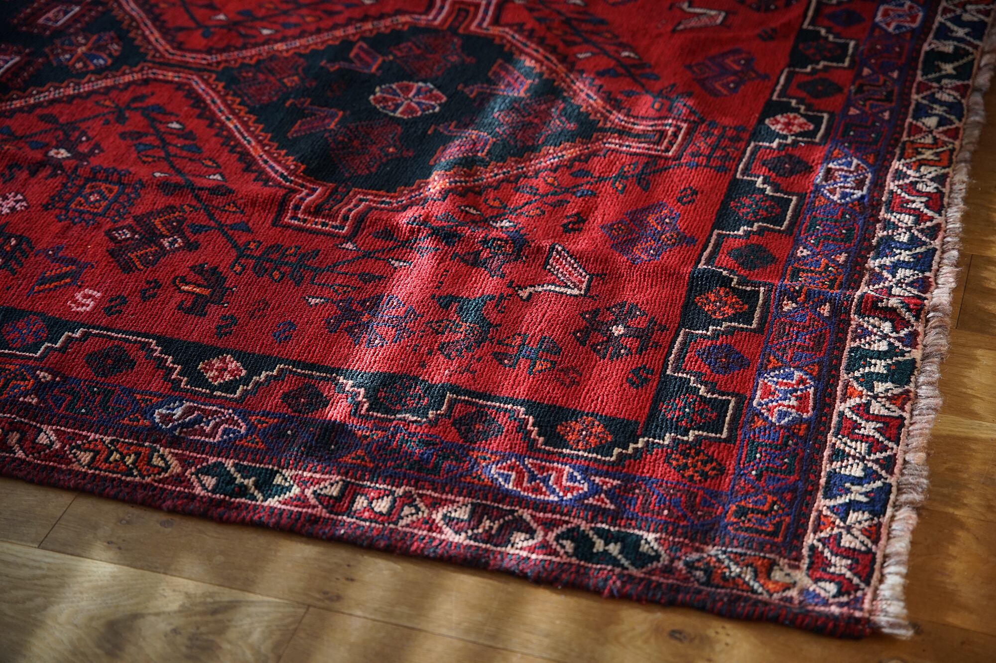 カシュガイ族によるトライバルラグです。綺麗なラズベリーの赤いフィールドの中央には3つのメダリオンが配され、その周りには様々な鳥のモチーフや生命の樹などジオメトリックモチーフが描かれており、自然への感謝を現しています。新品デッドストックのとても綺麗な状態です。パイルはフカフカすべすべで思わず寝転がりたくなります。大きめサイズなのでリビングやダイニングのメインに、ソファの前に、書斎に、また和室にもオススメです。