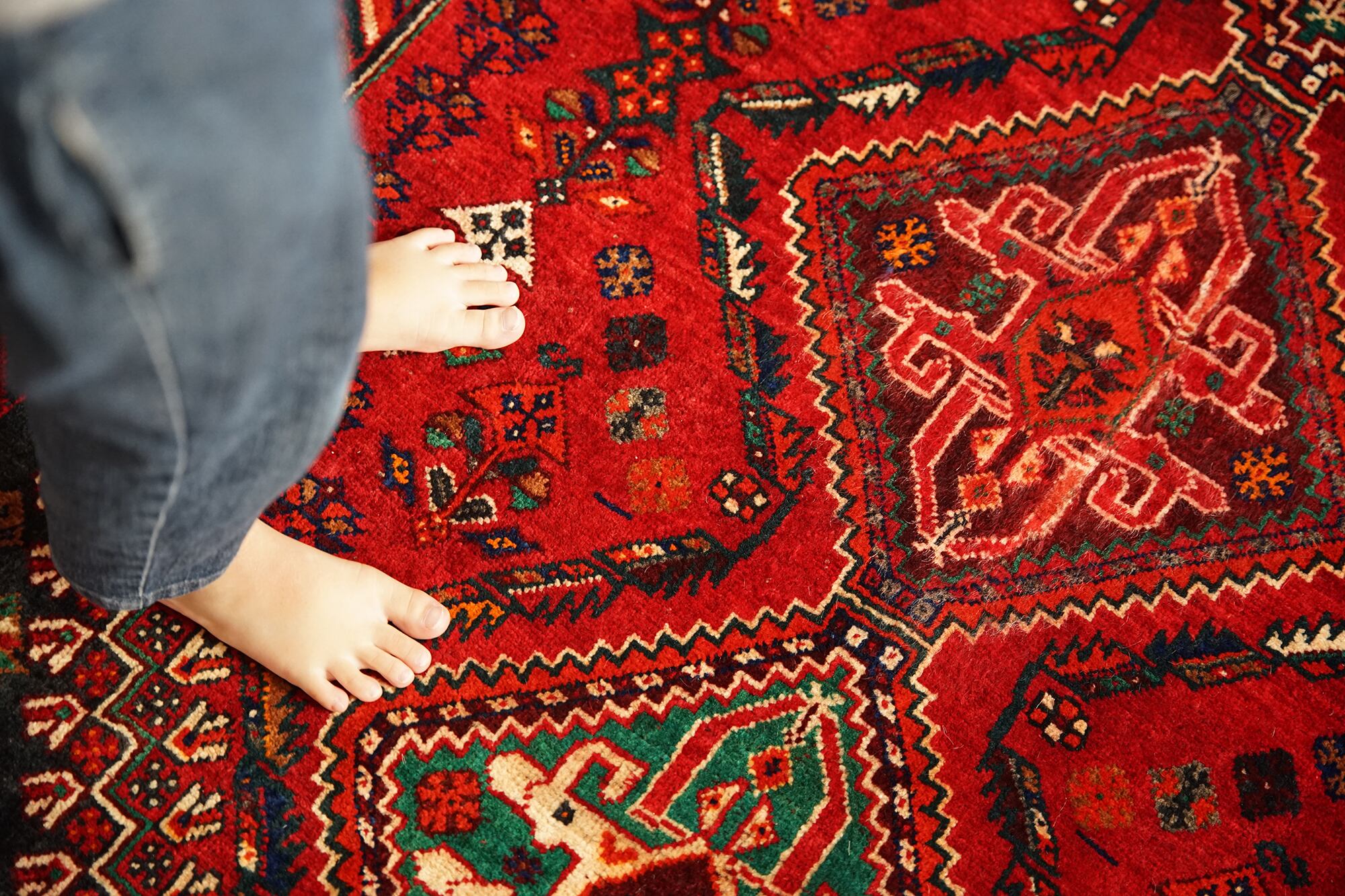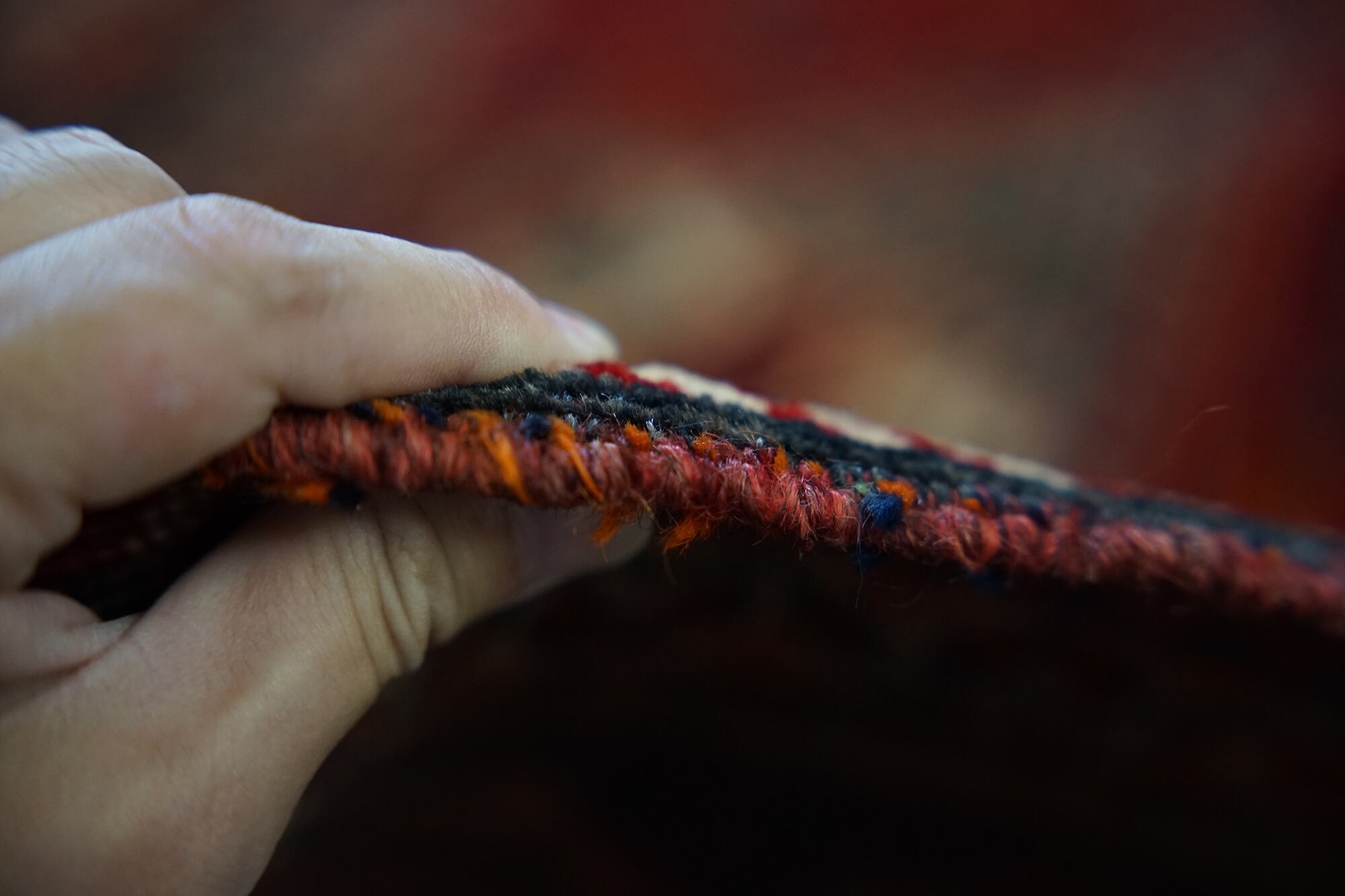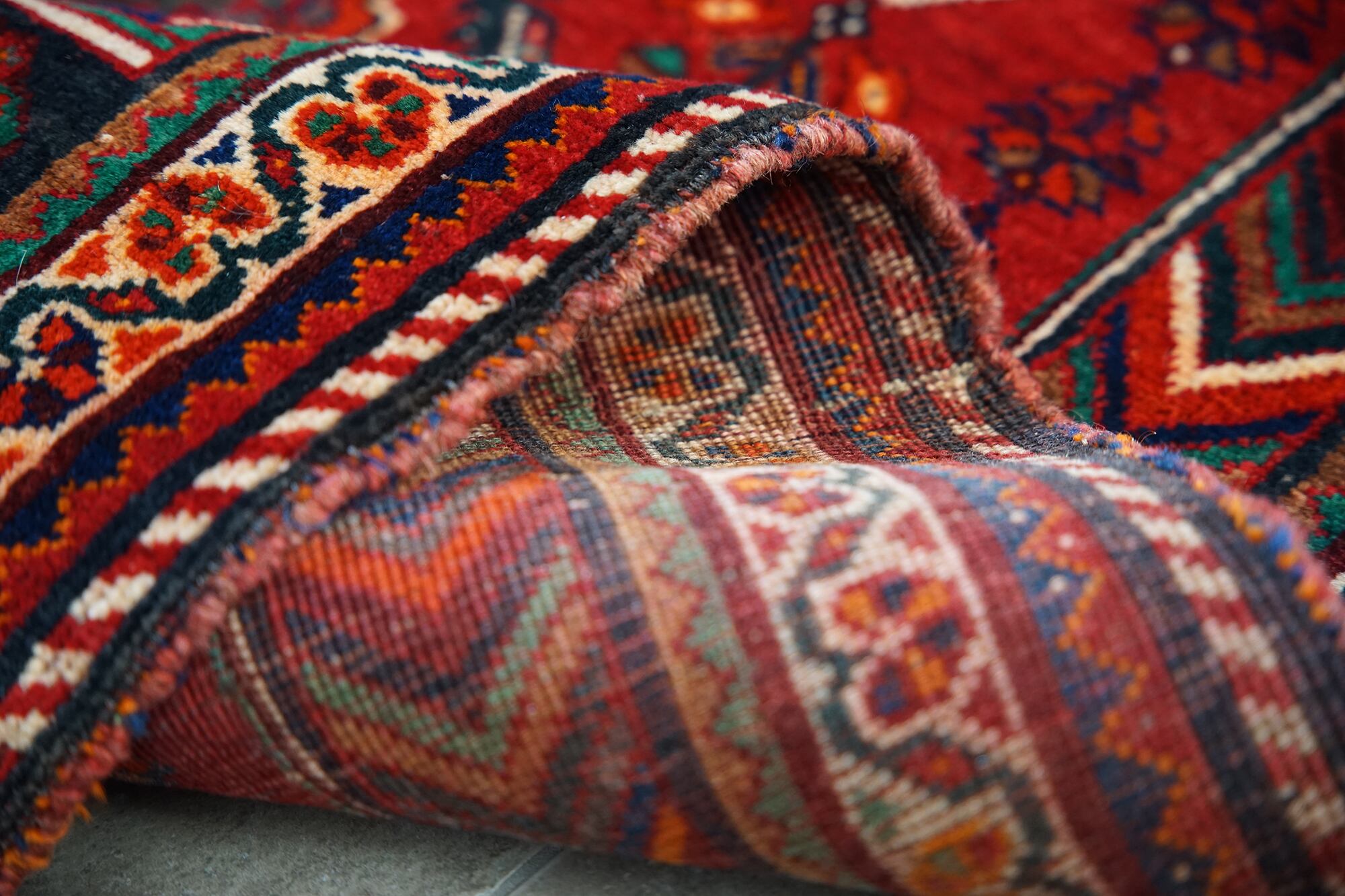 カシュガイ族が織ったトライバルラグ。真ん中に3つ並んだ紋様は「コチボユヌズ」と云われ雄羊の角を現します。男らしさや勇壮さ、力強さの象徴。綺麗な緑がアクセントになっており、他にもカラフルな色彩が見ているだけで幸せな気持ちになります。パイルは密度が詰まっており、フカフカの踏み心地でギャッベのような厚みで床の冷たさは全く通しません。