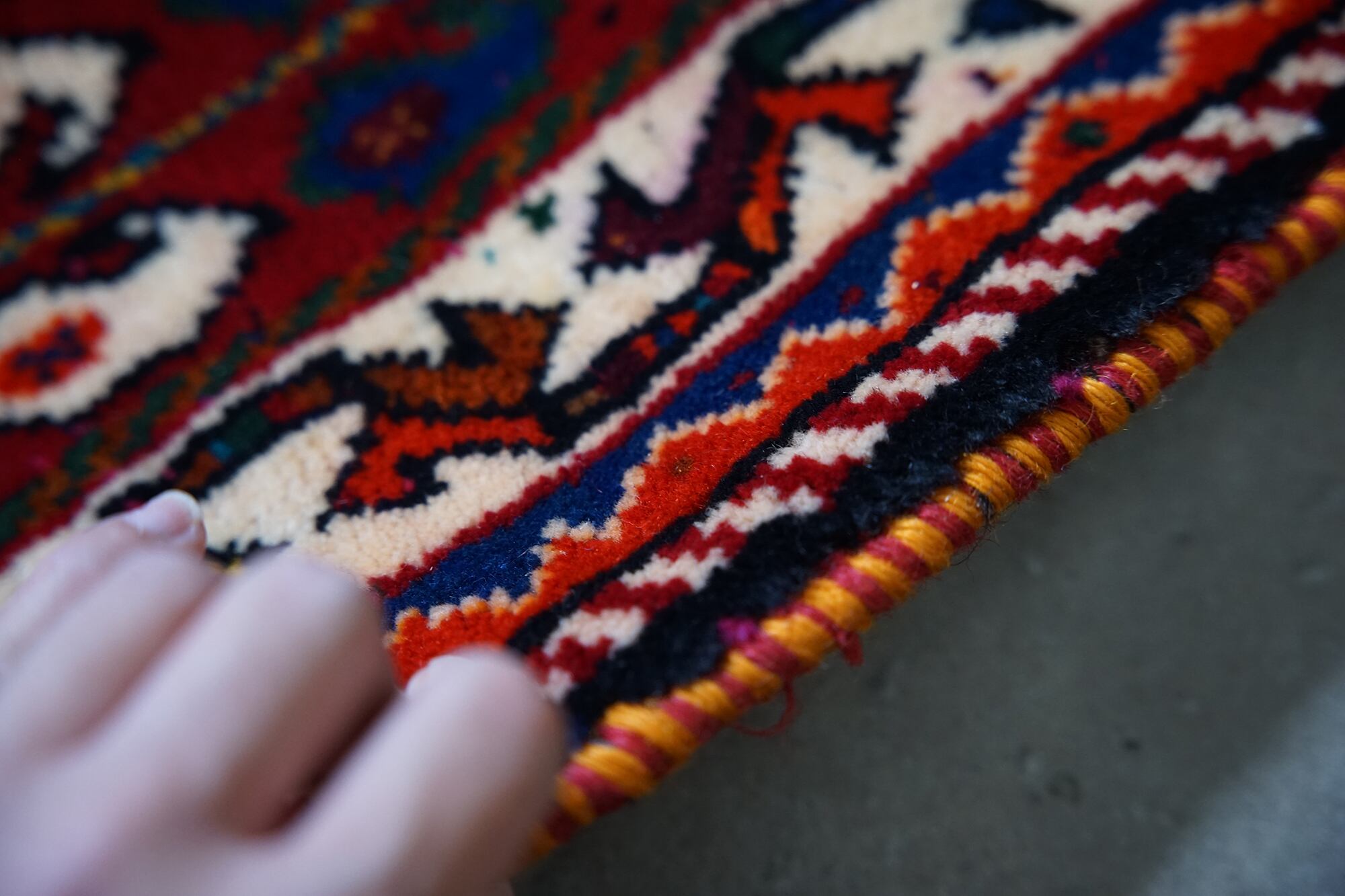 思わず「かわいい」と口に出してしまうほどの破壊力のある可愛さ。まずはメダリオンの鮮やかな青。ラグ全体に数え切れないくらいたくさんのモチーフがカラフルで鮮やかに描かれており、まさに宝石箱をひっくり返したような特別感のあるラグ。贅沢過ぎますが、子供部屋に敷いたらめちゃくちゃかわいいのでは。また、新品デッドストックとなっておりとても綺麗な状態です。パイルは密度が詰まっていてすべすべ。ギャッベのようでとてもあったかいです。床の冷たさは全く通しません。ソファの前やリビング、書斎、ベッドサイドに置くのにちょうど良いサイズです。