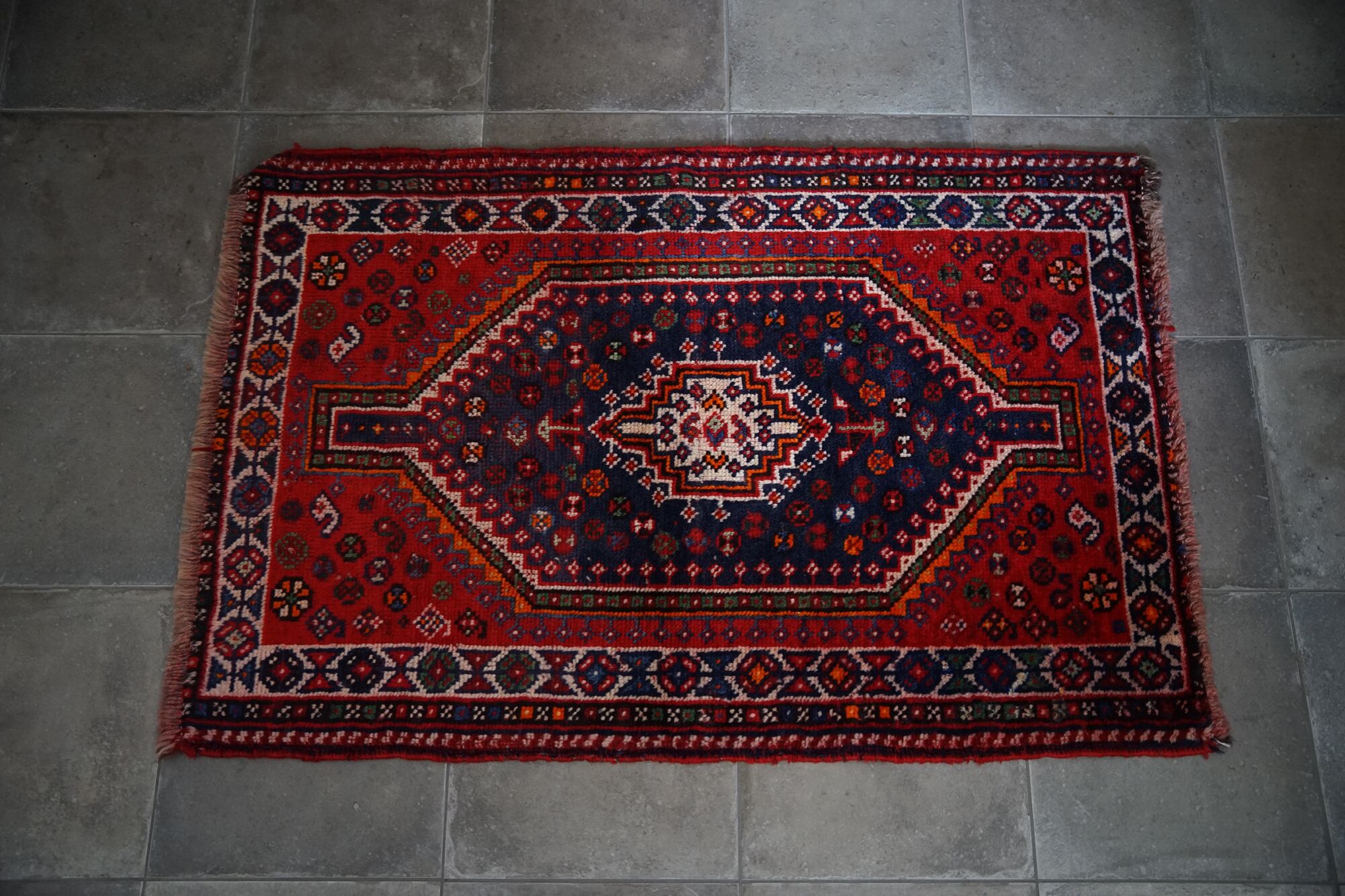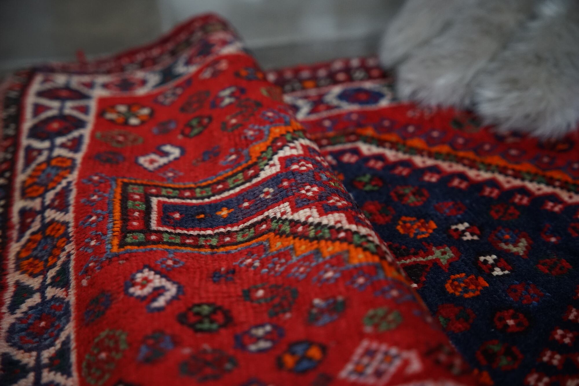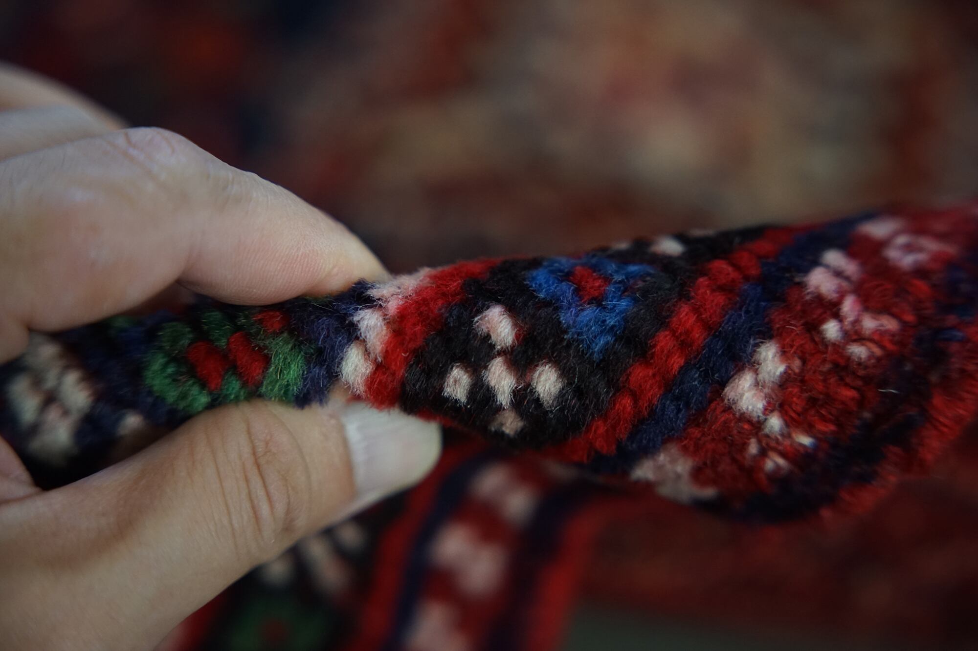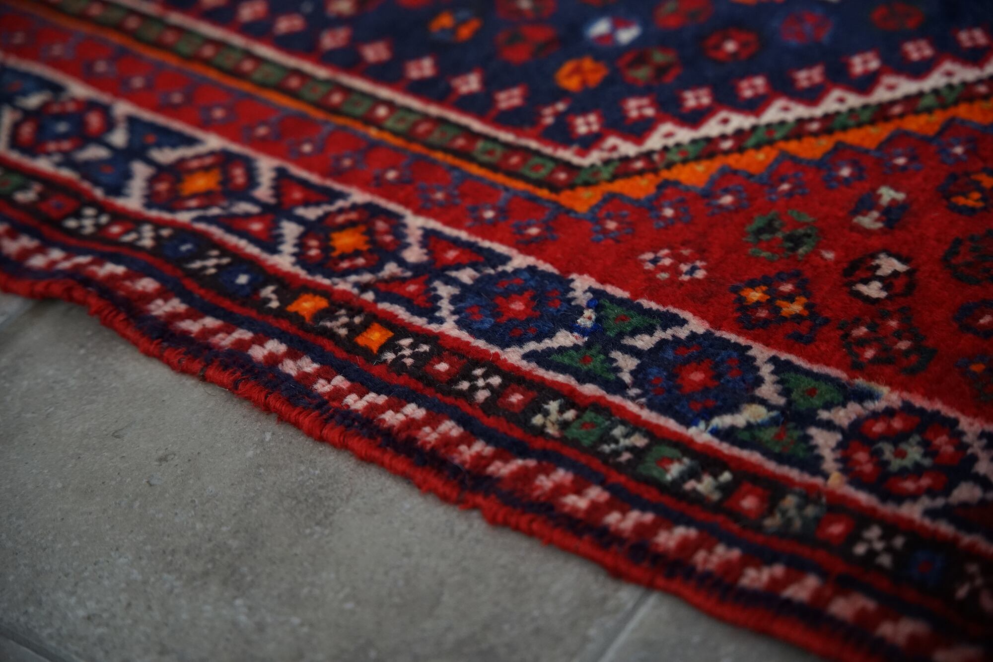 真ん中のネイビーのメダリオンを中心に全体に敷き詰められた大小さまざまな花は自然への感謝の気持ちが表れています。ボーダー部分はチロリアンテープのようでとても可愛らしいです。パイルは長すぎず短すぎずちょうど良く、柔らかさと滑らかさを保ったままのグッドコンデイションです。日本の住宅事情的には家のあらゆるシーン(キッチン、鏡の前、ペットのお気に入りの場所として)で使い勝手の良いラグです。