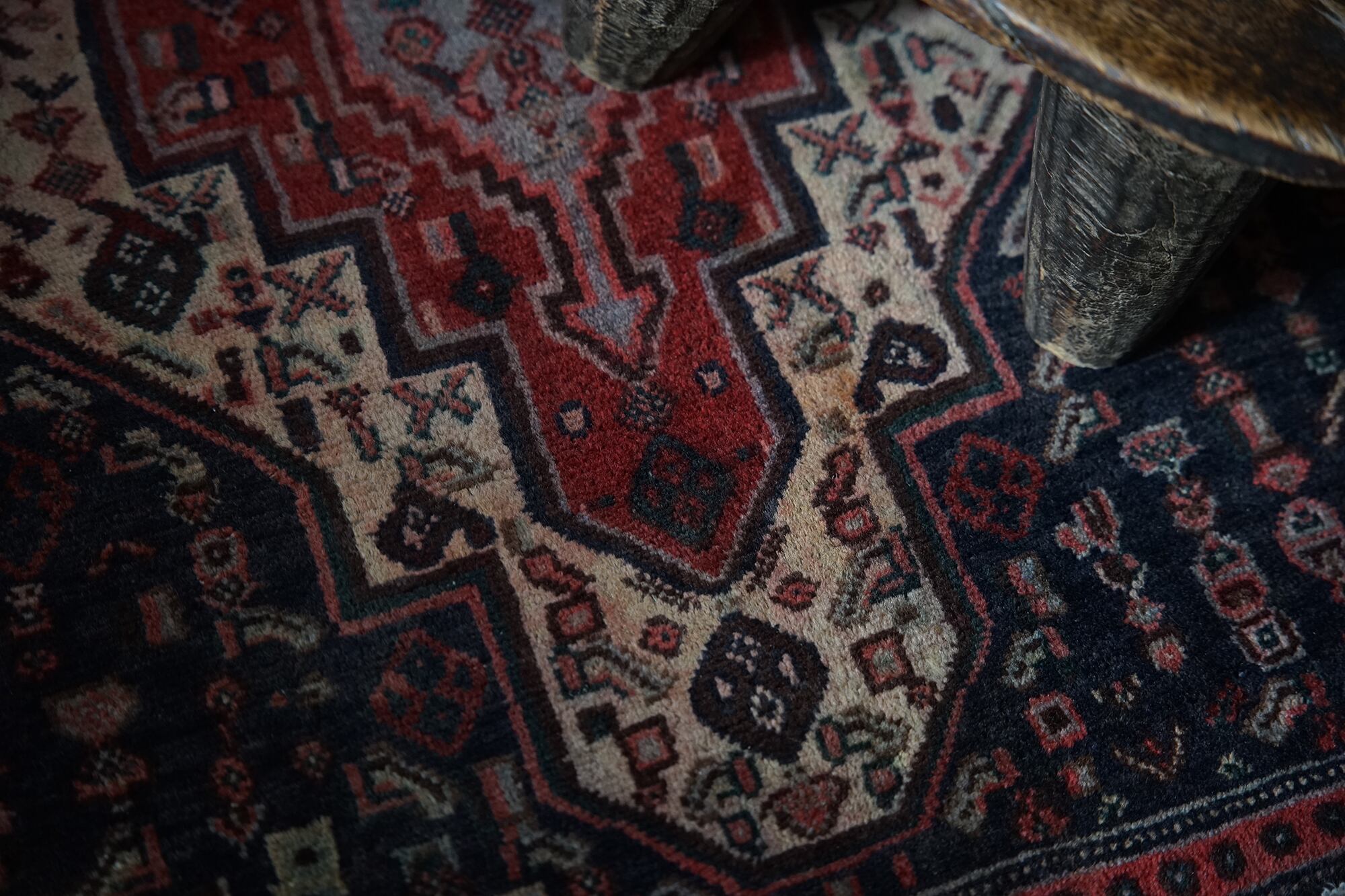 全体的に渋めの色合いがめずらしいとてもかっこいいラグです。真ん中の夫婦や家族の絆の象徴である足かせのモチーフの褪色したブルーグレーが美しいです。個人的に植物との相性がとても良いと思うので、おうち時間で増えた植物ラバーの方にはぜひお気に入りの植物の近くに置いて欲しいです。パイルは短めですべすべの肌触りなのでペットを飼っている方にもおすすめです。玄関やベッドサイド、姿見の前にと使い勝手がいいサイズ感です。