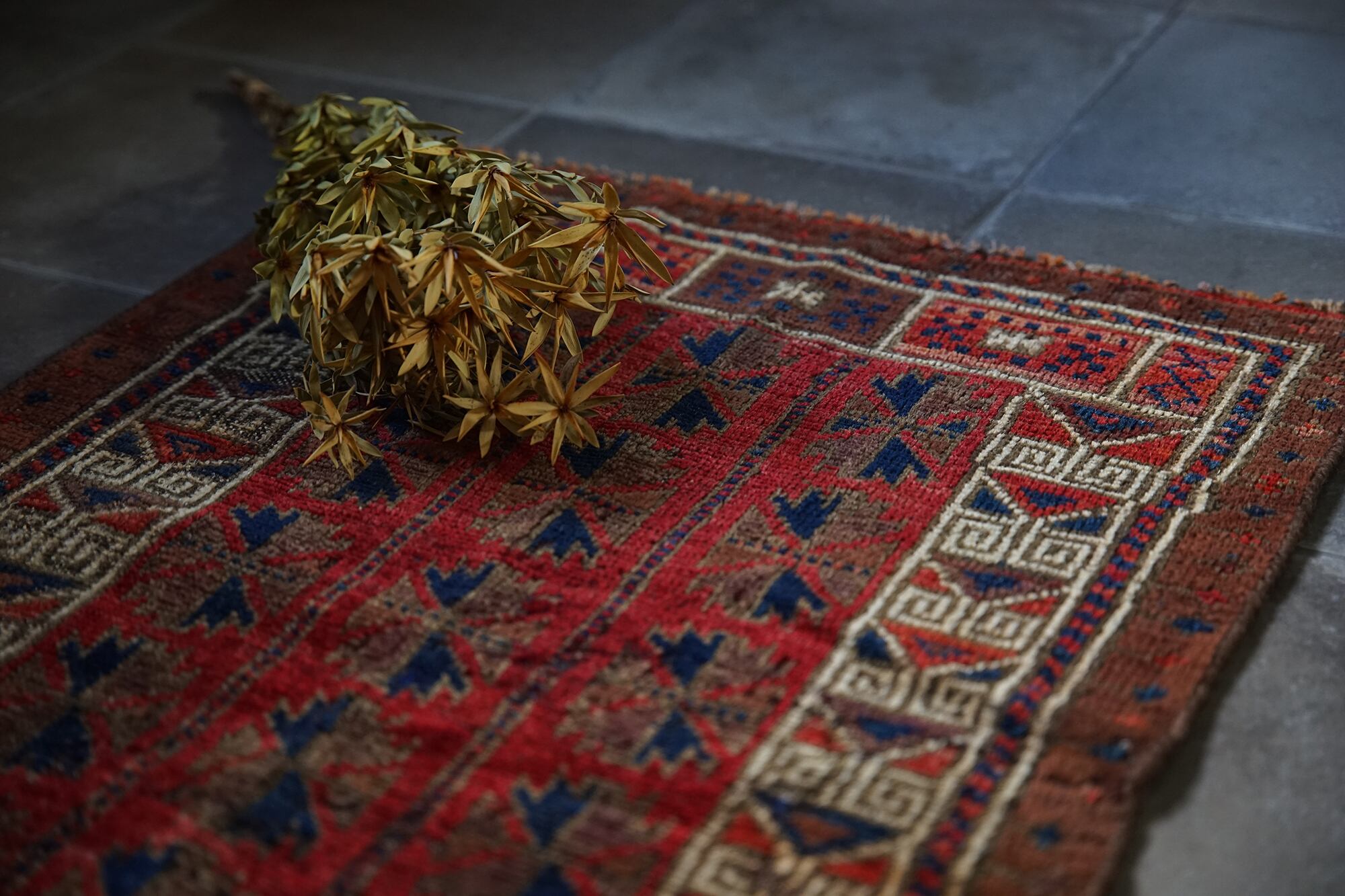 お問い合わせの多いブラウンバルーチ。チナールと呼ばれるバルーチではスタンダードな葉っぱのモチーフが並ぶプレイヤーラグです。赤よりの温かみのあるブラウンなので雰囲気は柔らか。肌触りも使い込まれたクタッと感がヴィンテージ好きにはたまりません。小さめサイズなので日本の住宅事情的には家のあらゆるシーン(キッチン、鏡の前、ペットのお気に入りの場所として)で使い勝手の良いラグです。