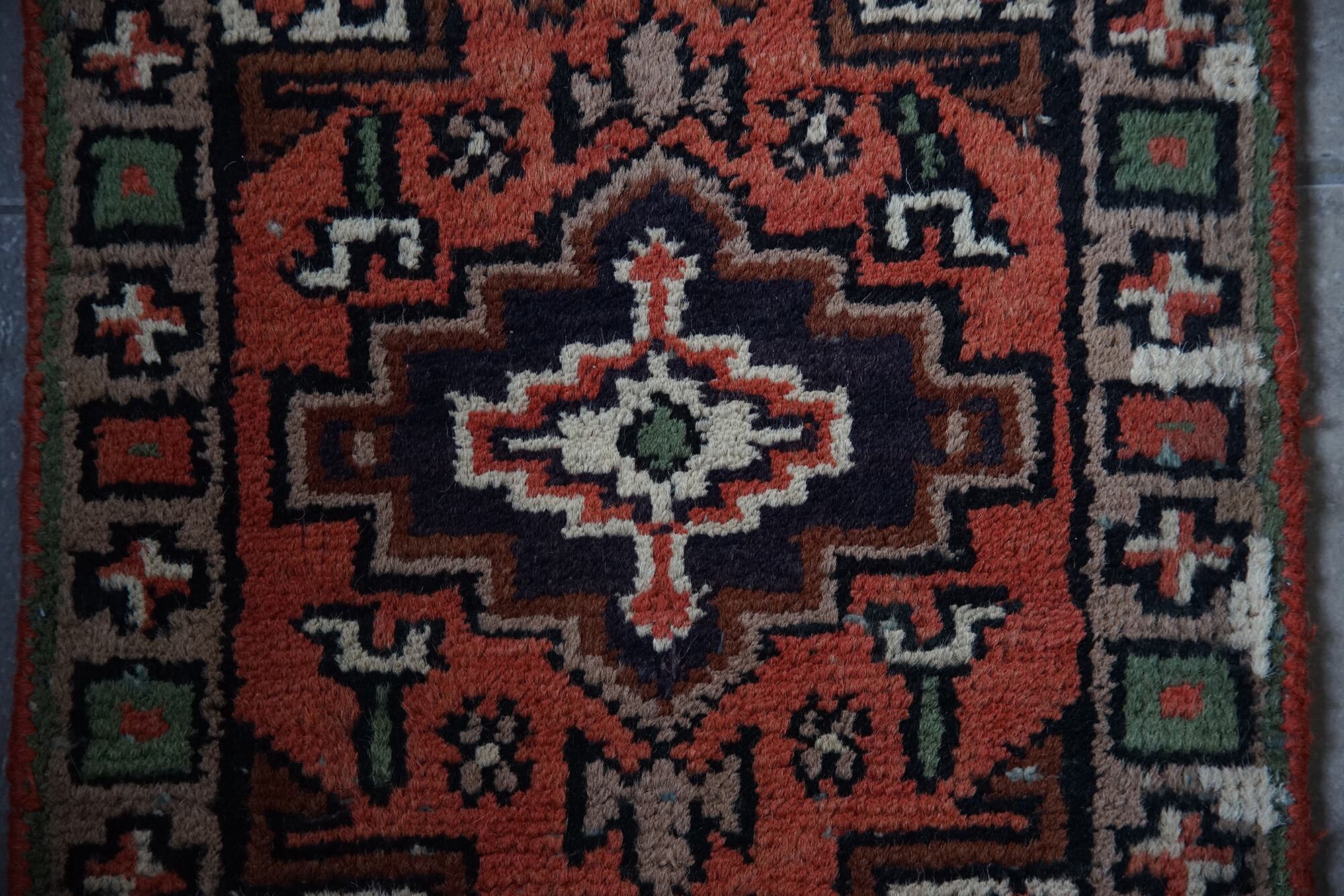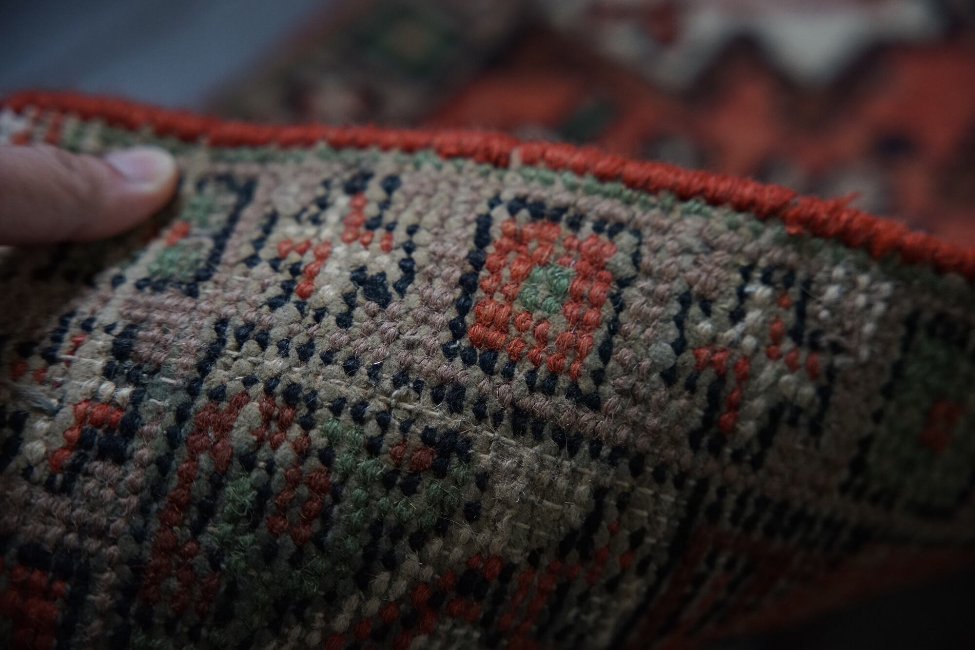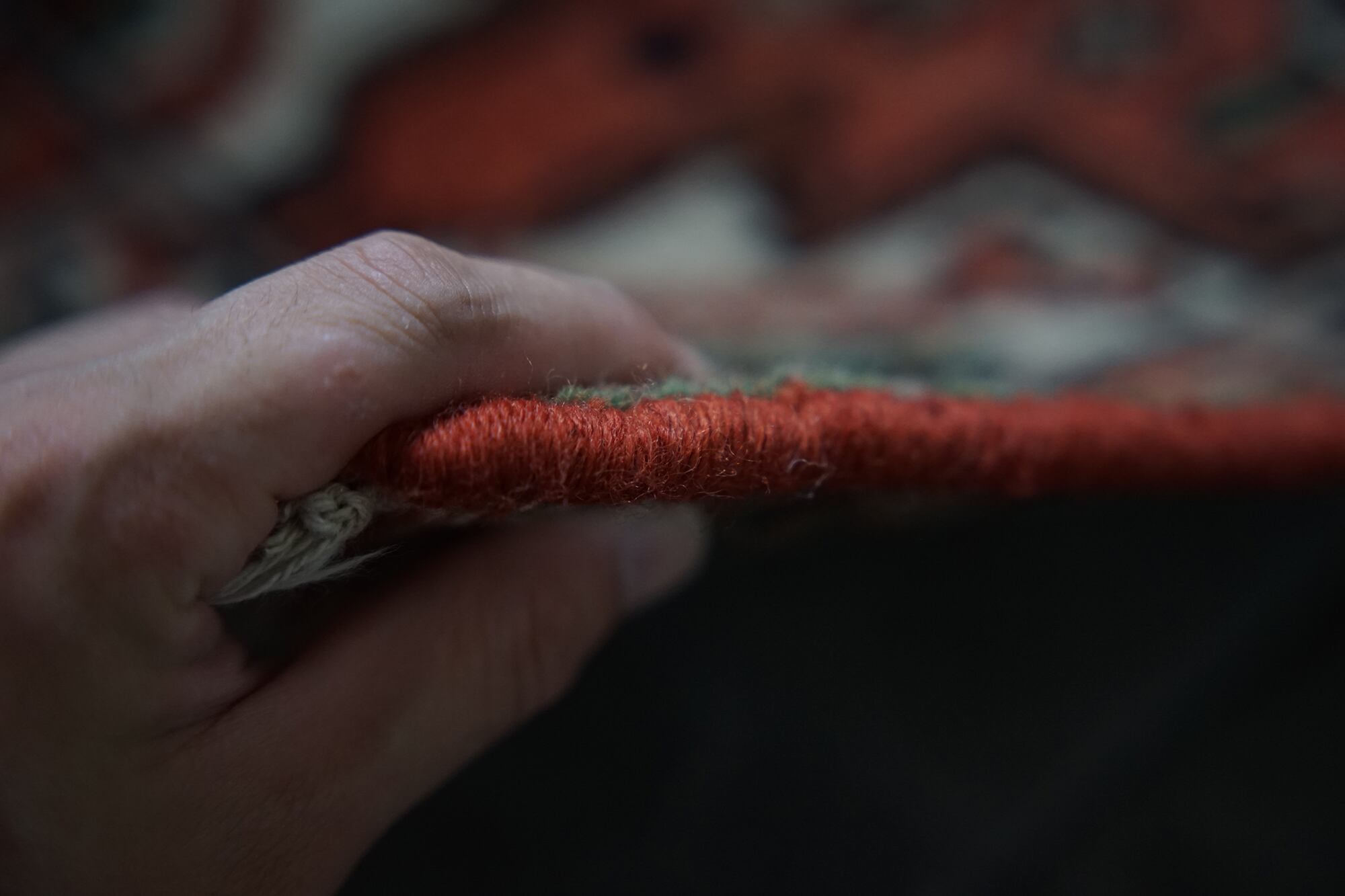 褪色したオレンジ〜ピンクで可愛らしくもあり、ボーダー部分のグリーンがアクセントになってかっこよくも見えます。この織り手の方の色のセンスが店主はかなり好きです。密度の詰まった織りはギャッベのように厚みがあり、折りたたむことが難しいくらいです。触り心地もフカフカのすべすべで床の冷たさは全く通しません。椅子や植物の下に敷いたり、壁に飾ったり、小さいペットのお気に入りの場所にもなりそうです。