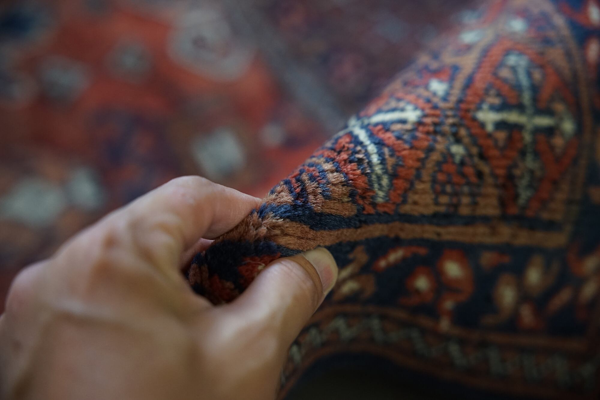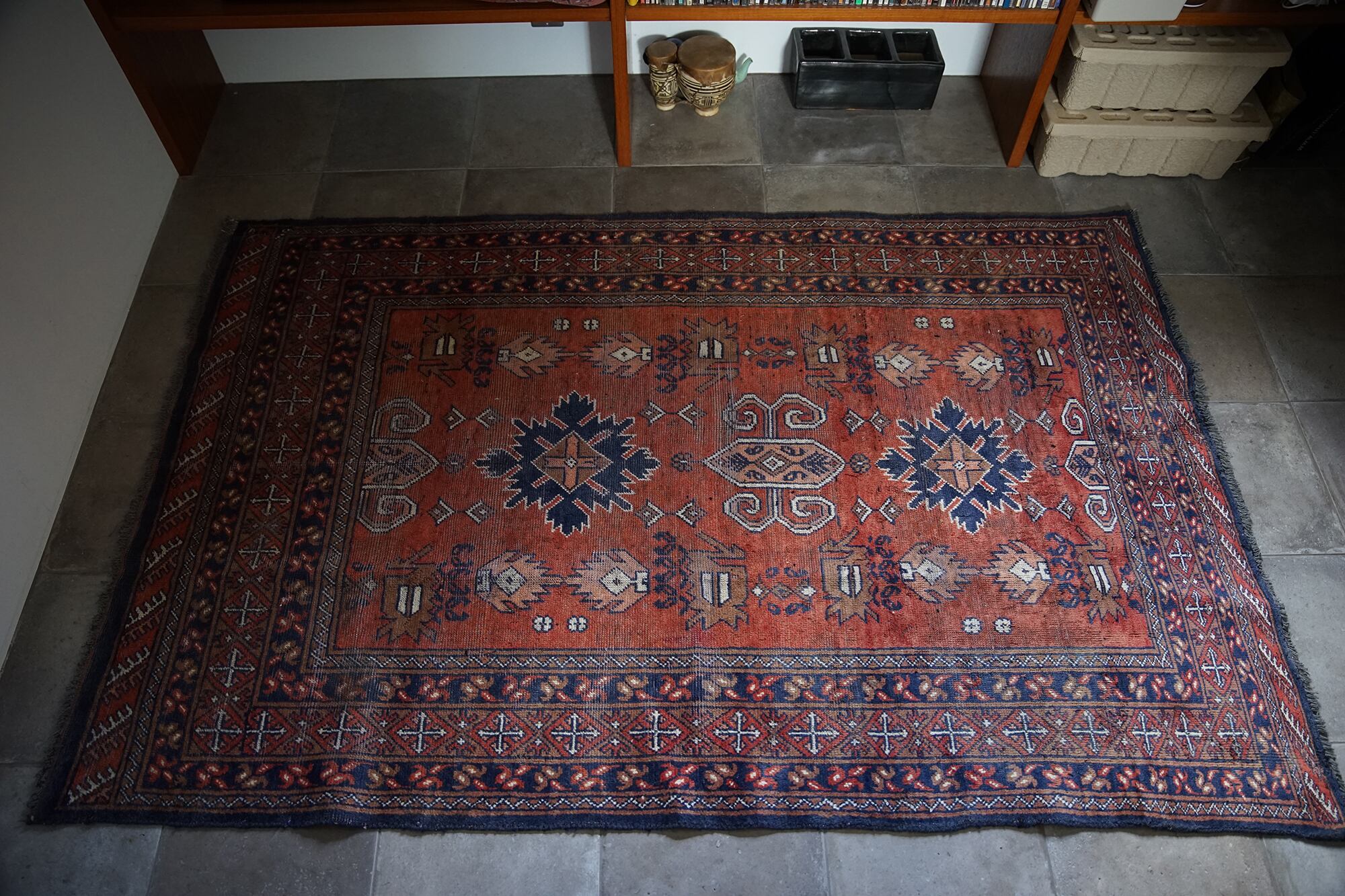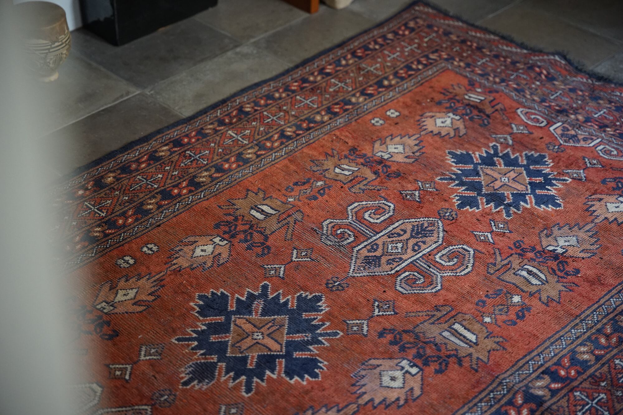 40年程前にバルーチ族によって織られたトライバルラグ。褪色したオレンジ〜茶色×ネイビーの絶妙な色合いが堪りません。真ん中には雄羊の角を現すモチーフ。男らしさや勇壮さ、力強さの象徴です。ボーダー部分には自然賛美を現す流れる水や、魔除けの十字架、クシュと呼ばれる幸せを運ぶ鳥の羽などたくさんのモチーフが描かれています。全体的にパイルの減りと下糸の露出が何箇所かあるため、ヴィンテージに理解ある方のみご購入ください。厚みは5㎜くらいでチクチク感はありません。ソファの前やリビング、書斎、ベッドサイドに置くのにちょうど良いサイズです。