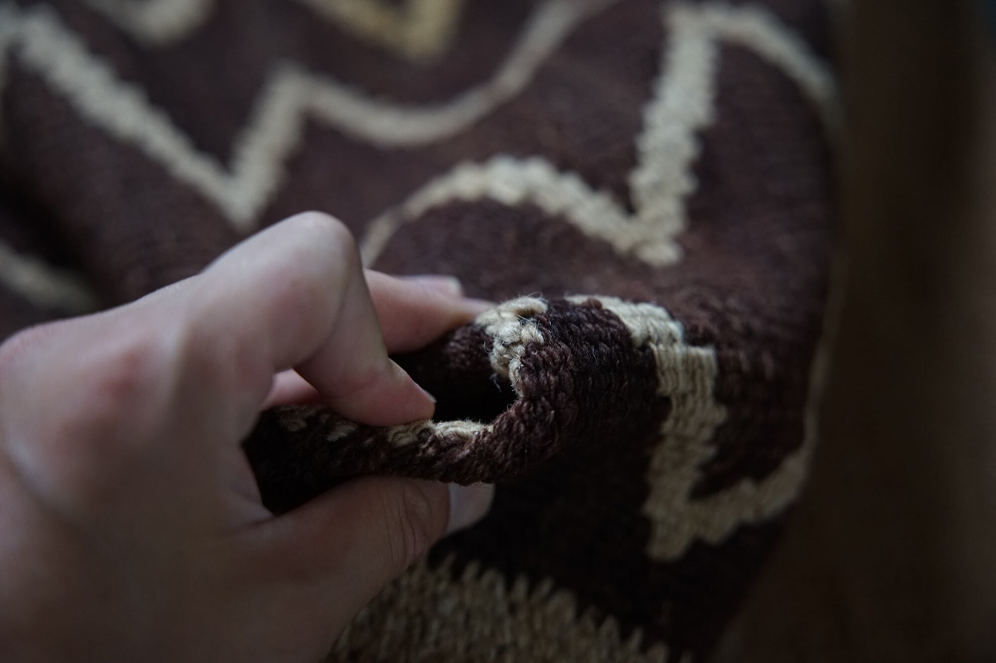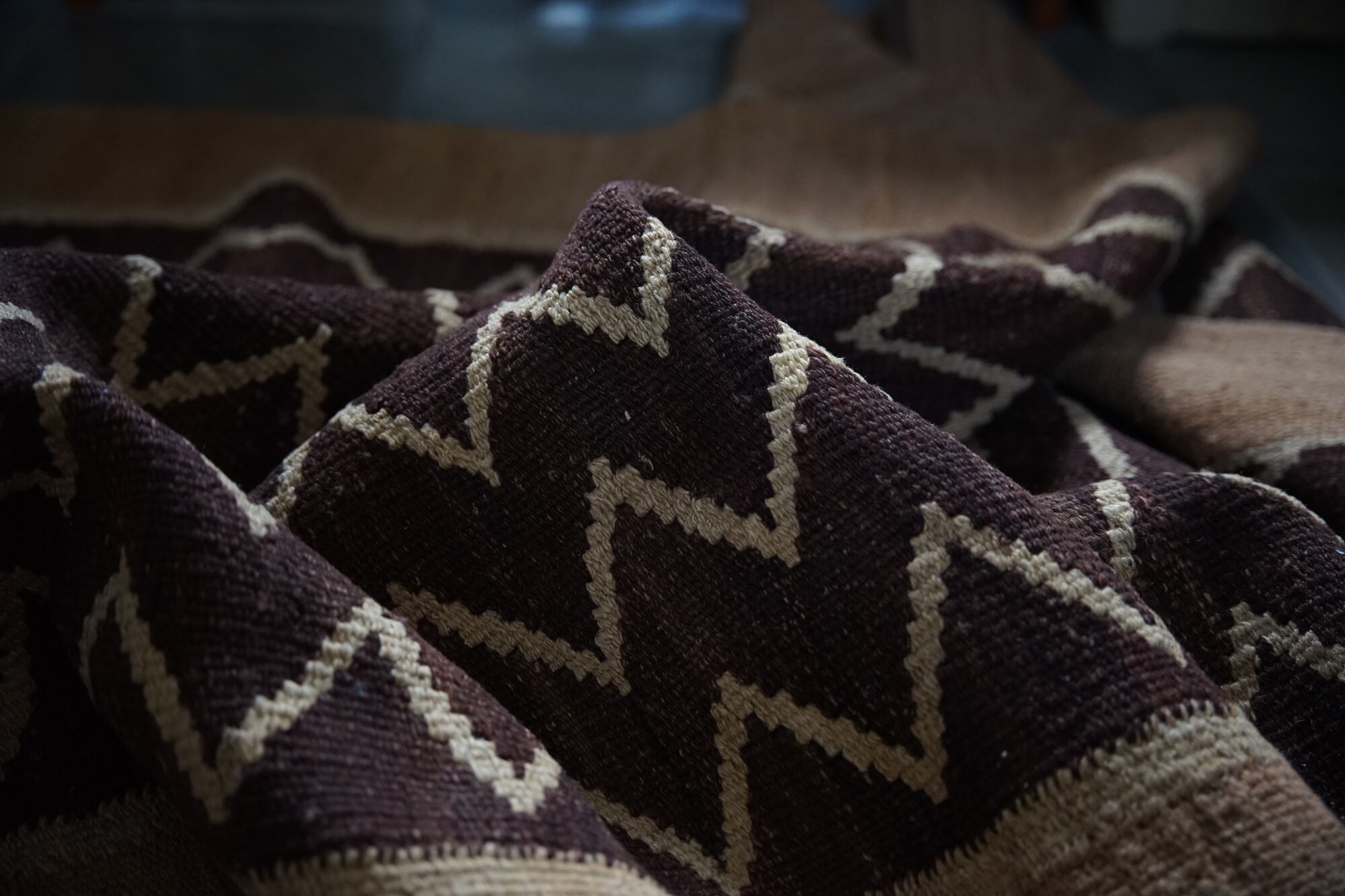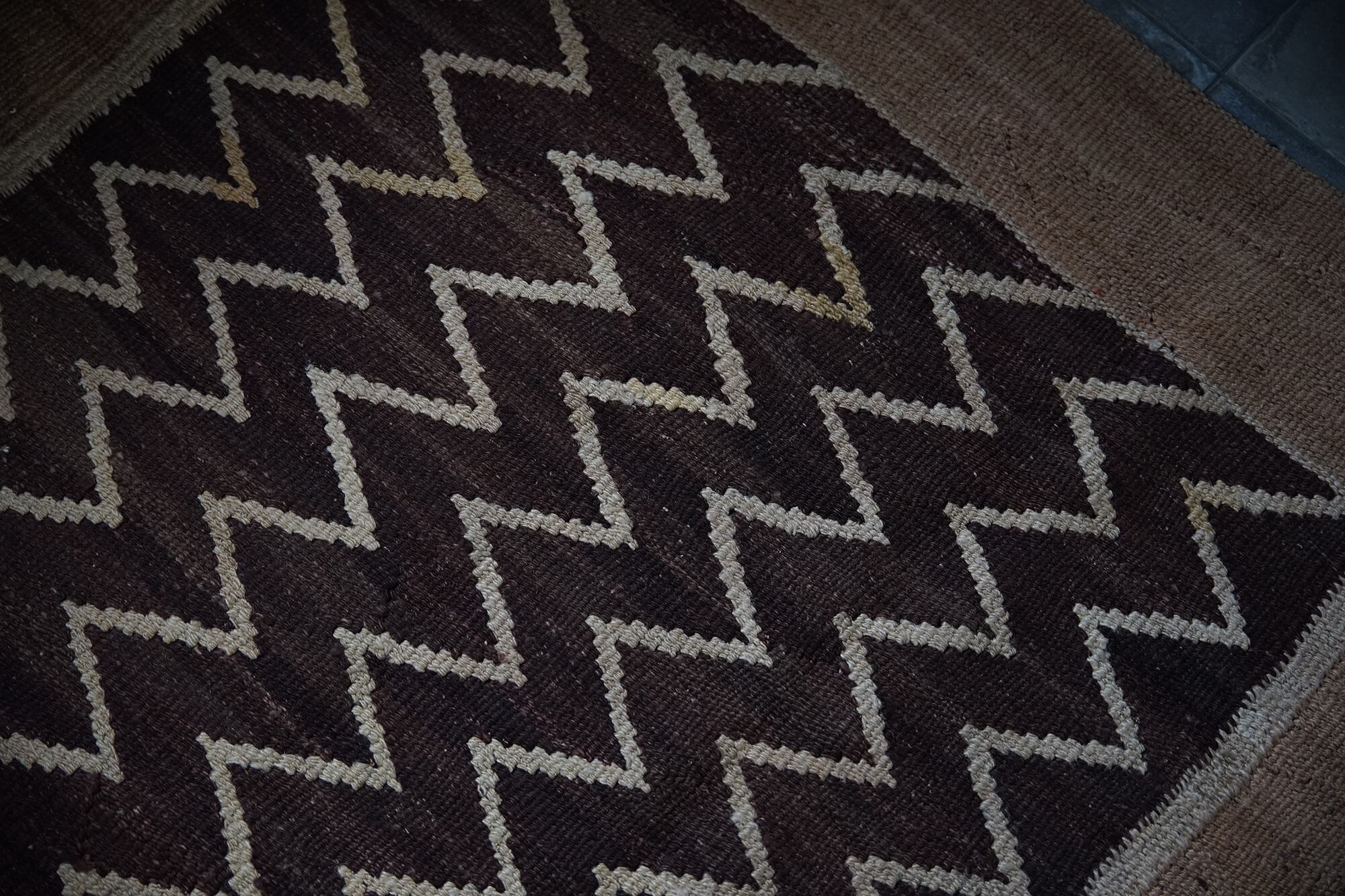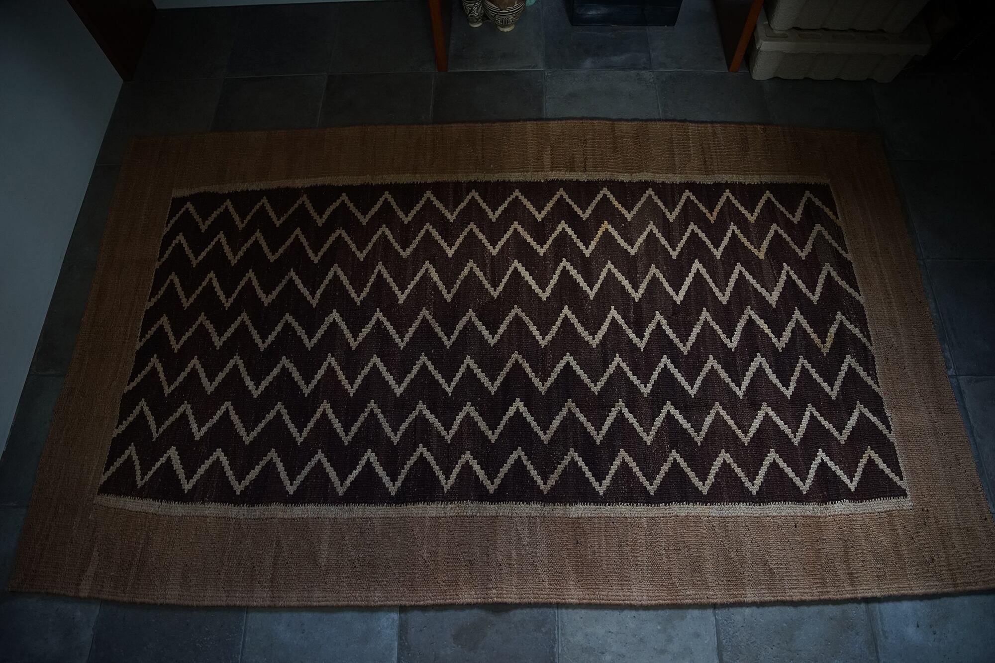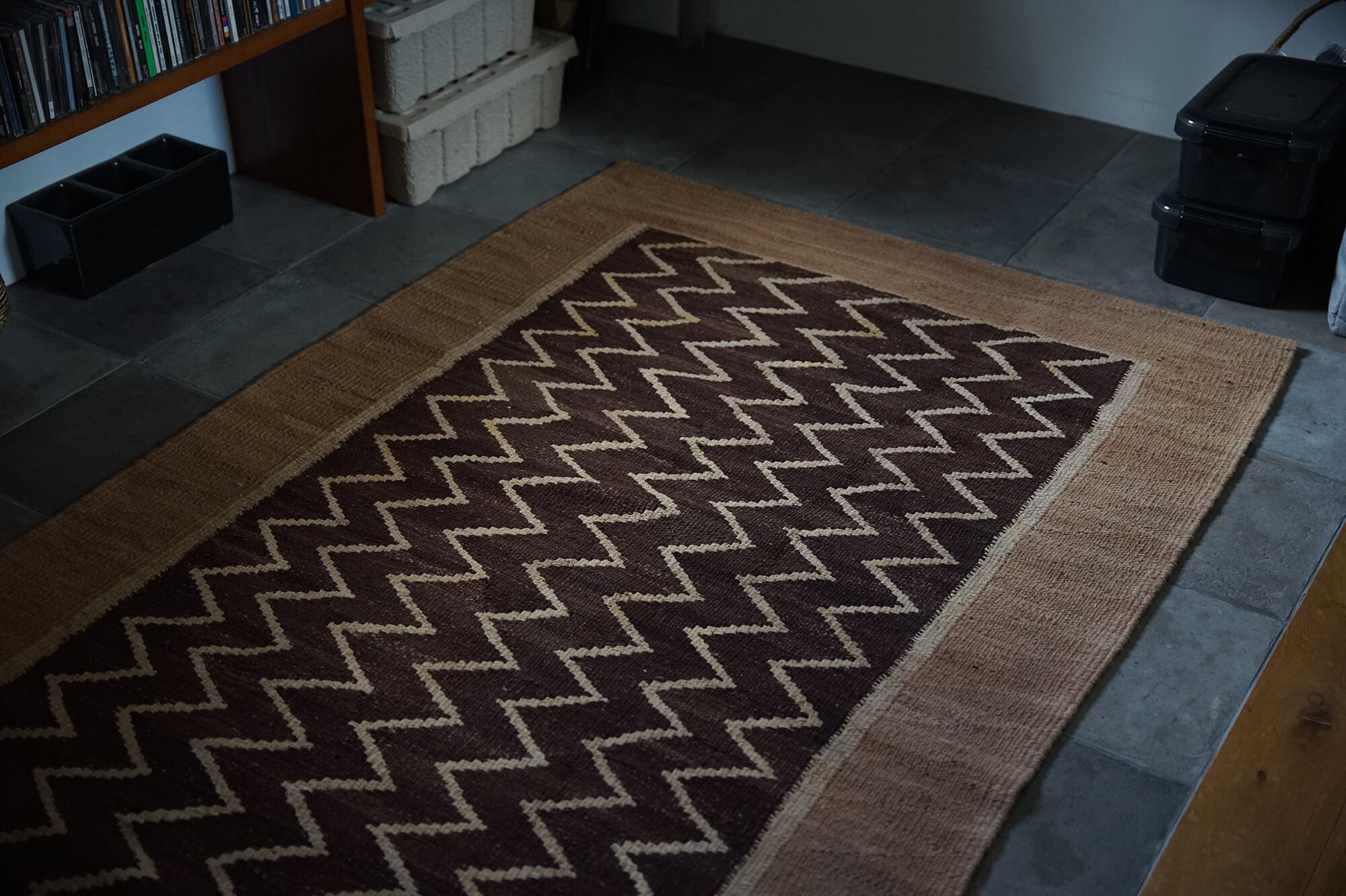 天然染料(野菜)ならではの渋い色合いがかっこよすぎるトルクメンの手織りキリム。40年前のものとは思えないくらい綺麗な状態です。ジグザグラインで現される流れる水は川の流れのように幸せや命がずっと続いて行きますようにとの願いの込められたもの。日常的に使うものにもたくさんの想いや願いが込められたデザインはきっと今も昔も普遍的なものなのでしょう。持ってみると想像以上に重いしっかりとした作りなので床に敷いて使うのがオススメです。使えば使うほど馴染んでくれるキリムを育てる楽しみを感じてみてください。