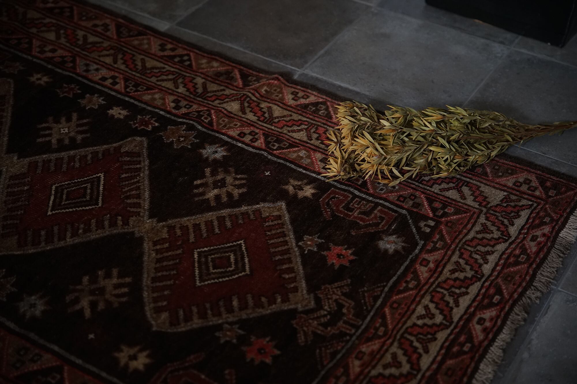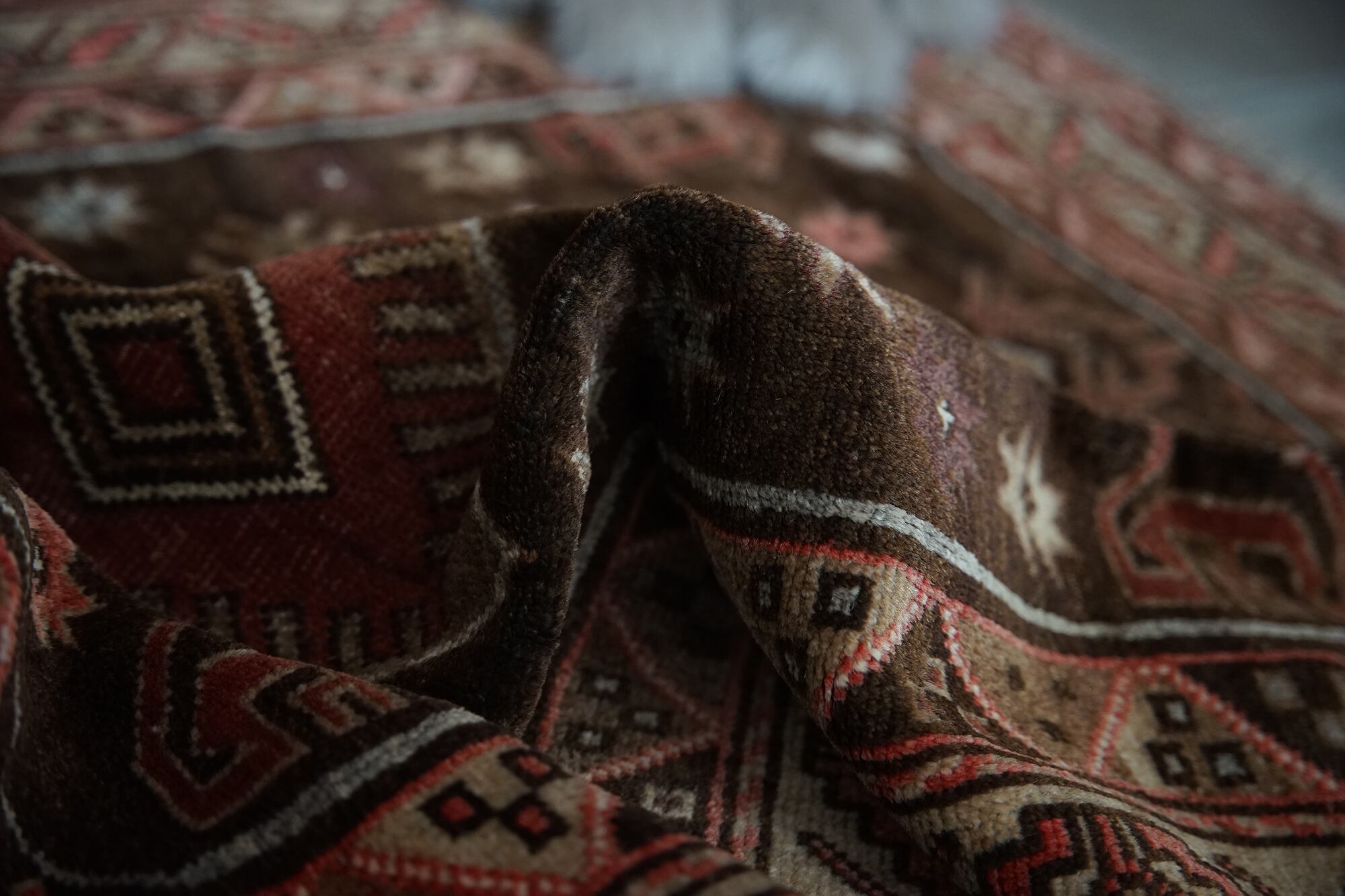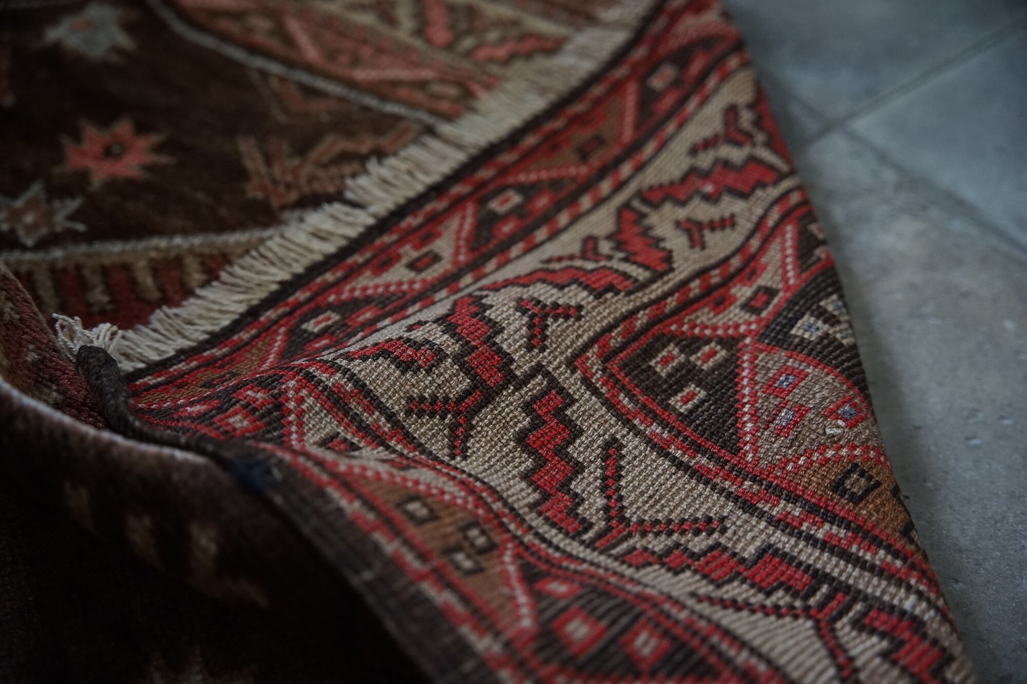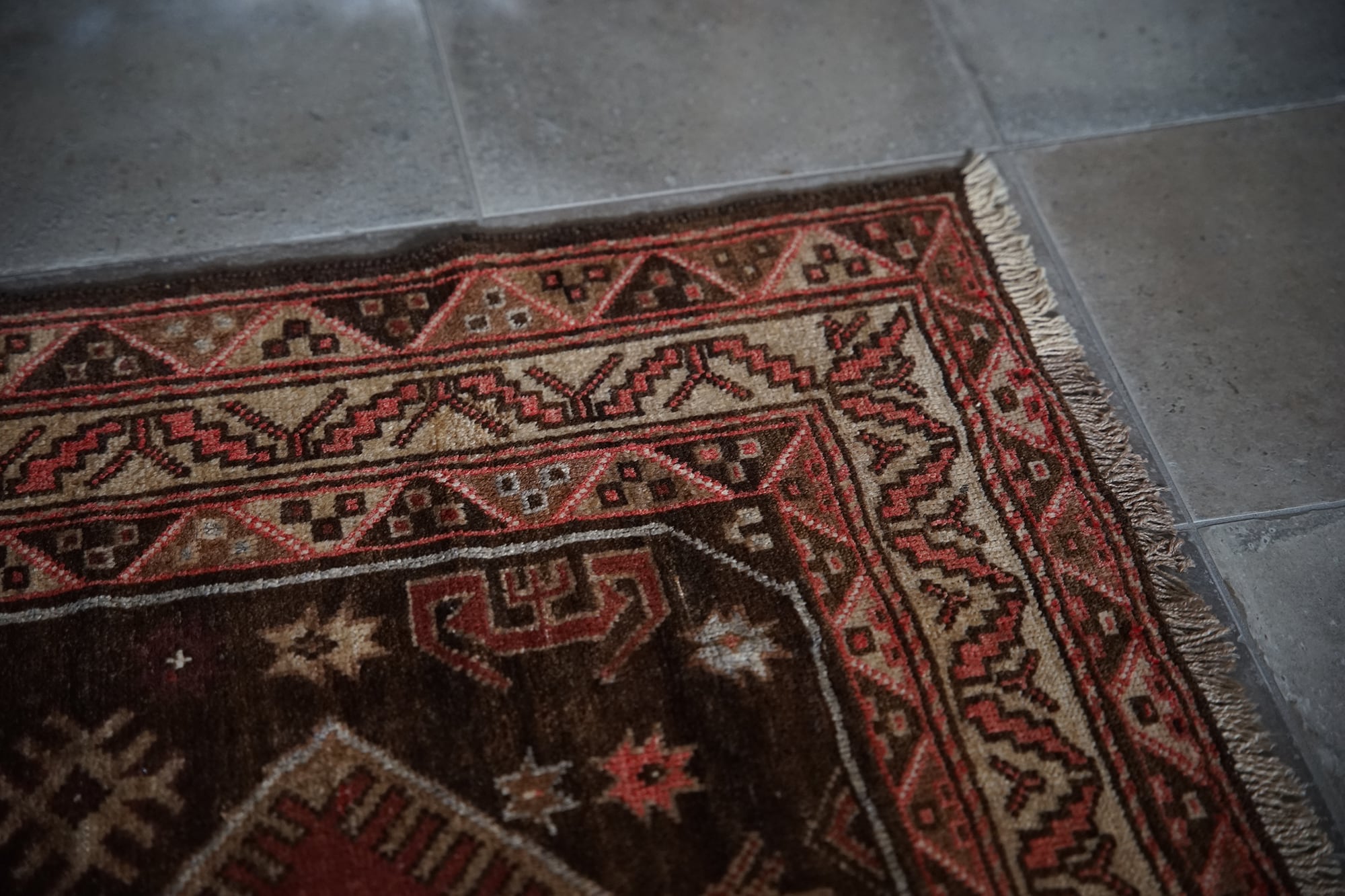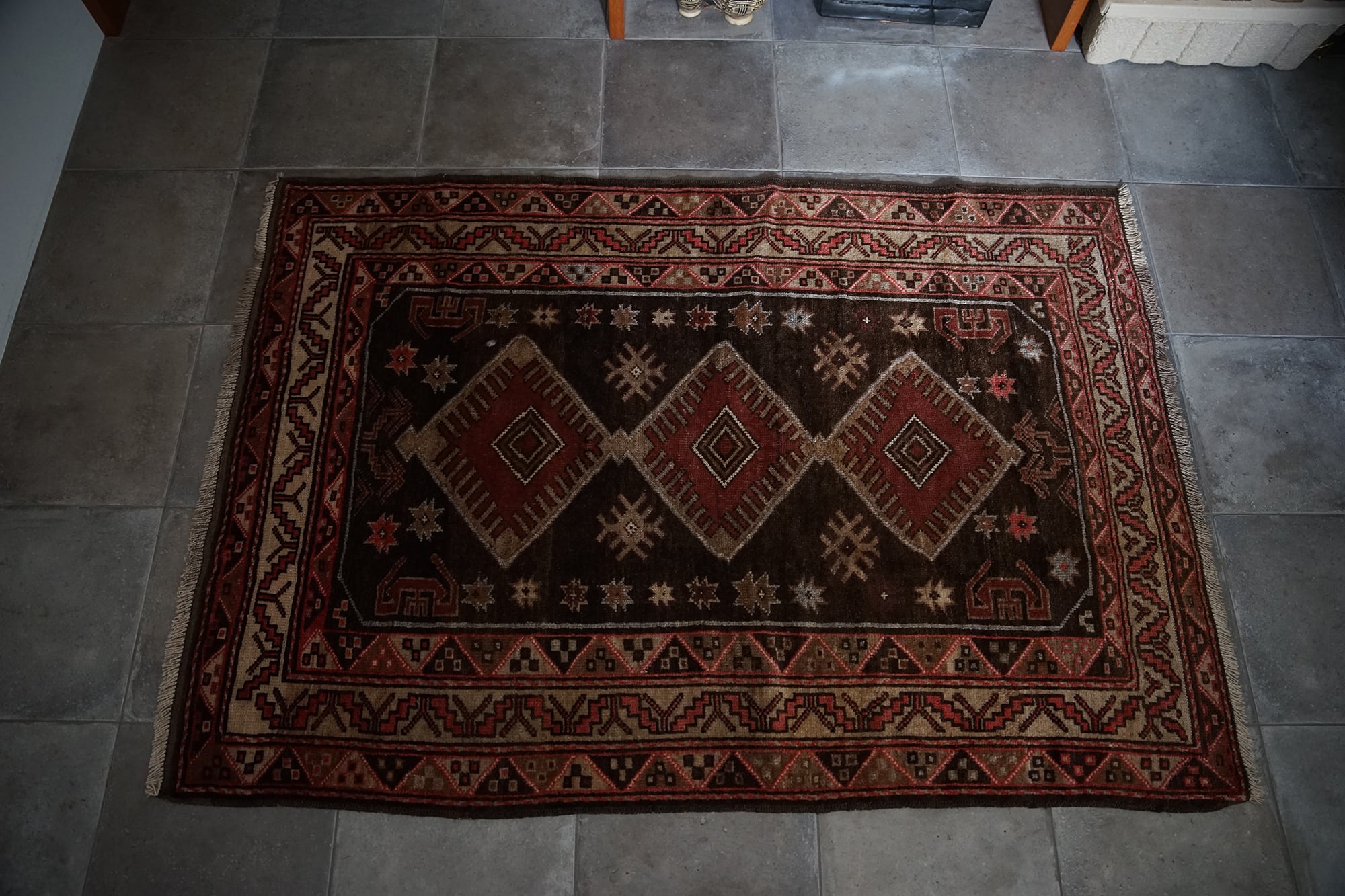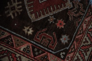 ブラウン系のこっくりした色合いが秋冬にぴったりのトルクメンのトライバルラグ。3つ並んだ菱形紋様の周りにはゴボウの花や八角星、ボーダー部分にも幾何学模様が描かれ、ブラウンのグラデーションが美しいです。70年前のものとは思えないくらい状態は良いです。パイルは長すぎず短すぎず、素足で乗ると滑らかでいて冷たさも通さないトルクメンの丁寧な仕事ぶりが伺えるラグ。小さめソファの前やリビング、書斎、ベッドサイドに置くのにちょうど良いサイズです。