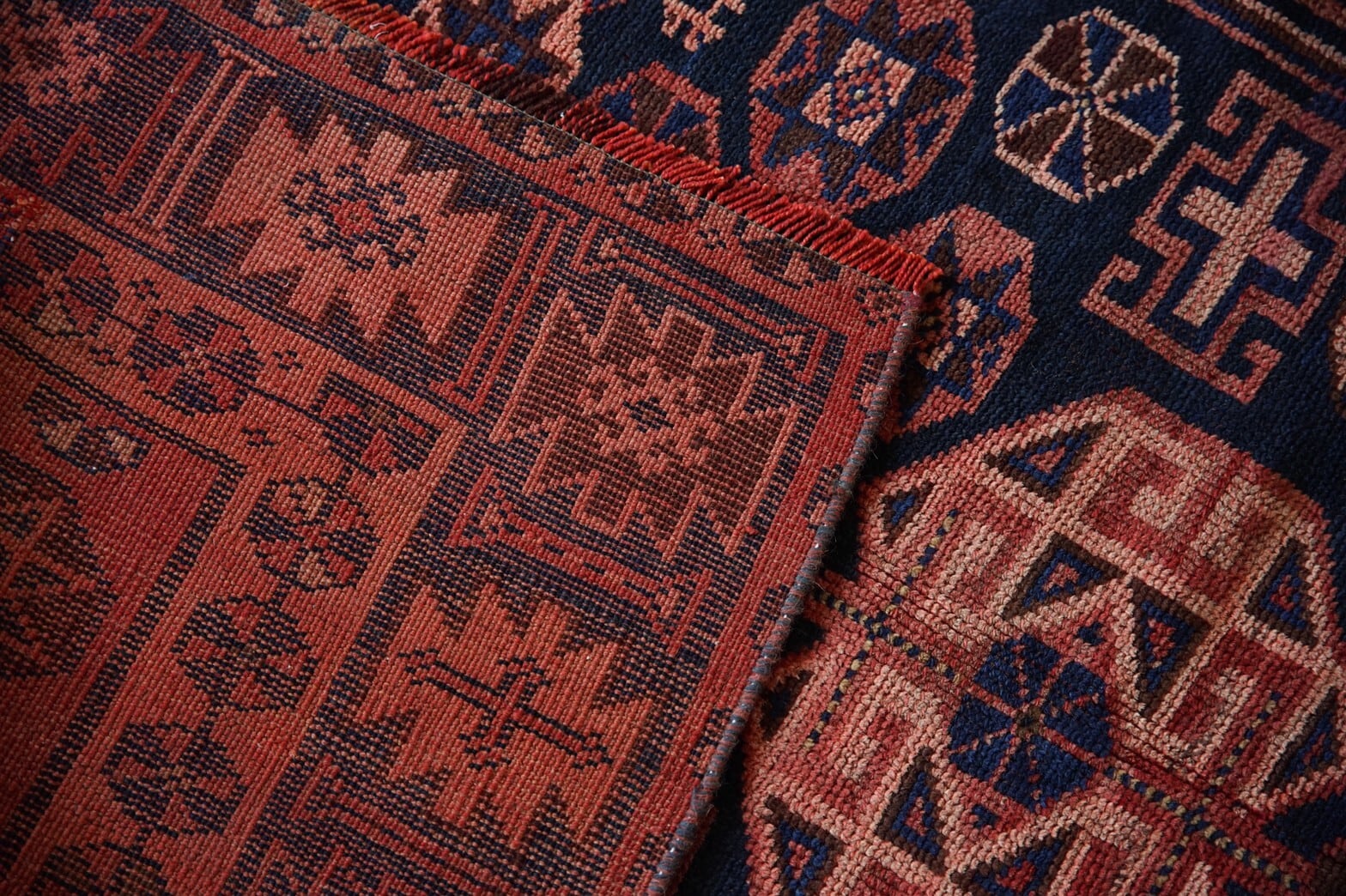 褪色したピンクとネイビーのシンプルな色の組み合わせがヴィンテージのかっこよさを引き立てるラグ。八角星や羊の角、クロス、花、ごぼうなどたくさんのモチーフが描かれ織り手の幸せを願う気持ちが伝わってきます。パイルの減りはほぼ無くパーフェクトなコンディション。厚みもあり、肌触りも良いです。目もしっかり詰まっており丈夫な作りで重量感あります。(結構重いです。)大きめサイズなのでリビングやダイニングのメインに、ソファの前に、書斎にオススメです。