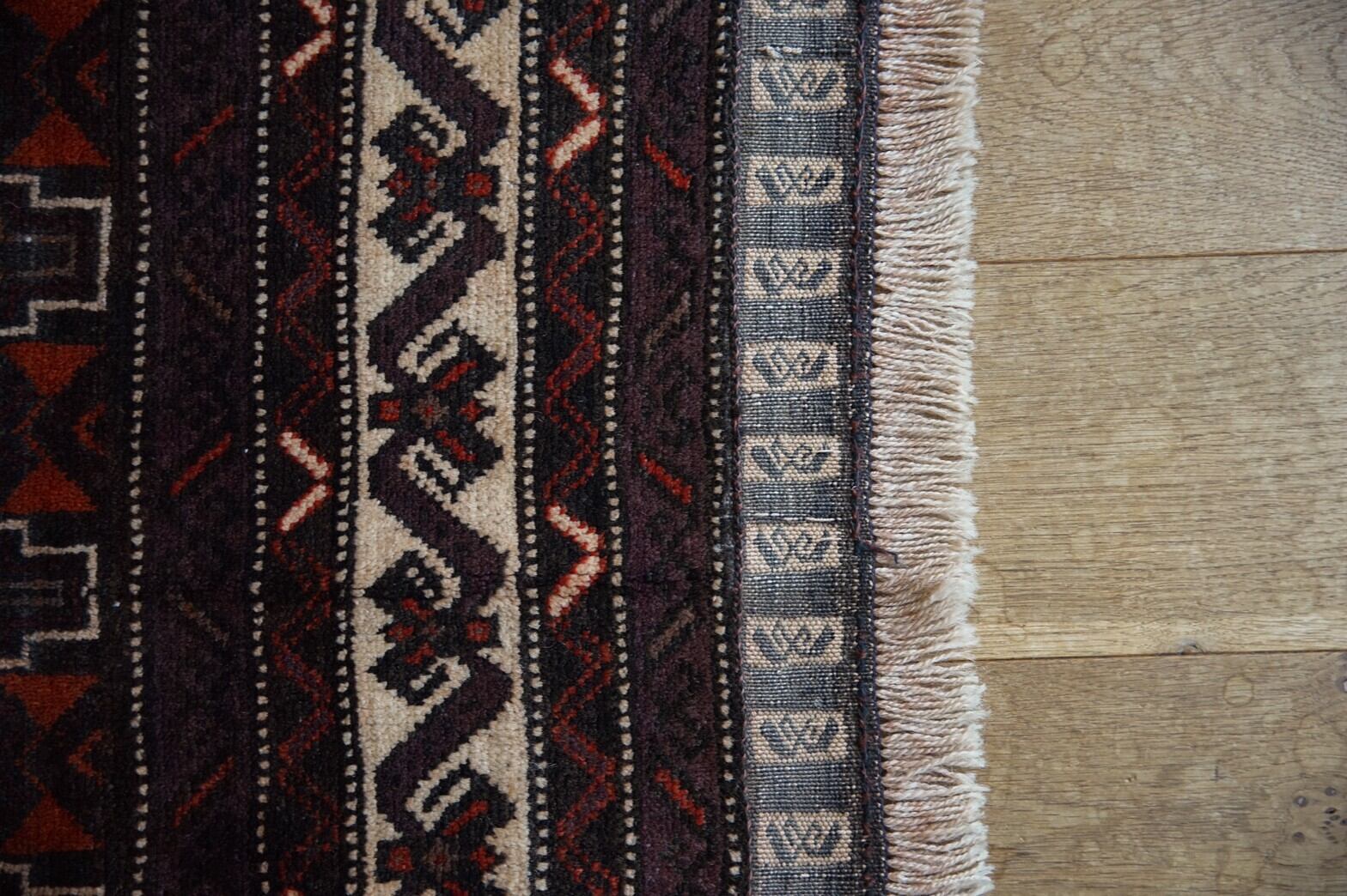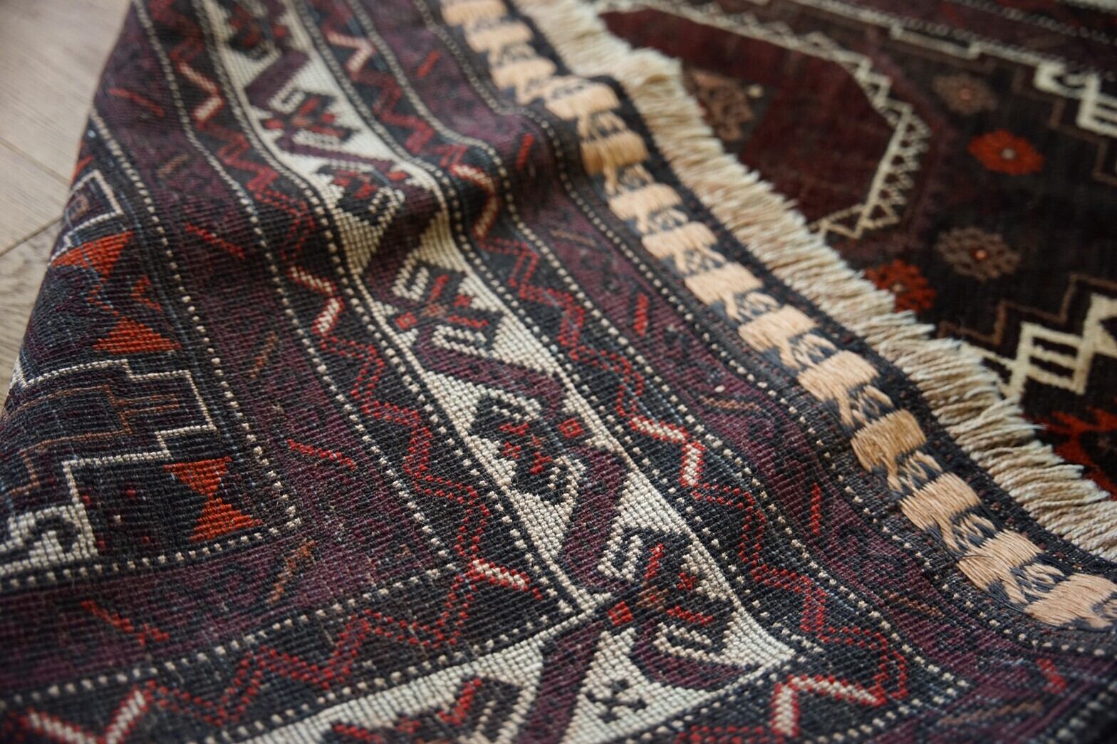 バルーチらしい渋い色合いのラグ。キリムエンドになっているのもかっこいいです。ベースはブラウンに近い墨黒。ギュル紋様は深いボルドーで、自然光に当てると艶もあり色々な色合いに見えるのが魅力。厚みがありフカフカしており、床の冷たさを通さない気持ちの良い肌触り。ヴィンテージラグ特有の歪みがあるため値段は少しお安くしておりますが、とても状態の良いラグのため歪みが気にならない方で大きめラグをお探しの方にはかなりおすすめです。ソファの前やリビング、書斎、ベッドサイドに置くのにちょうど良いサイズです。