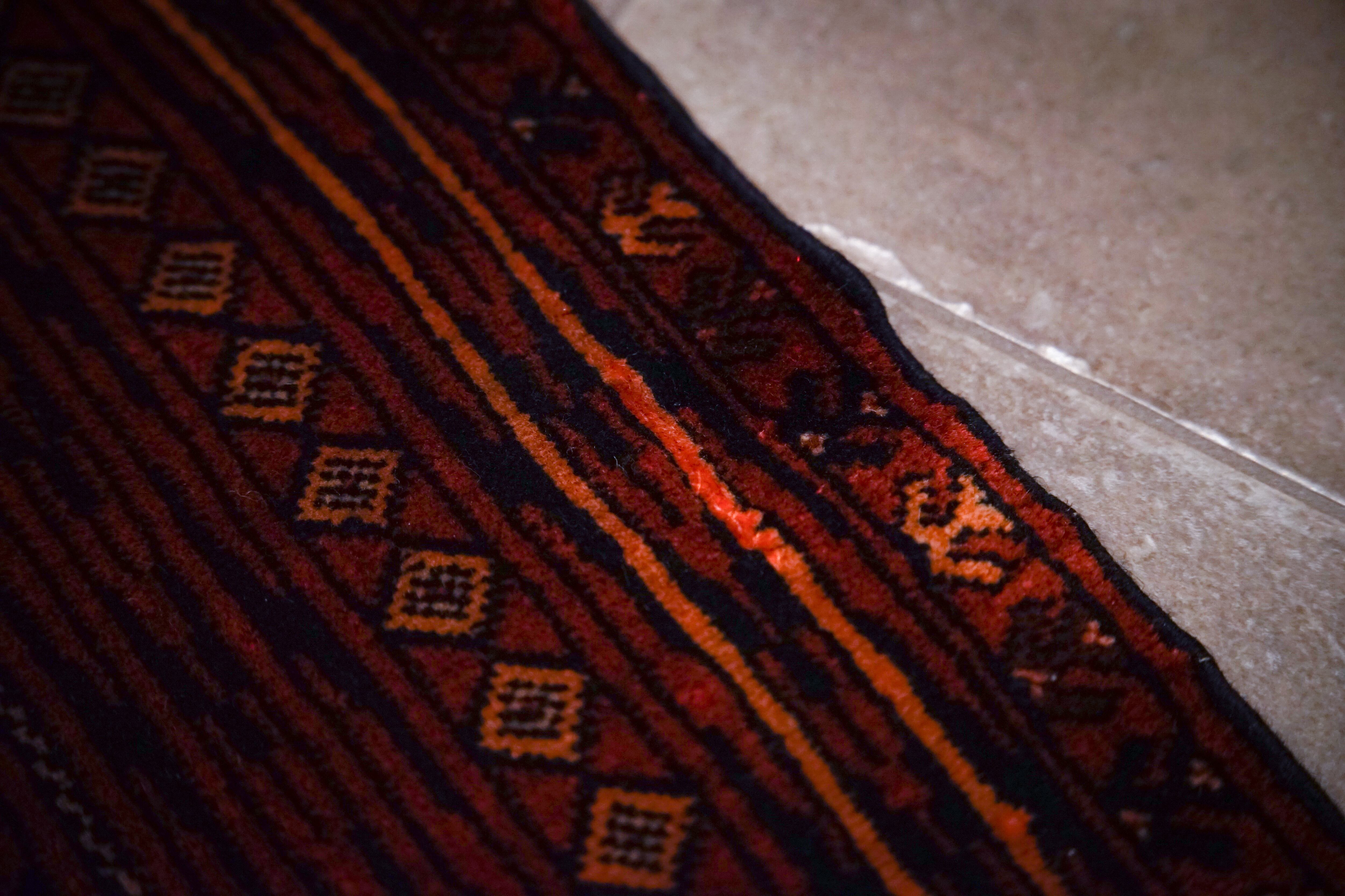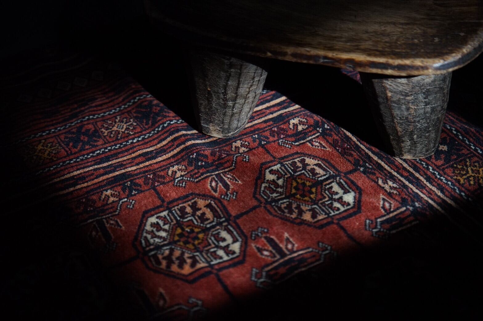 1960年代のトルクメンのトライバルラグ。気品溢れるボルドーのような深い赤にAkhal Gulと呼ばれる部族の家紋が並びます。ビロードの様な艶感とずっと触っていたくなるような滑らかさ。手織り特有の歪みと補修跡があるため少しお安くしております。(修復箇所は画像7枚目を参照ください。)