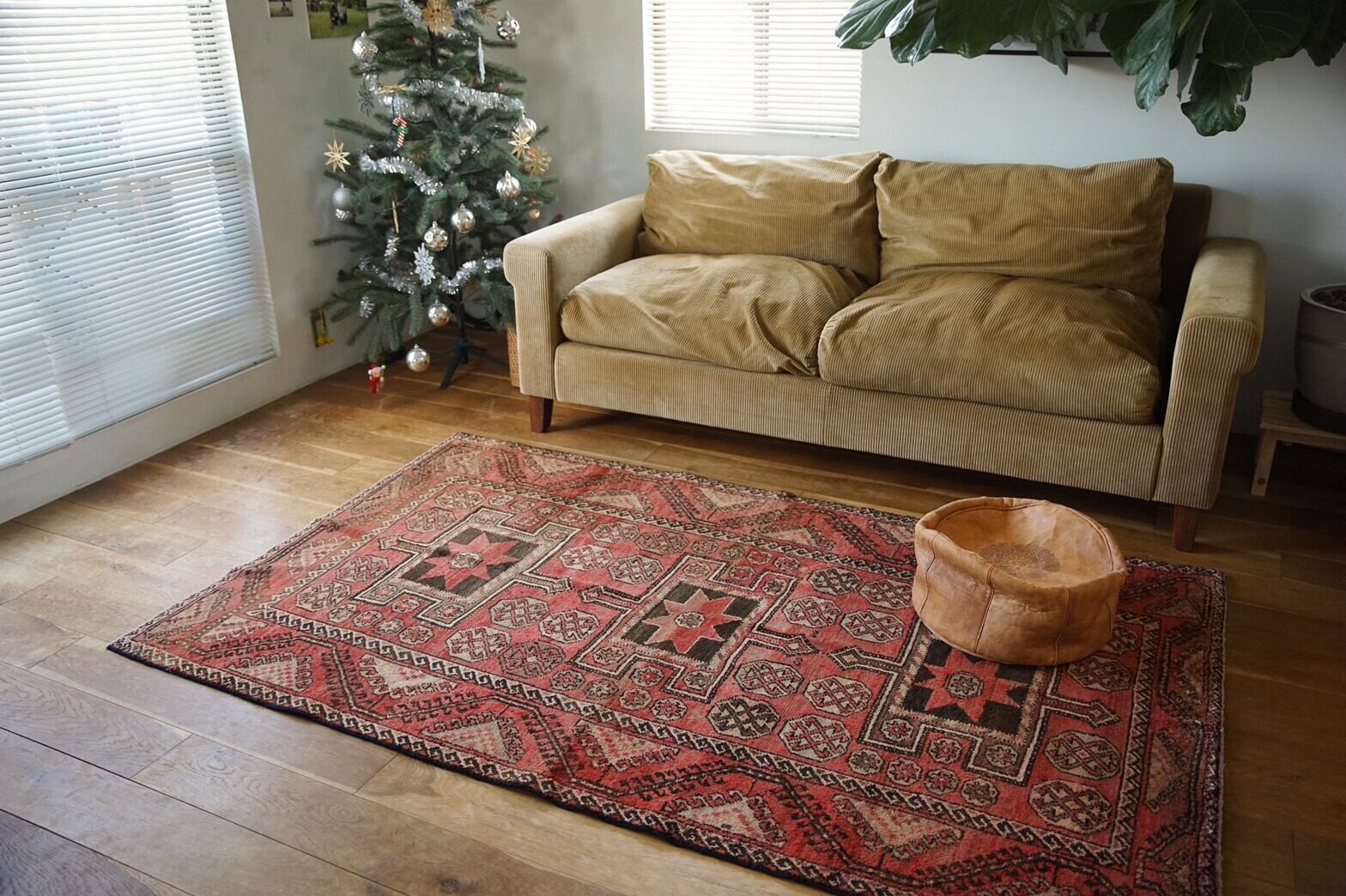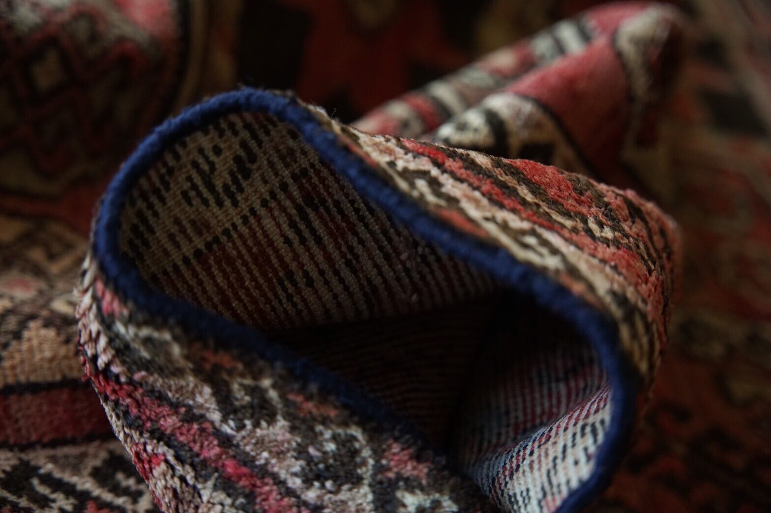 コーカサス地方で80年前に織られたセミアンティークラグ。褪色して赤からピンクの綺麗なグラデーションをベースに黒がアクセントになっているユニークなデザインです。コーカサスラグの特徴である幾何学模様。魔除けのフックや幸せを祈る大小様々な八角星が並んでいます。経年変化によるパイルの減りは多少ありますが、まだまだ現役で使えるフカフカ感。厚みもあります。ソファの前やリビング、書斎、ベッドサイドに置くのにちょうど良いサイズです。