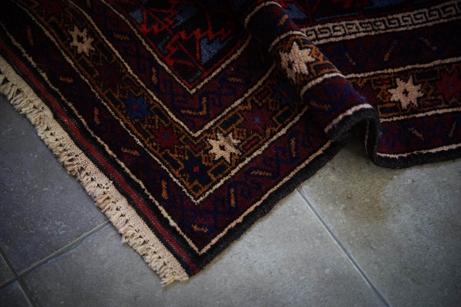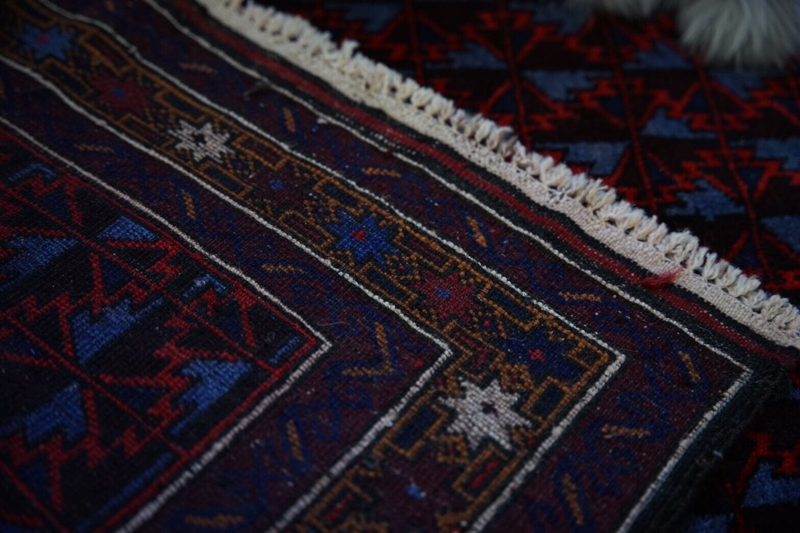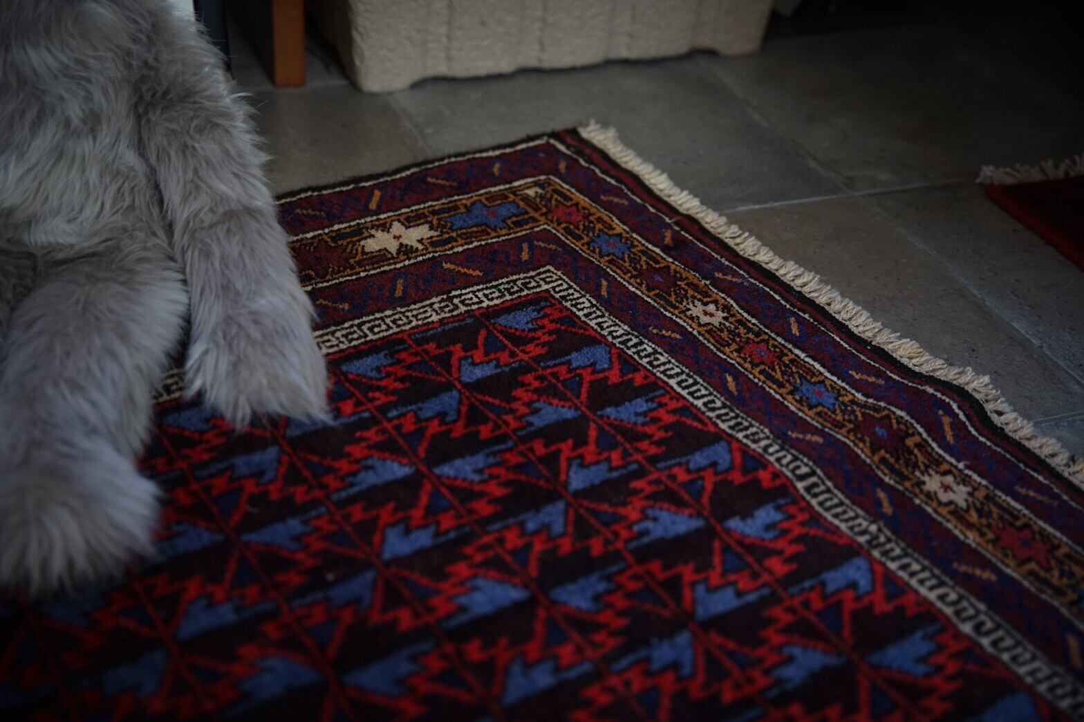 50年前に織られたタイマニ族のプレイヤーラグ。ボーダー部分にはカラフルな八角星が並び、チナールと呼ばれる葉っぱ紋様の美しいブルーに目を奪われる。また、キリムエンドになっており黒に赤ラインがかっこいいです!程よい厚みでフカフカ感もある床の冷たさを通さないタイプ。ぜひ素足で踏みしめて下さい。日本の住宅事情的には家のあらゆるシーン(キッチン、鏡の前、デスクの下、ペットのお気に入りの場所として)で使い勝手の良いラグです。