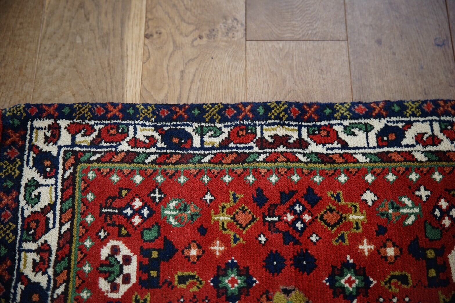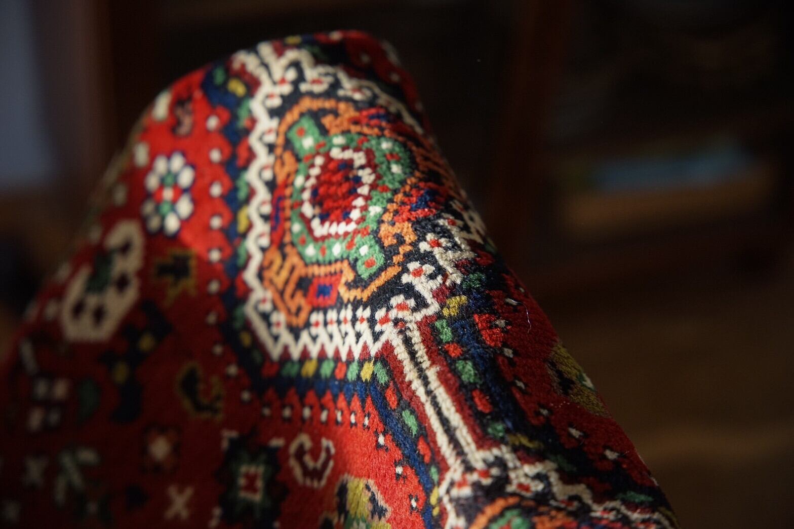 スクエア型のカシュガイラグ。ポップな色合いが見てるだけで楽しいですね♪真ん中の菱形メダリオンやフィールドにもたくさん使われているグリーンがポイント。クリスマスの時期にもぴったりな雰囲気です。4匹いる動物は何の動物でしょう…。私には犬に見えますが、良質なウールを使っているのかとても気持ちの良い手触り。ずっと撫でていたくなります。状態もとても良く、パイルの減りは全くありません。リビングに敷いたり、ベッドサイド、キッチンラグとしてオススメのサイズです。スクエア型なので他のラグと組み合わせて敷いてもいいですね♪
