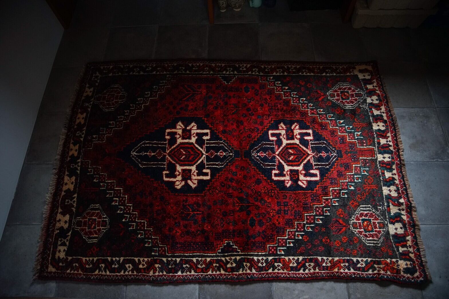 全体的に落ち着いた色合いのカシュガイラグ。状態はとても良く、少し長めのパイルは自然光に当てるとツヤツヤと光り輝きます。コーナー部分の墨黒がとても美しくずっと眺めていたくなります。落ち着いたトーンの中に深緑が効いているのもこのポイントの推しポイント。厚みもあり、床の冷たさも通さないのでまだまだ寒いこの時期も暖かく過ごせそうです。ソファの前やリビング、ダイニングテーブルの下、書斎に置くのにちょうど良いサイズです。華やかな雰囲気よりも渋めのカシュガイがお好きな方にぜひ!