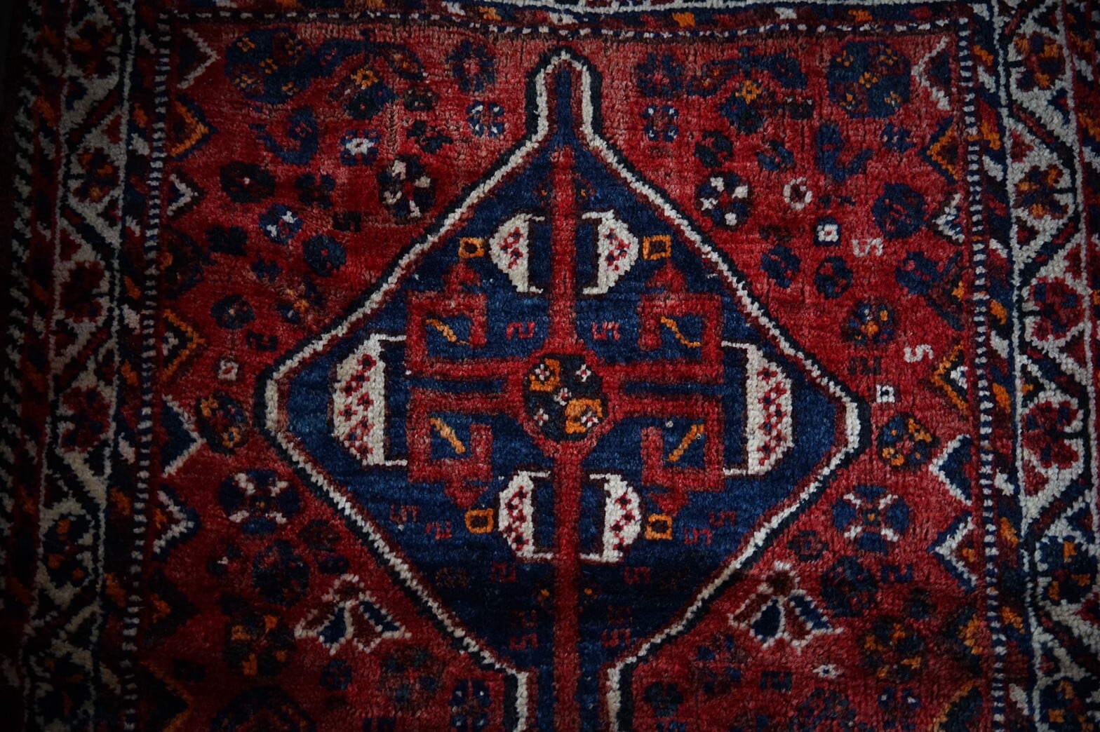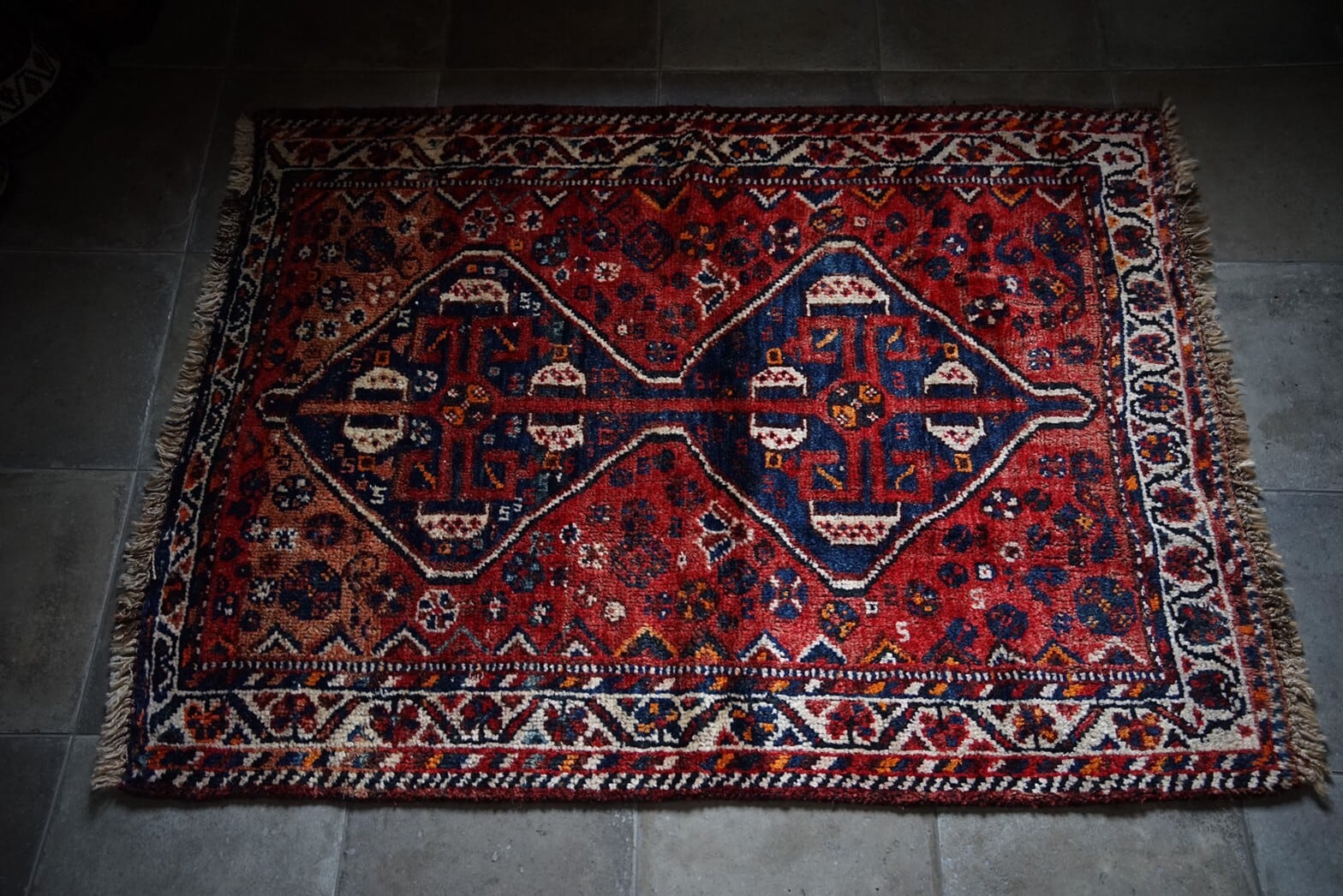 ヴィンテージの魅力を詰め込んだカシュガイラグ。クタッとした風合い、経年を感じる色褪せた美しいグラデーション、たくさん並んだかわいいモチーフ。持ち上げるとずっしり感はありつつも、柔らかい触り心地が安心感となり自分のパートナーとしてベストなラグだと思うでしょう。本当にどこに置いても馴染んでくれるんです。常に足元に置いておきたくなるかわいい相棒としてぜひ!パイルは艶もあり、日焼けで褪色している部分もとてもいい色です。フィールドやボーダー部分にたくさんの花模様が描かれているのもかわいらしいです。リビングや書斎に敷いたり、ベッドサイド、姿見の前にオススメのサイズです。