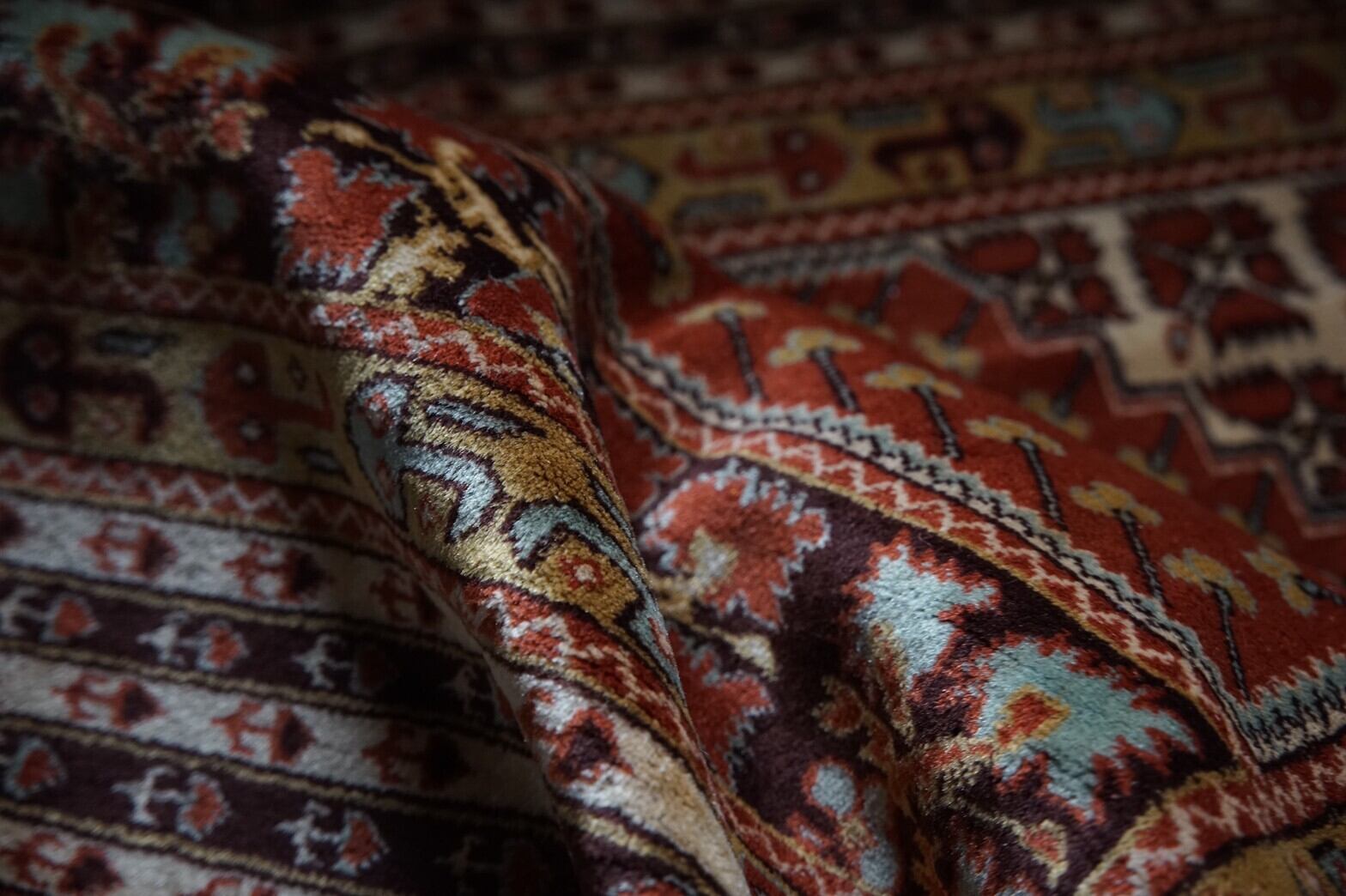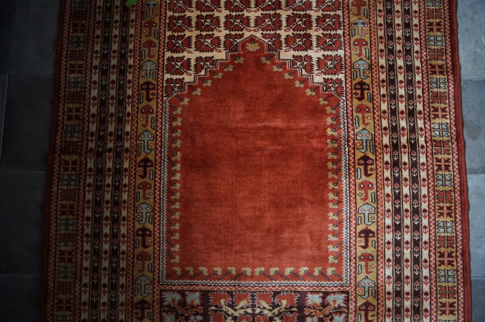 1980年代に作られたトルコのカイセリ産のプレイヤーラグ。ミフラーブと呼ばれるイスラム建築のアーチ型デザインが描かれています。上質なウールで織られたラグは経年変化でより美しく輝きます。ベースは飴色のような琥珀色のような絶妙な色合い。ボーダー部分には大小様々な可愛らしい花模様が描かれていますちなみにクラゲのような傘のようなモチーフが何なのか現地セラーに聞いたらこれも花のモチーフとのことです。肌触りはキメが細かく滑らかな触り心地でとても気持ちいいです。気品もありつつどんなインテリアにも馴染む色合いのラグなので、ソファの前やリビング、書斎に敷いたり、ベッドサイドにオススメです。
