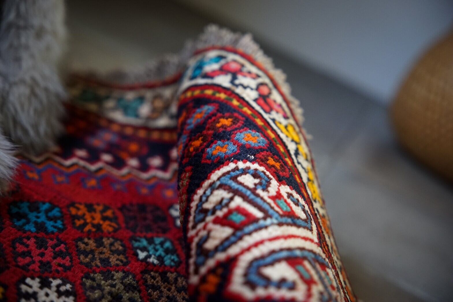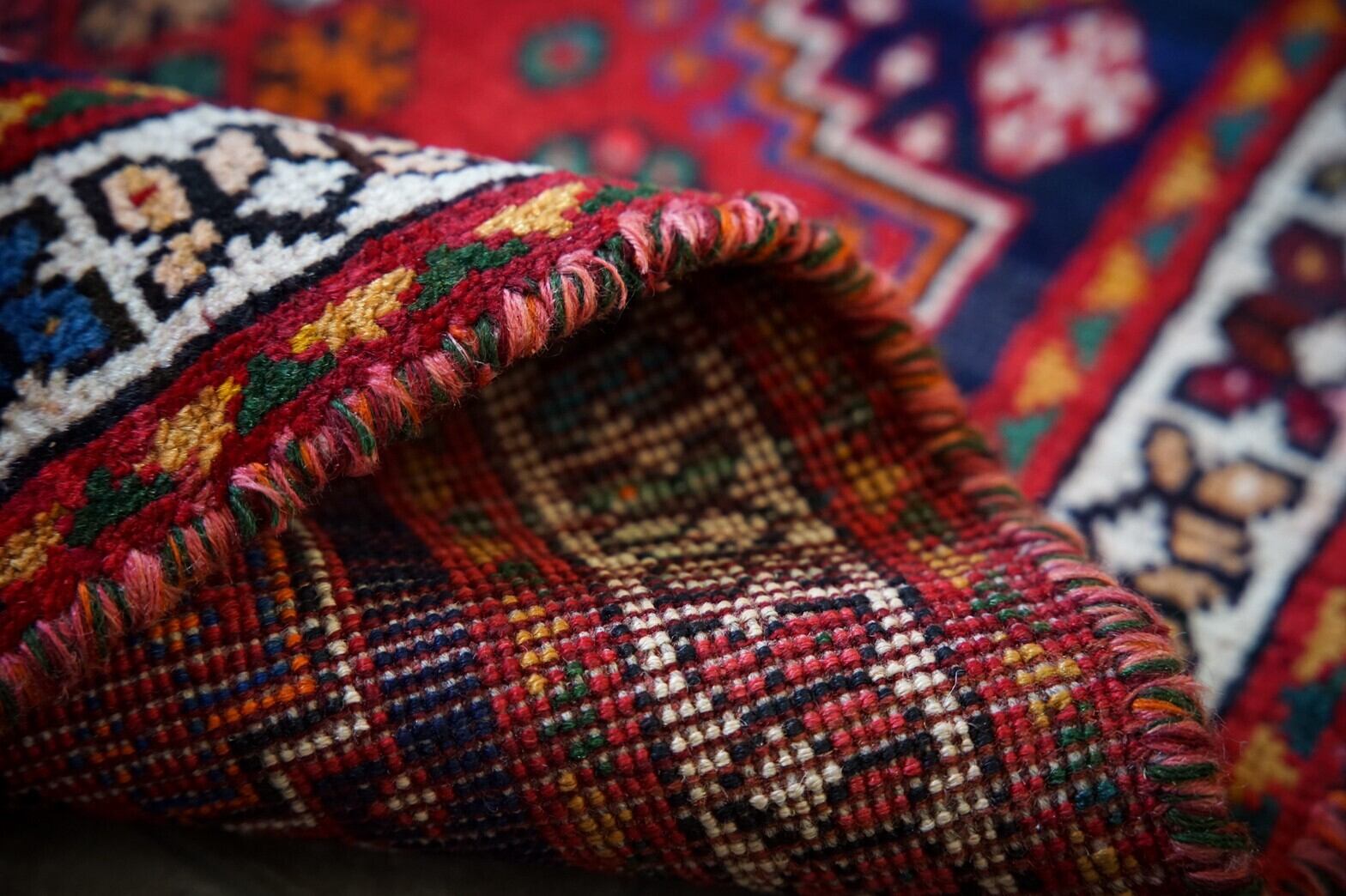 カラフルな色合いのカシュガイラグ。メダリオン部分のブルーを中心にラグ全体に大小様々な花が描かれておりとても美しいです。パイルはしっかり残っておりフカフカで厚みがあるので床の冷たさを通しません。状態がとても良くラグダメージはほぼありません。リビングに敷いたり、ベッドサイド、キッチンラグとしてオススメのサイズです。細部までとってもかわいく見ているだけでワクワクするようなラグ。子供部屋に敷いてもかわいいと思います♪
