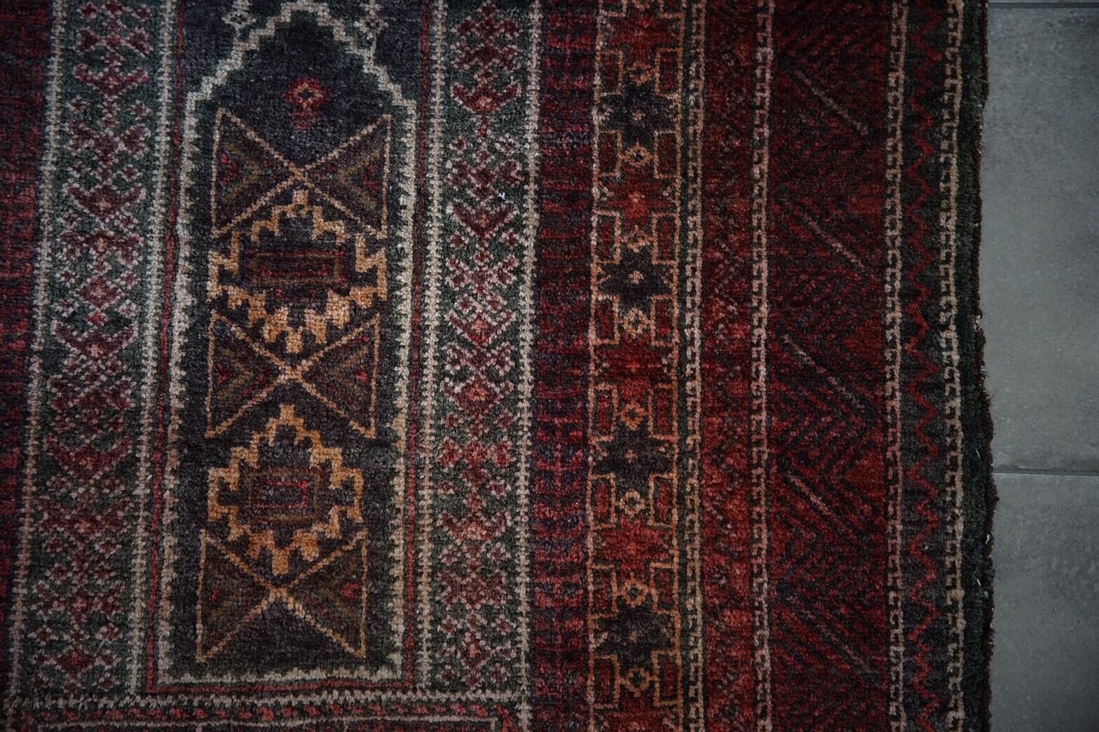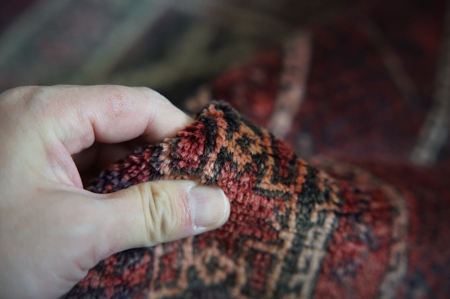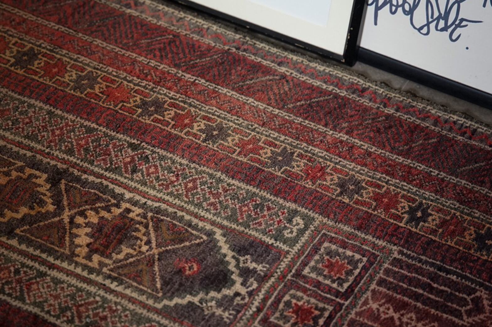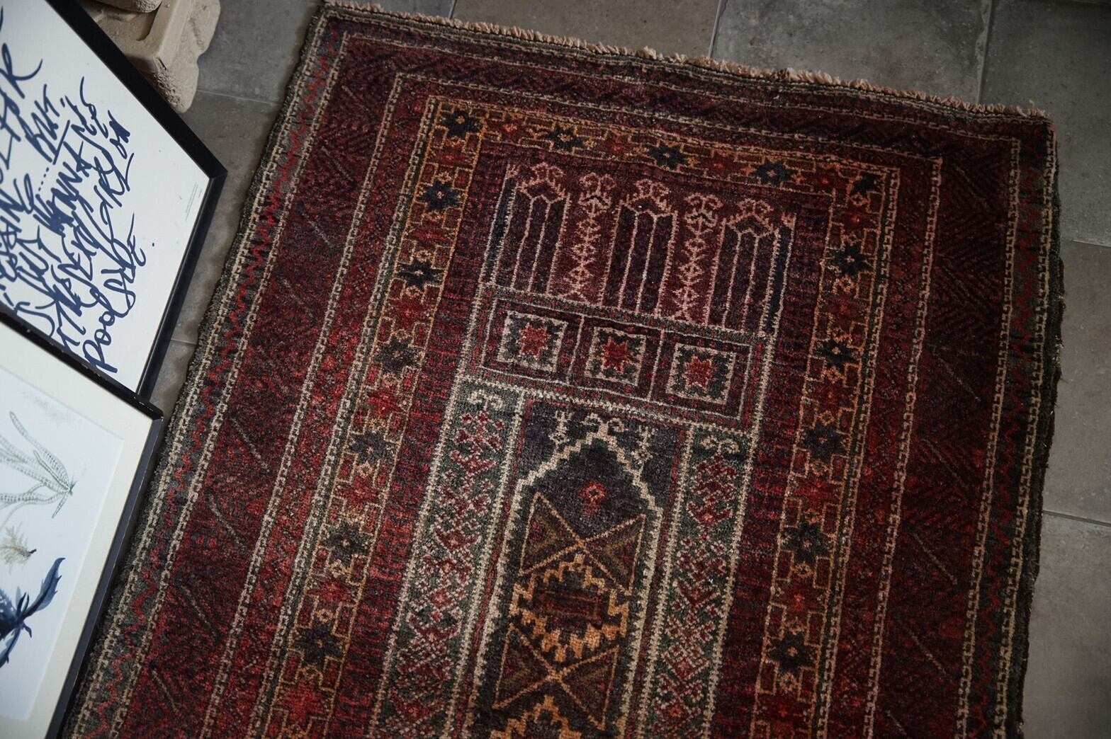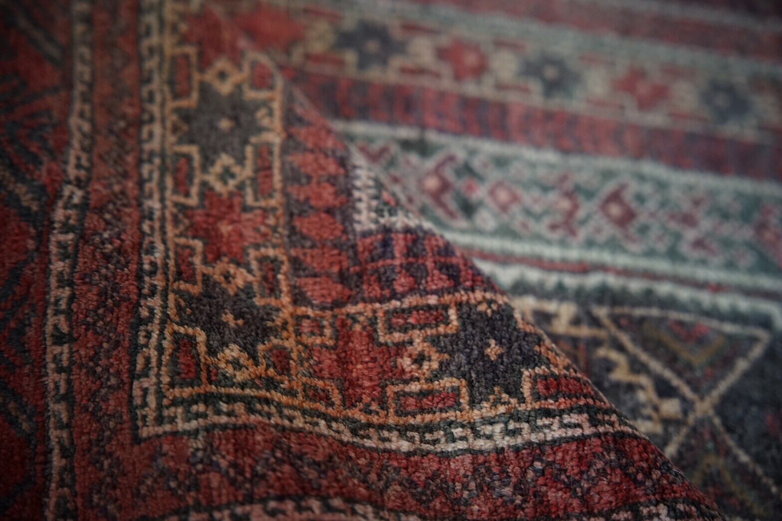 くたっと柔らかい雰囲気と渋い色合いが魅力のプレイヤーラグで、3つのミフラーブが織り込まれています。赤系でもくすんだ色合いなので派手さは無いですが、どんなインテリアにも合わせやすい落ち着いたトーン。ボーダー部分に並んだ八角星がアクセントになっています。パイルも長すぎず短すぎずで触り心地は柔らかい。自然光に当てると艶もあります。リビングや書斎に敷いたり、ベッドサイド、姿見の前にオススメの使いやすいサイズです。