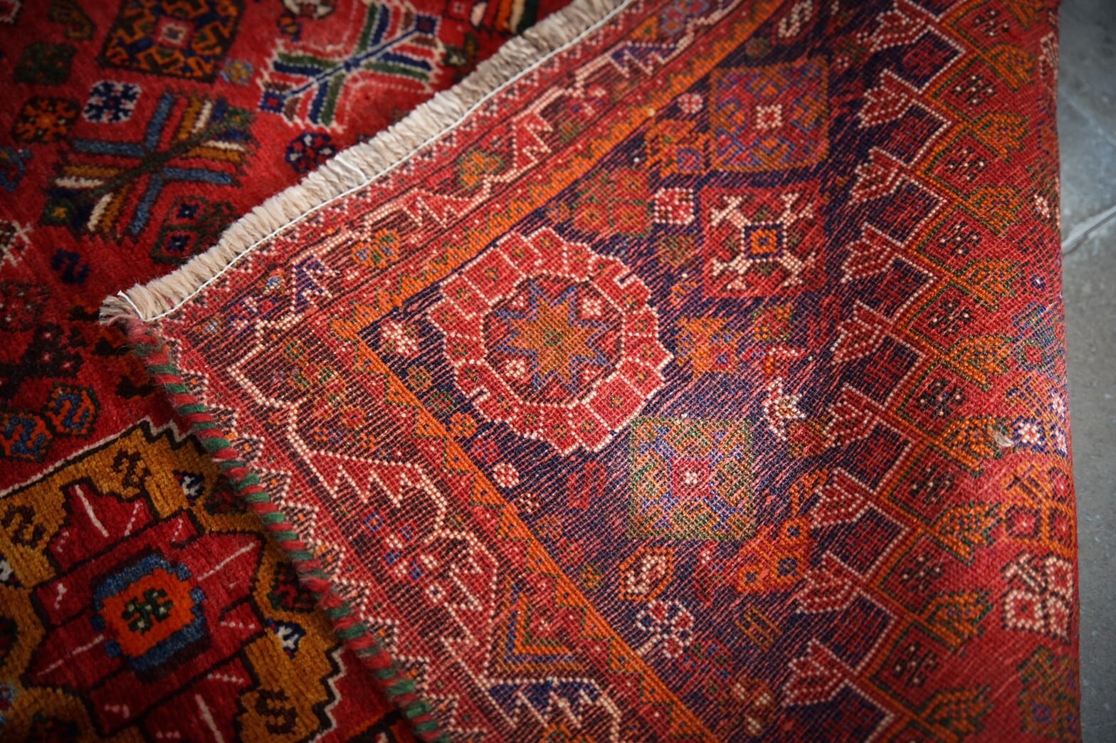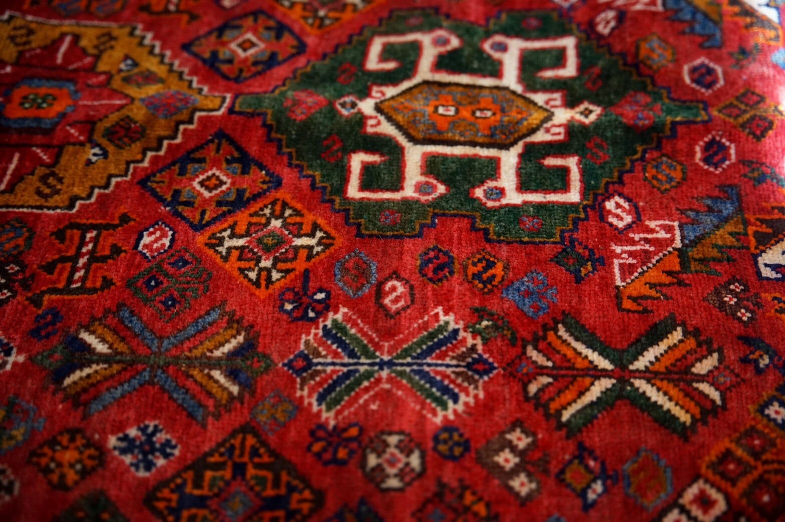 カラフルで華やかな雰囲気の赤系のカシュガイラグ。隅から隅までびっしりと多彩な紋様が描かれておりずっと眺めていたくなるようなラグです。多少の歪みは見られますが、ダメージは全く無い細かい密度の詰まった織りで踏み心地もフカフカでギャッベののような厚みがあります。リビングに敷いたり、ベッドサイド、キッチンラグとしてオススメのサイズです。細部までとってもかわいく見ているだけでワクワクするようなラグ。子供部屋に敷いてもかわいいと思います♪