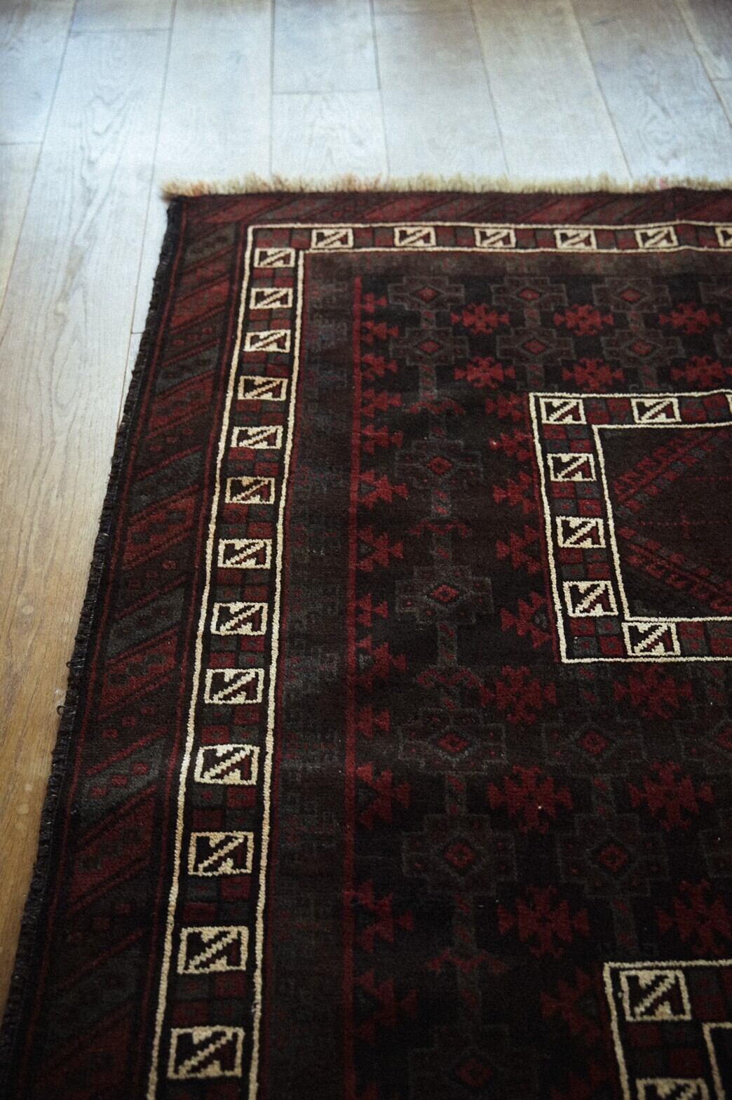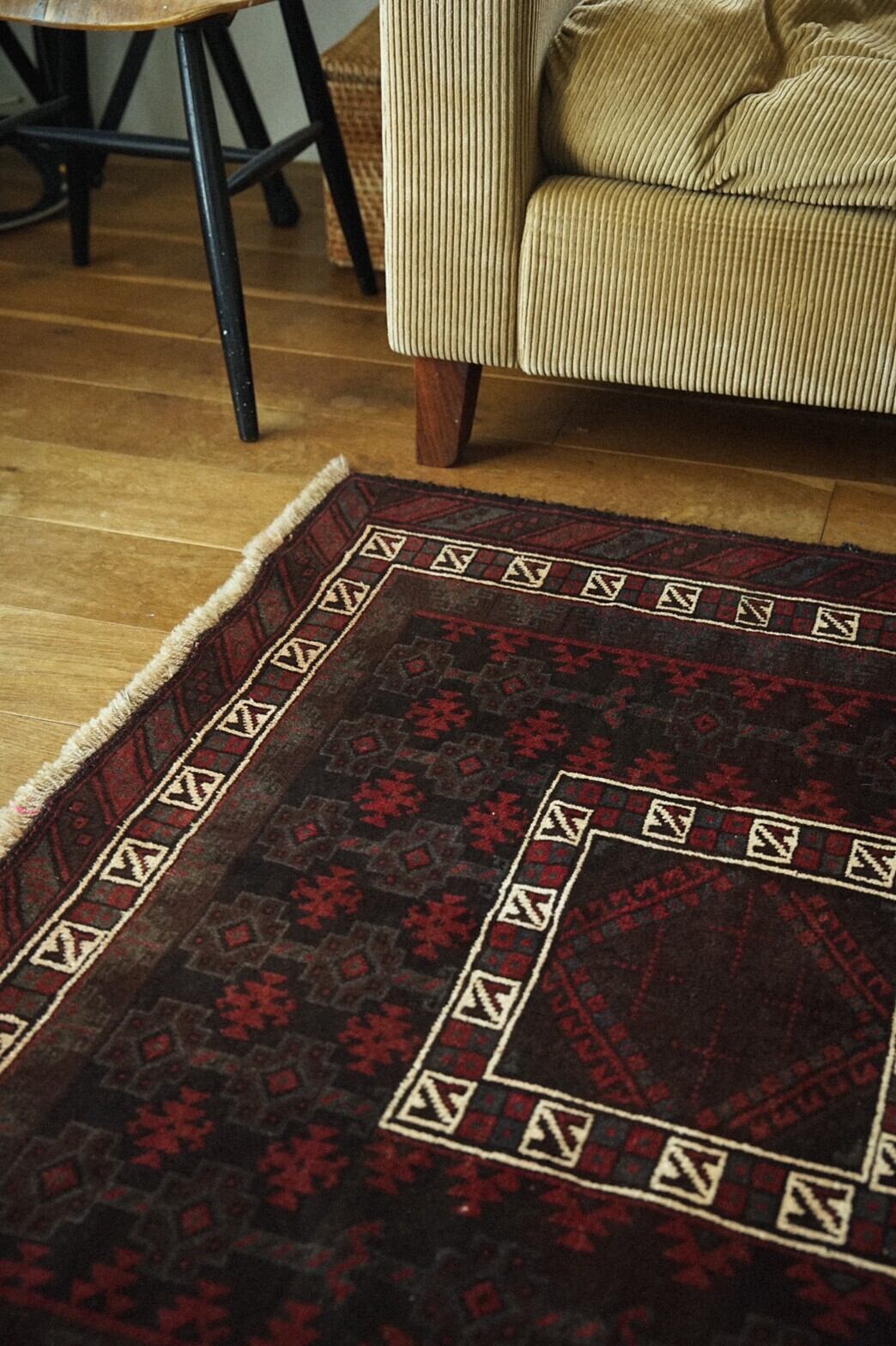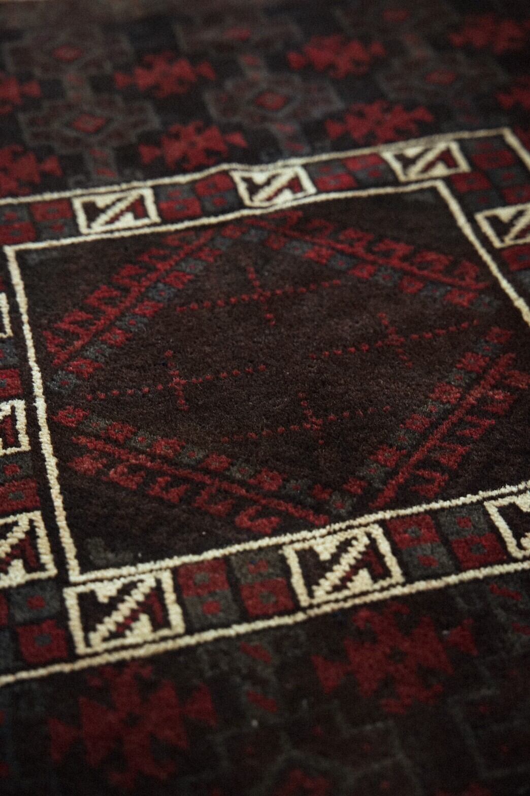 ひと目でバルーチ族とわかるシックな色合いのトライバルラグ 。濃紺に臙脂、黒にこげ茶などを使い暗めの色合いと白色の彩度のメリハリがはっきりするので、全体に描かれた幾何学文様がくっきり浮かび上がって見え「暗闇に光る宝石」という喩えがぴったり。ラグのコンディションは良くノーダメージでフカフカ。自然光に当てるとまた違った色に見え、艶感もある色気のあるラグです。ソファの前やリビング、ベッドサイド、書斎に置くのにちょうど良いサイズです。