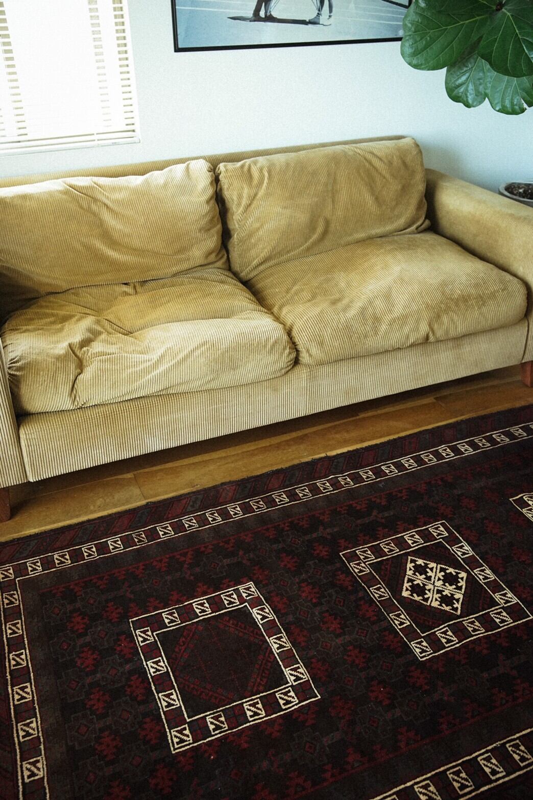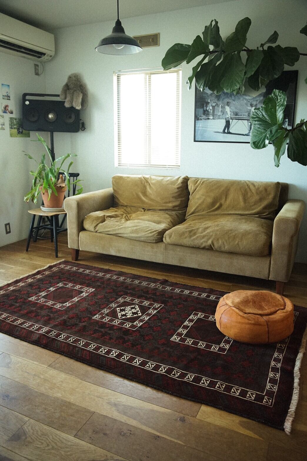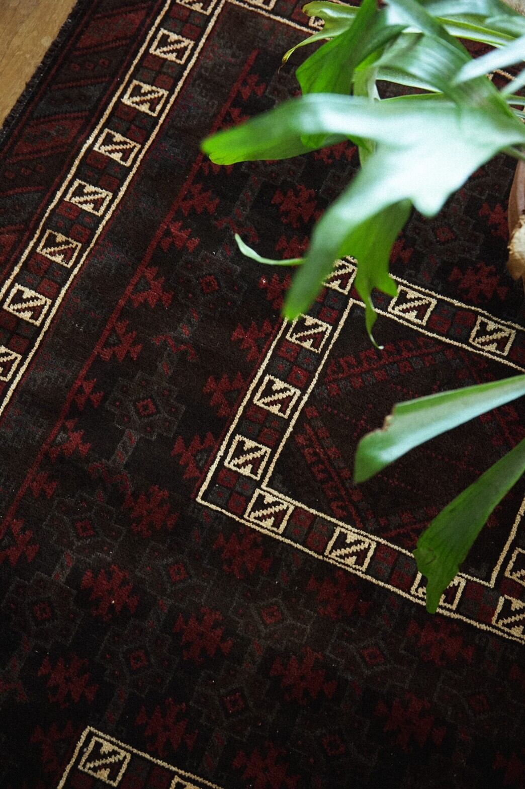 ひと目でバルーチ族とわかるシックな色合いのトライバルラグ 。濃紺に臙脂、黒にこげ茶などを使い暗めの色合いと白色の彩度のメリハリがはっきりするので、全体に描かれた幾何学文様がくっきり浮かび上がって見え「暗闇に光る宝石」という喩えがぴったり。ラグのコンディションは良くノーダメージでフカフカ。自然光に当てるとまた違った色に見え、艶感もある色気のあるラグです。ソファの前やリビング、ベッドサイド、書斎に置くのにちょうど良いサイズです。