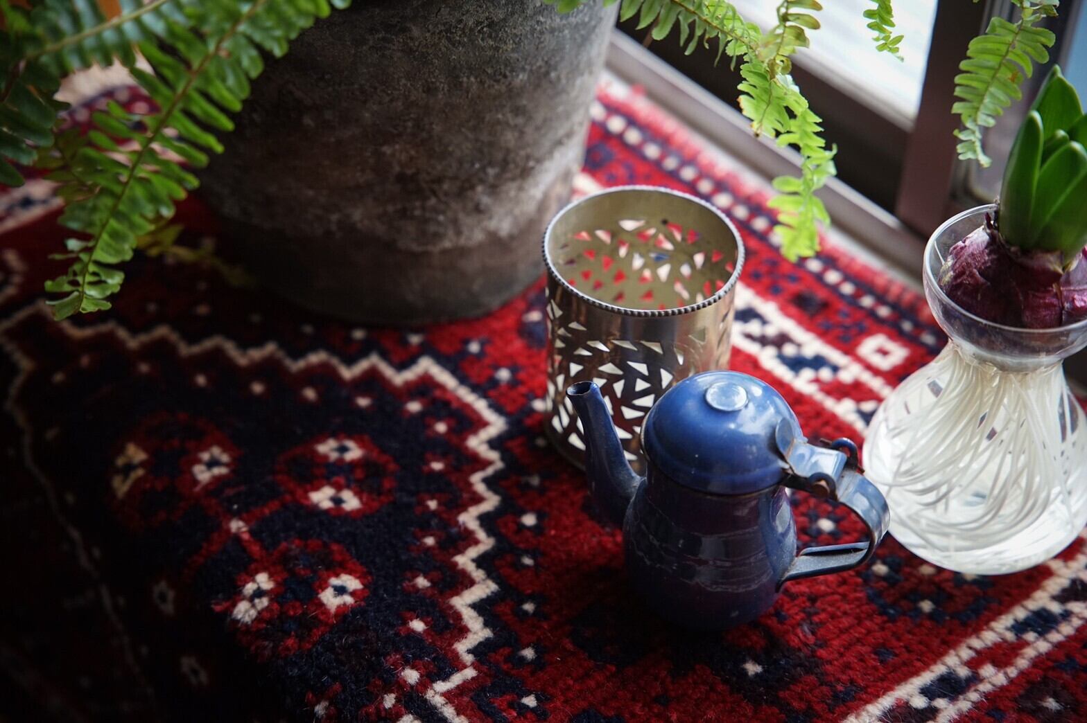 スクエア型のカシュガイラグ。真ん中の菱形メダリオンの周りには花や鳥のモチーフ。特にダメージは無くほどよい厚みがあり手触りも良いです。色合いはネイビー×レッドのシンプルな組み合わせなのでどんなインテリアにも合わせやすいです。窓辺に植物と一緒に敷いたり、チェストの上、ペットのお気に入りにもぜひ!スクエア型なので他のラグと組み合わせて敷いてもいいですね♪