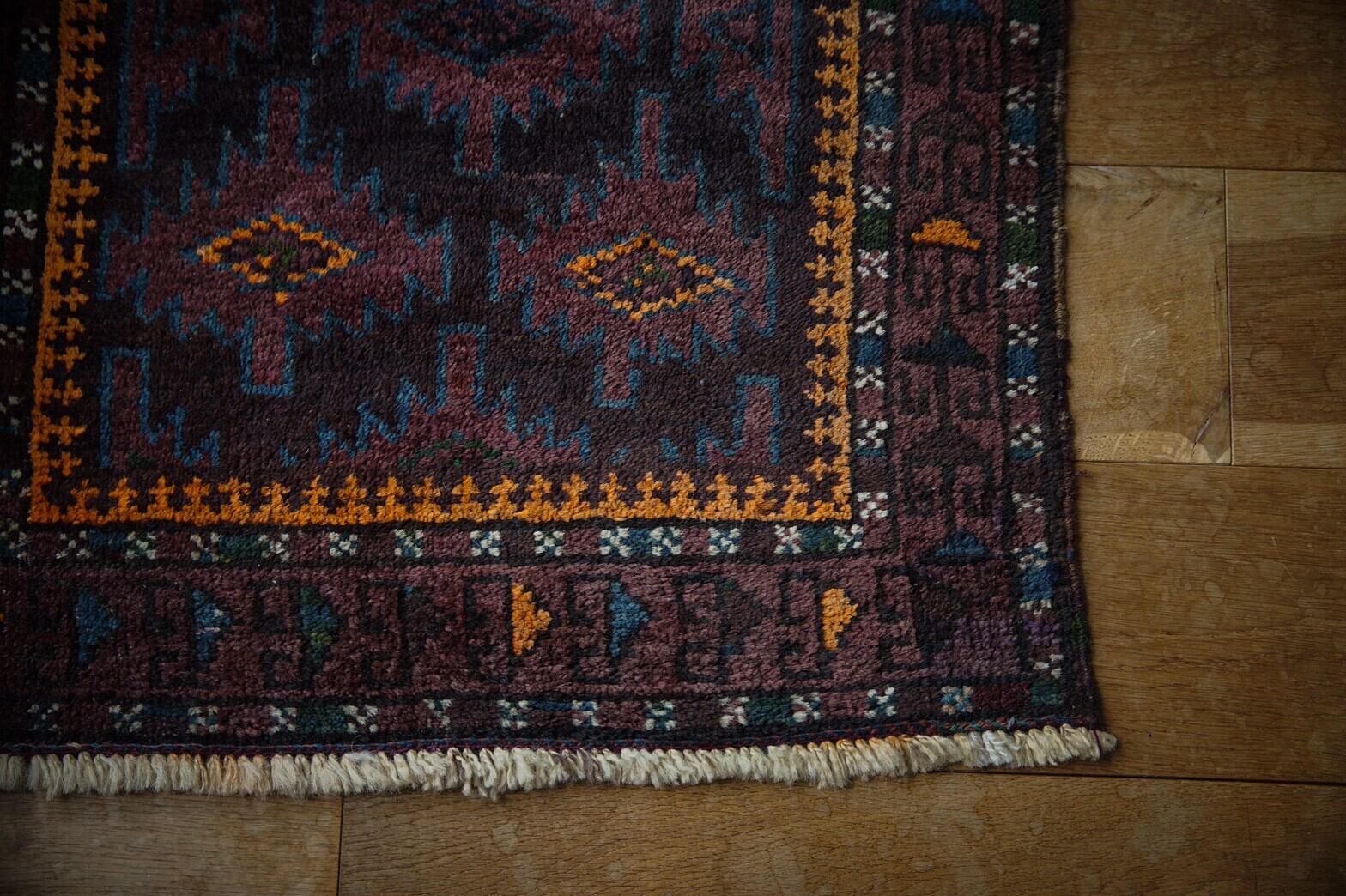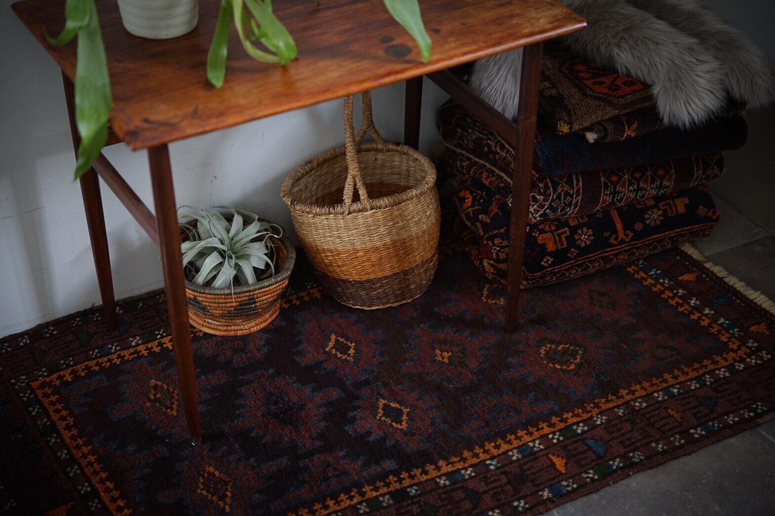 70年前に作られたタイマニ族のラグ 。小豆色のような絶妙な色に青とオレンジが効いています。ボーダー部分の白い小花柄もかわいいですね♪個人的にタイマニラグの素朴でユニークな図柄と柔らかいウールの気持ち良さが大好きなんです。艶もあり、触り心地もとても気持ちいいです。 手織りラグならではの歪みは多少ございますが、他に目立ったダメージや補修跡も無くコンディションは良好です。玄関マットサイズなので日本の住宅事情的には家のあらゆるシーン(キッチン、鏡の前、窓辺、玄関、ペットのお気に入りの場所として)で使い勝手の良いラグです。