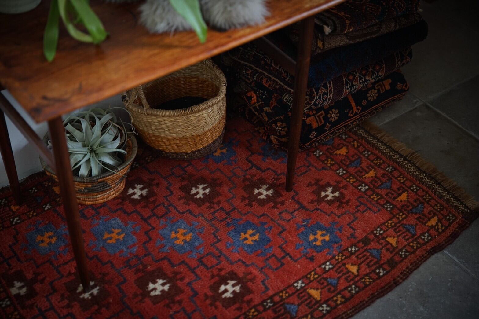 艶々の美しい茜色のマルダリラグ。60年前のアフガニスタン東部にあるナンガルハルで織られたものです。フォールドにはブルーとレンガ色で描かれたメムリンクギュルが並びます。所々で使われた黄色もアクセントになっていて色合いがかわいらしくてたまりません。そして光を当てると美しく輝く艶は経年変化で生まれた賜物。手織りラグならではの歪みは多少ございますが、フワフワとしたパイルは温かく、触り心地もとても気持ちいいですよ♪玄関マットサイズなので日本の住宅事情的には家のあらゆるシーン(キッチン、鏡の前、窓辺、玄関、ペットのお気に入りの場所として)で使い勝手の良いラグです。