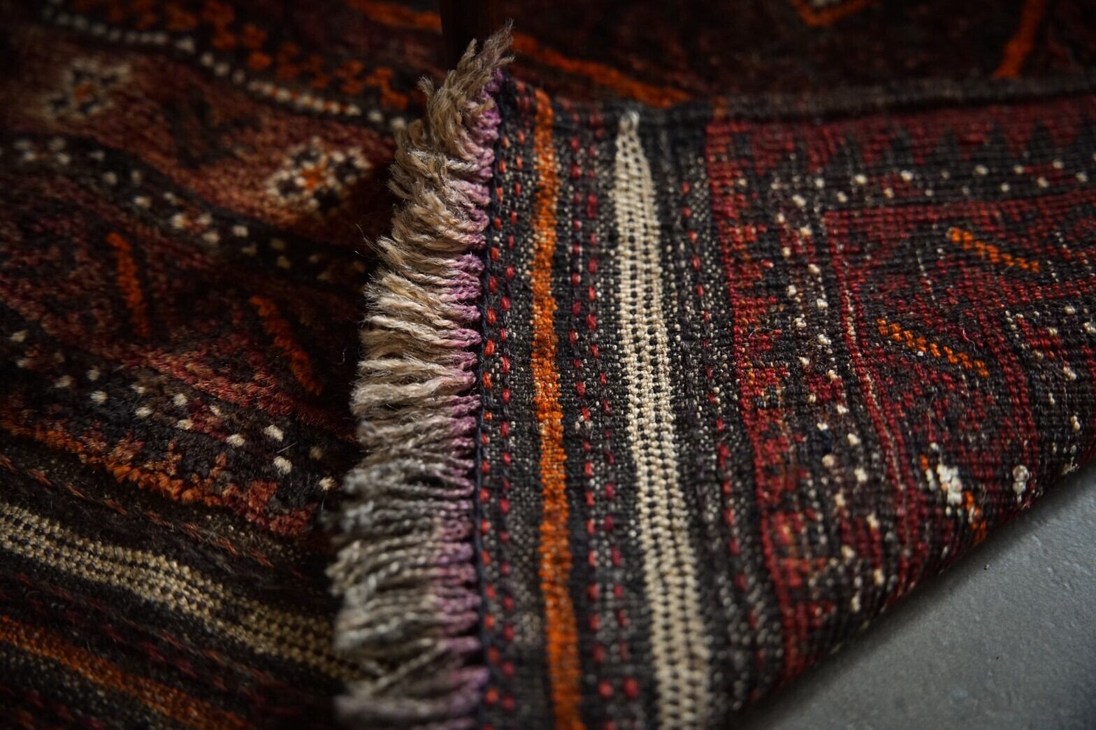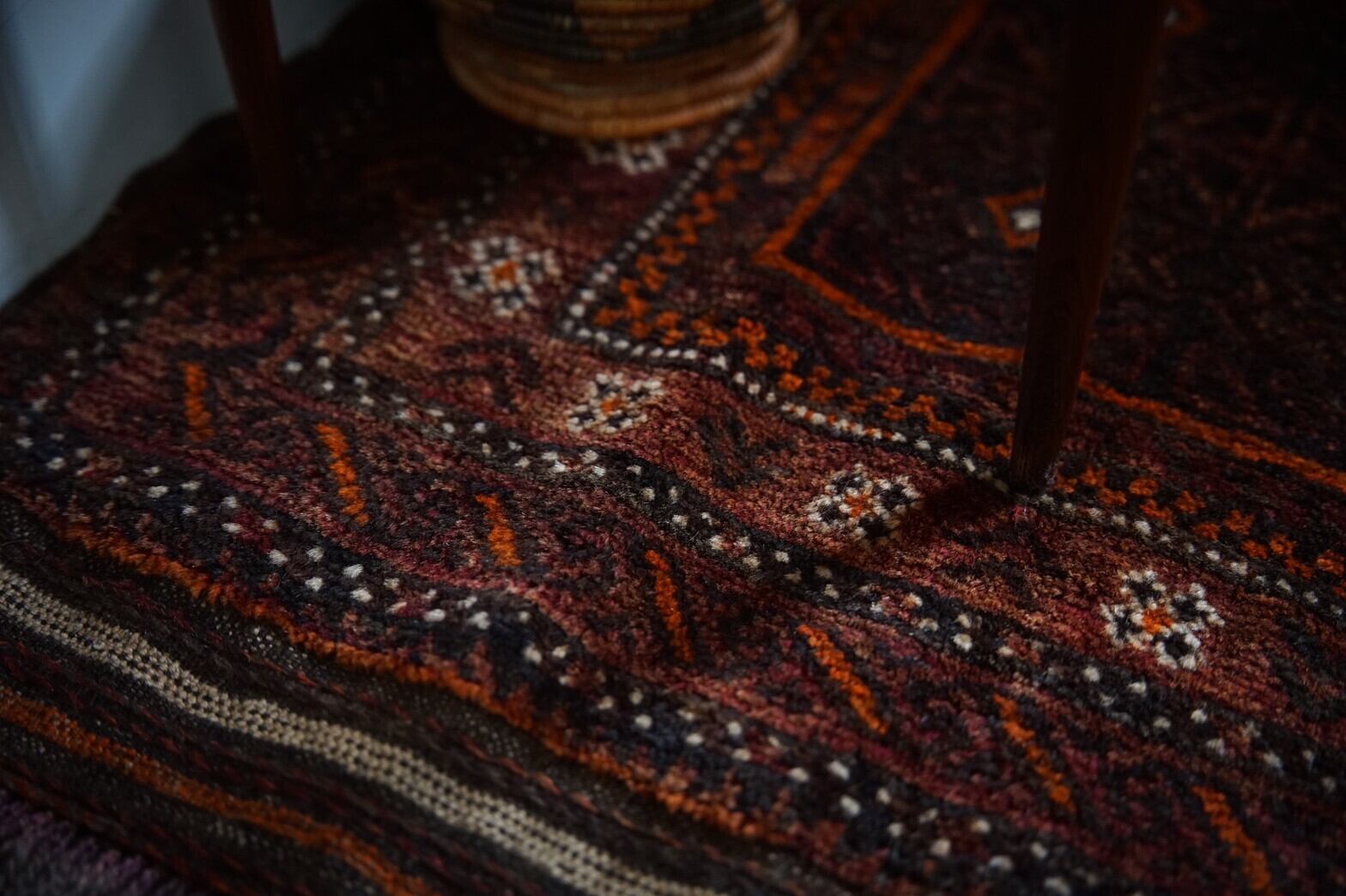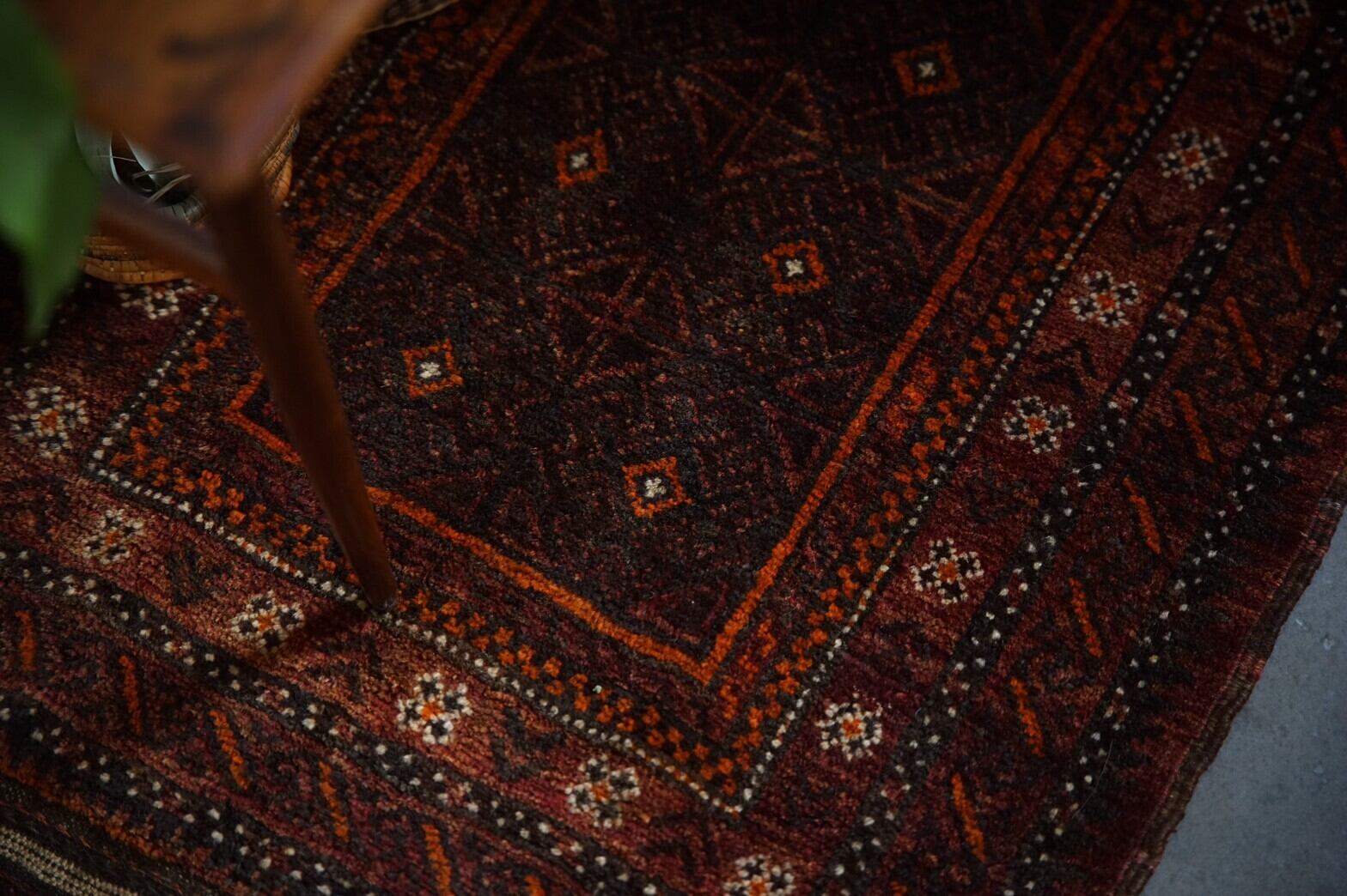 60年前にアフガニスタンのヘラート地方で織られたラグ。ブラウン×オレンジの温かみのある雰囲気が魅力のバルーチラグ。ボーダー部分の花紋様がとてもかわいいです。ダメージや補修跡も特に無く、パイルも残っているのでフカフカで気持ちいいのでぜひ素足で踏みしめてみてください。玄関マットサイズなので日本の住宅事情的には家のあらゆるシーン(キッチン、鏡の前、窓辺、玄関、ペットのお気に入りの場所として)で使い勝手の良いラグです。