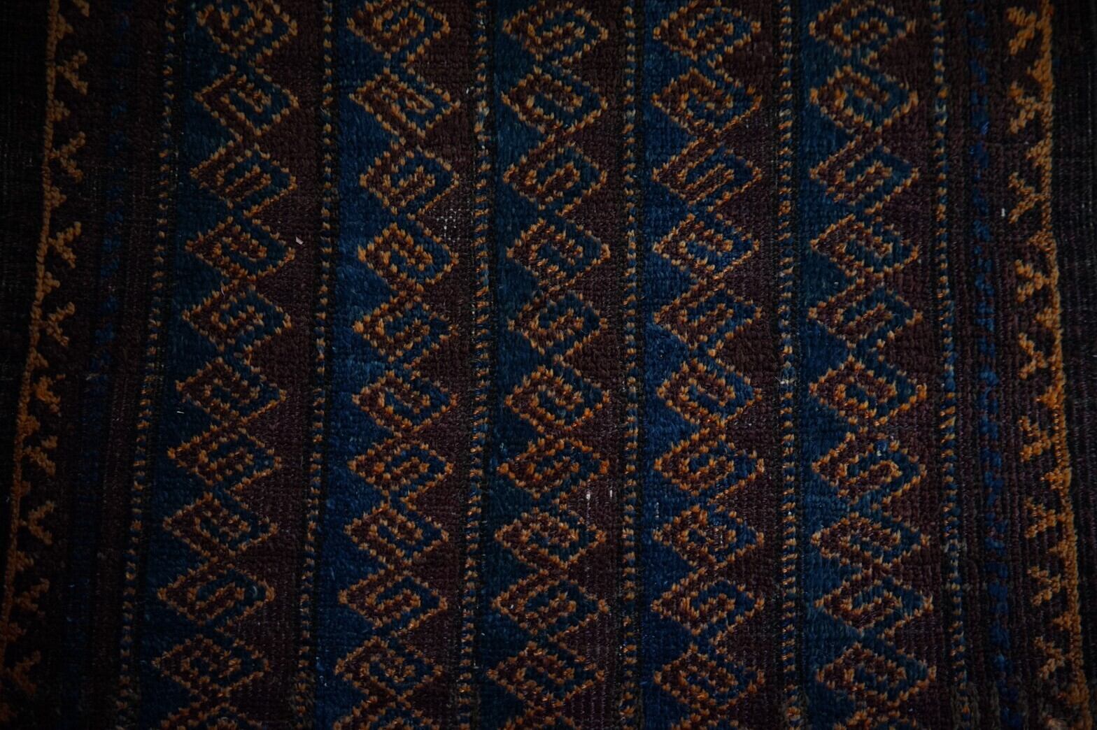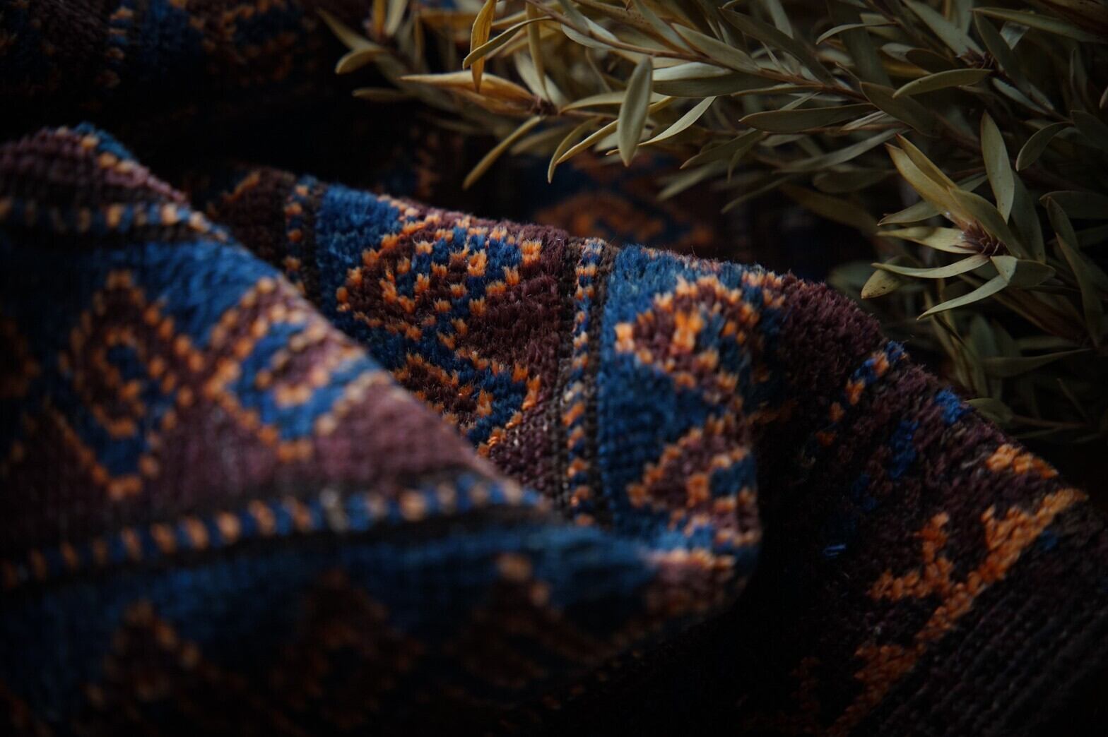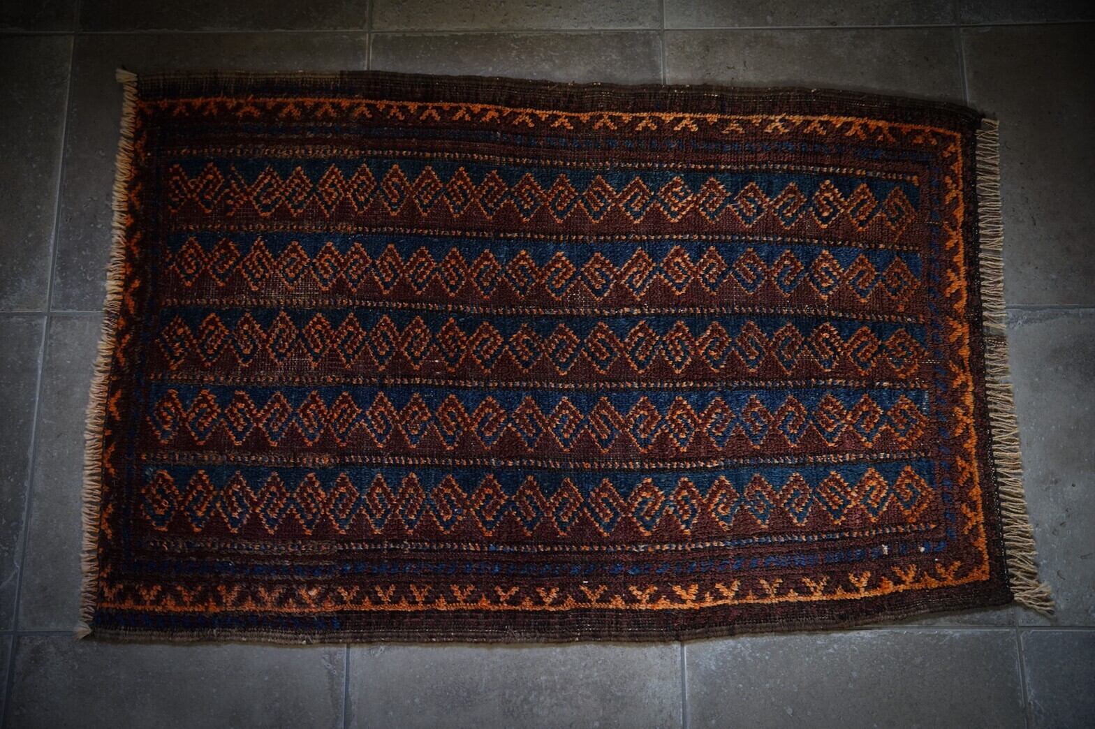 ブラウンベースにチェーンの連続紋様が描かれたバルーチラグ。落ち着いた色合いに美しいブルーが映えます。主張が強すぎないデザインと手触りがすべすべと気持ちいいラグなので初めてトライバルラグを購入する方にもおすすめです。手織り特有の歪みと少しパイルが低くなっている箇所がございますがそこも含めて全て愛おしく感じてくれる方にのみオススメします。玄関マットサイズなので日本の住宅事情的には家のあらゆるシーン(キッチン、鏡の前、窓辺、玄関、ペットのお気に入りの場所として)で使い勝手の良いラグです。
