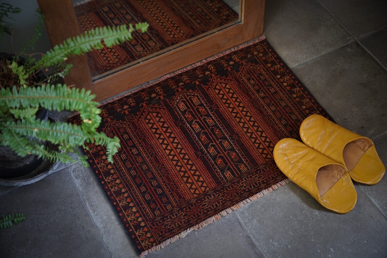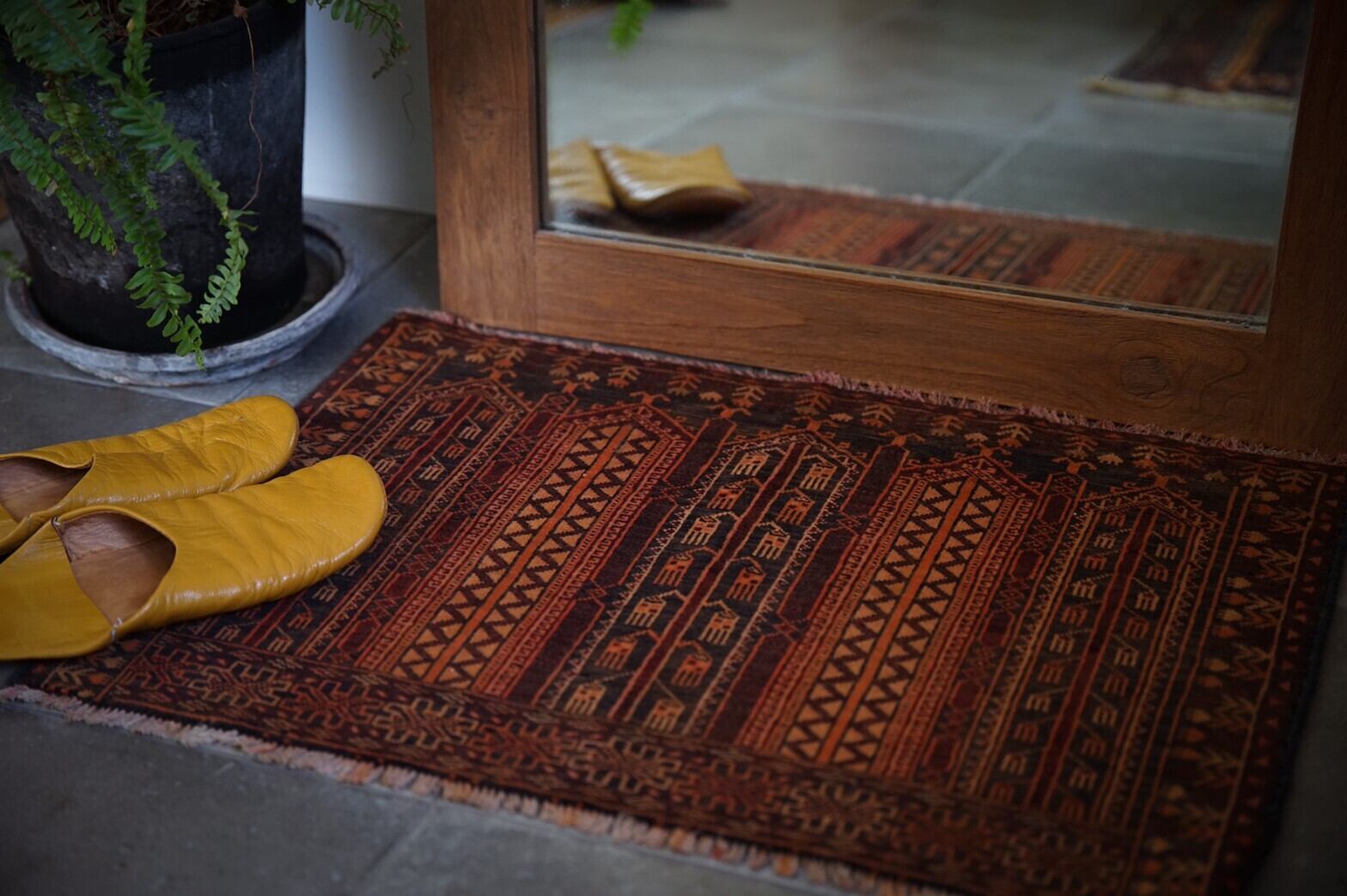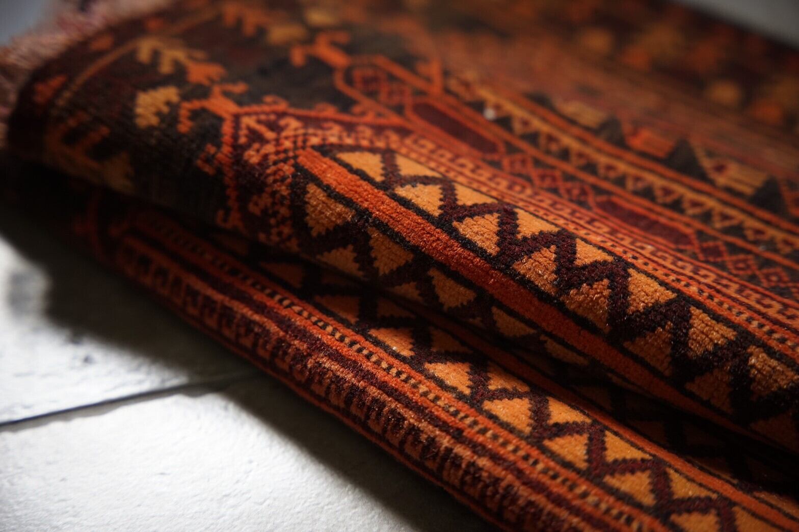 ミニサイズのアリホジャラグ。ブロケードと言われるレースのような細かい模様が描かれているのが特徴の美しいラグです。ブラウン×オレンジベースのシンプルな色合いなのでラグ初心者の方にもおすすめです。パイルは短く薄手ですが、織りがしっかりしていて目が細かく触るとしっとり滑らかですべすべ。ダメージもなくコンディションは良好。このサイズのものは中々見ないのでお探しの方はぜひ。窓辺や、チェストの上、植物を置いたり姿見の前に敷いたりするのがおすすめです。