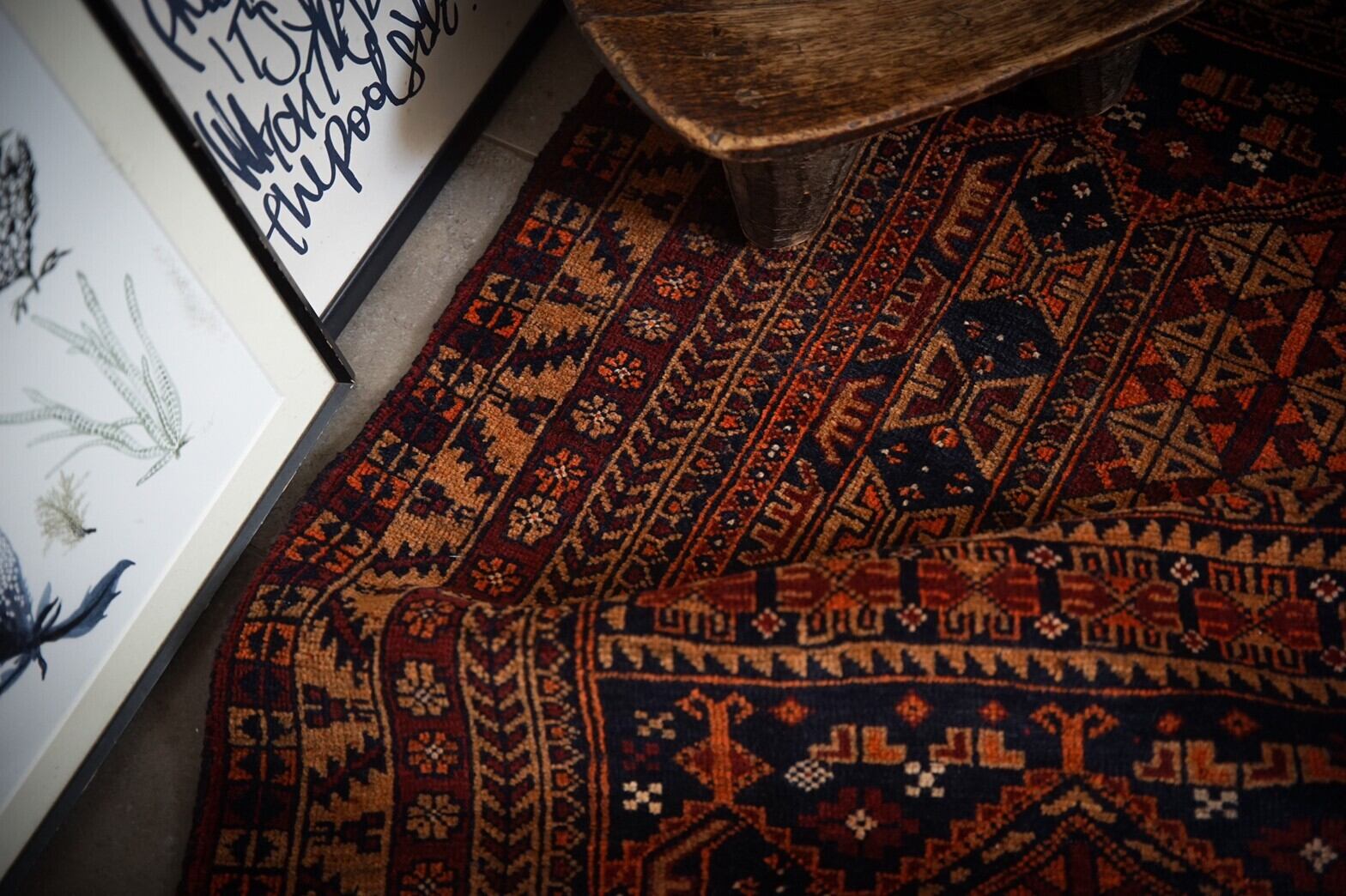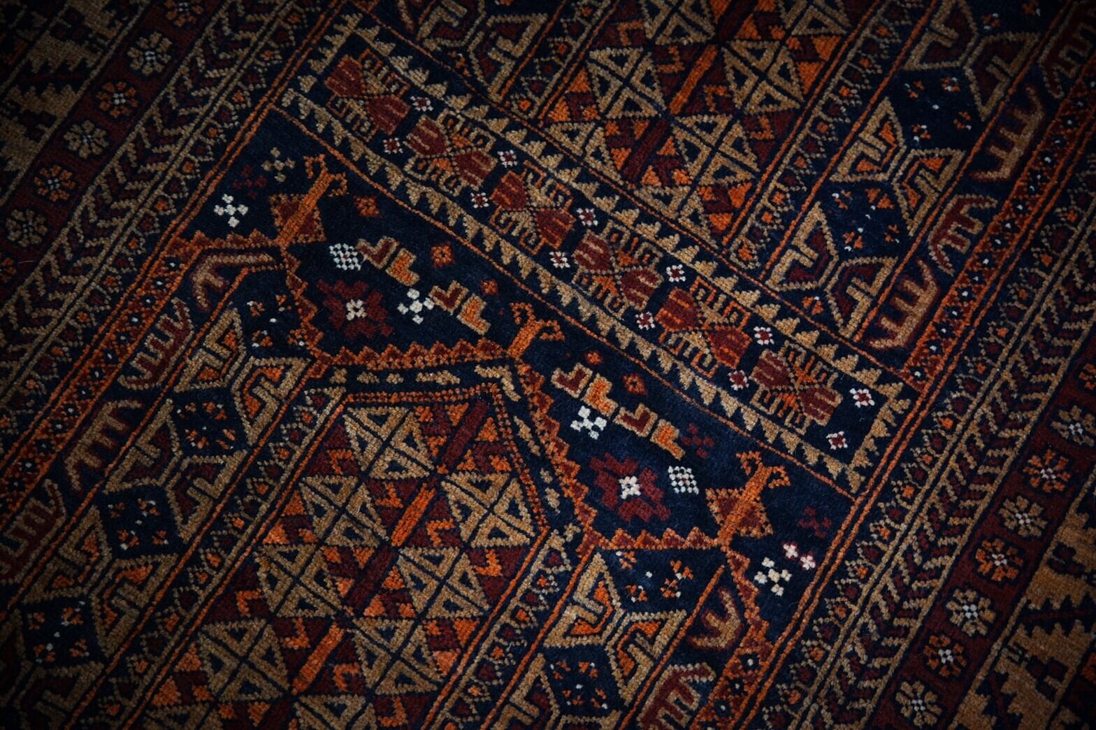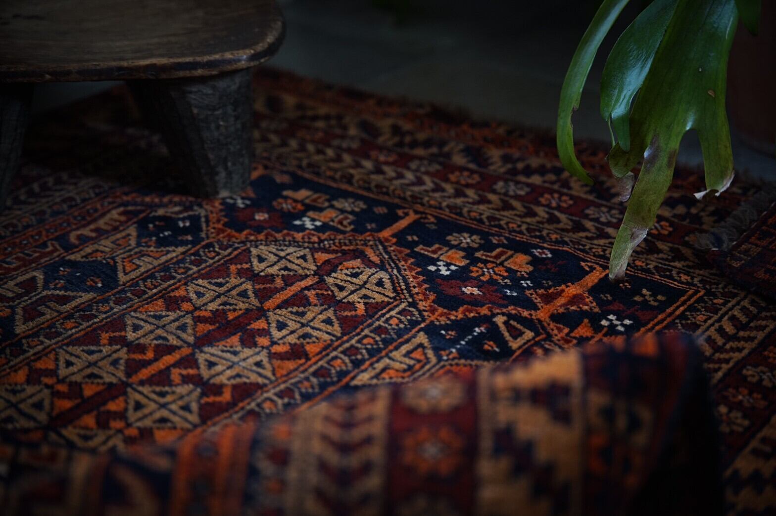 アフガニスタンにある工房で作られたアリホジャと呼ばれるラグ。ブロケードと言われるレースのような細かい模様が描かれているのが特徴の美しいラグです。こちらのアリホジャラグにはボーダー部分に小花柄の紋様がたくさん描かれているのがとてもかわいらしいです。オレンジ×ネイビーを基調とした落ち着いた色合いはインテリアにも馴染みやすいかと思います。パイルは少し短めですが、ダメージはなく触り心地もすべすべと気持ちいいです。こちらのラグはデザイン的にも品質的にもかなりいいものだと現地セラーのお墨付きです♪リビングや書斎に敷いたり、ベッドサイド、姿見の前にオススメの使いやすいサイズです。