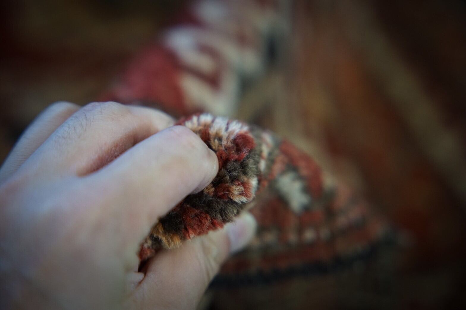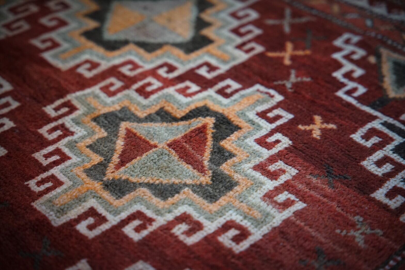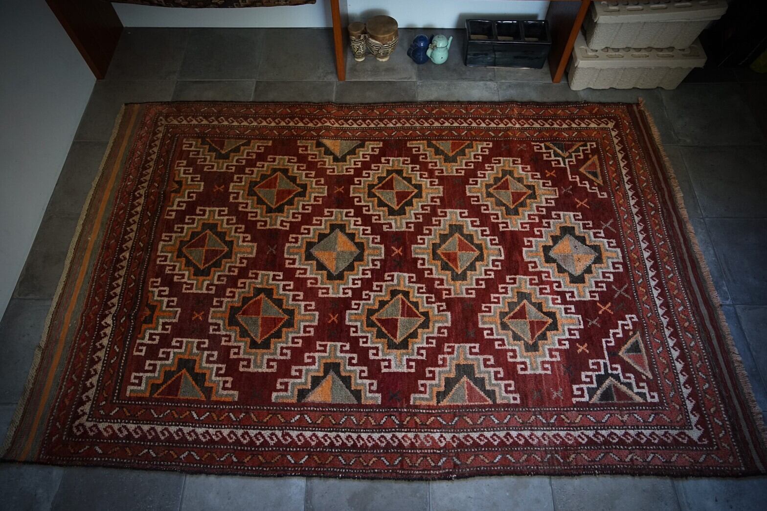 80年前にアフガニスタンのヘラート地方で作られたタイマニラグ。えんじ色がベースのフィールドにはメムリンクギュルが並び、ボーダー部分には水の流れを表すモチーフが描かれています。タイマニの素朴でユニークな色使いとデザインが見る人の心を温めてくれるようなラグ。フリンジ部分はキリムエンドになっておりかっこいいです。柔らかなウールを使用しており、フカフカで肌触りも最高。パイルの減りやダメージもなくグッドコンディション。リビングに敷いたり、ベッドサイド、キッチンラグとしてオススメのサイズです。