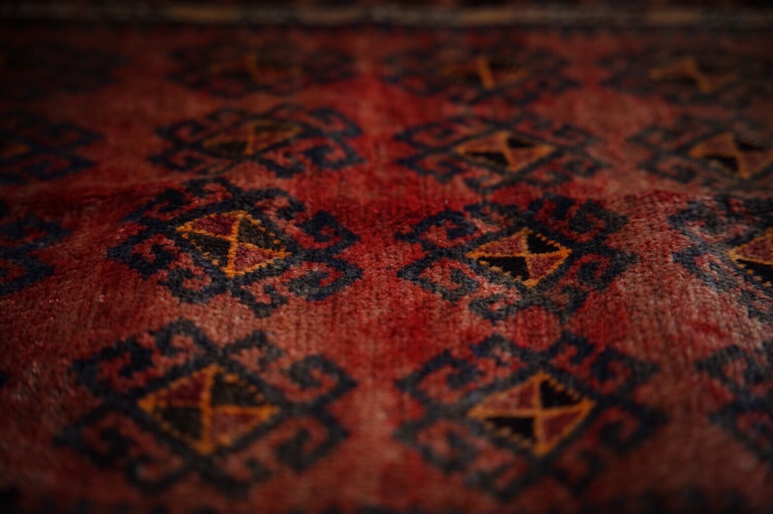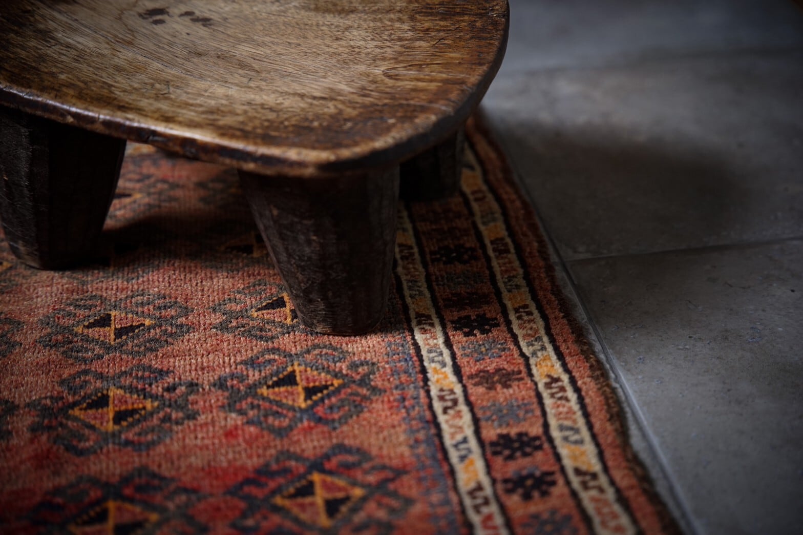 アブラッシュと呼ばれる色のグラデーションが空が白み始める空から眩しい光を放つ朝焼けの特別な時間のようでとても美しいバルーチラグ。フィールドにはフックドメダリオンの連続紋様。ボーダー部分に使われているイエローもアクセントになっていています♪フリンジはキリムエンドになっています。手織りラグならではの歪みがありますが、その他目立ったダメージや補修跡はなくパイルは艶々で触り心地も滑らか。玄関マットサイズなので日本の住宅事情的には家のあらゆるシーン(キッチン、鏡の前、窓辺、玄関、ペットのお気に入りの場所として)で使い勝手の良いラグです。