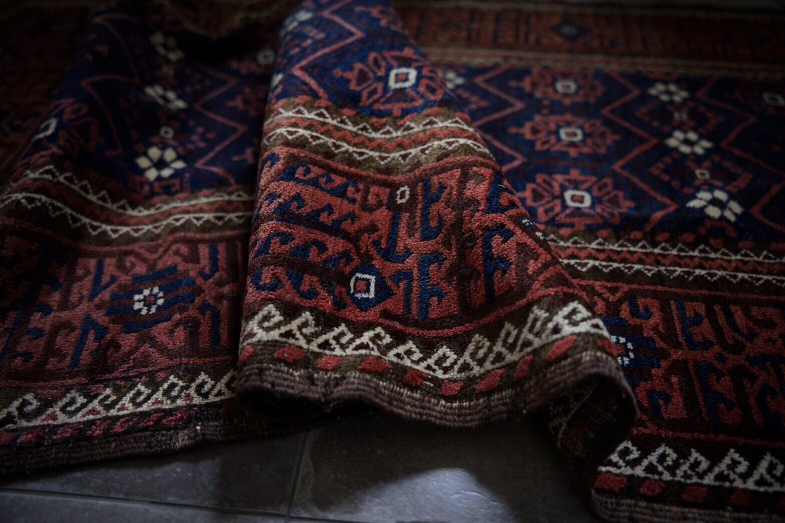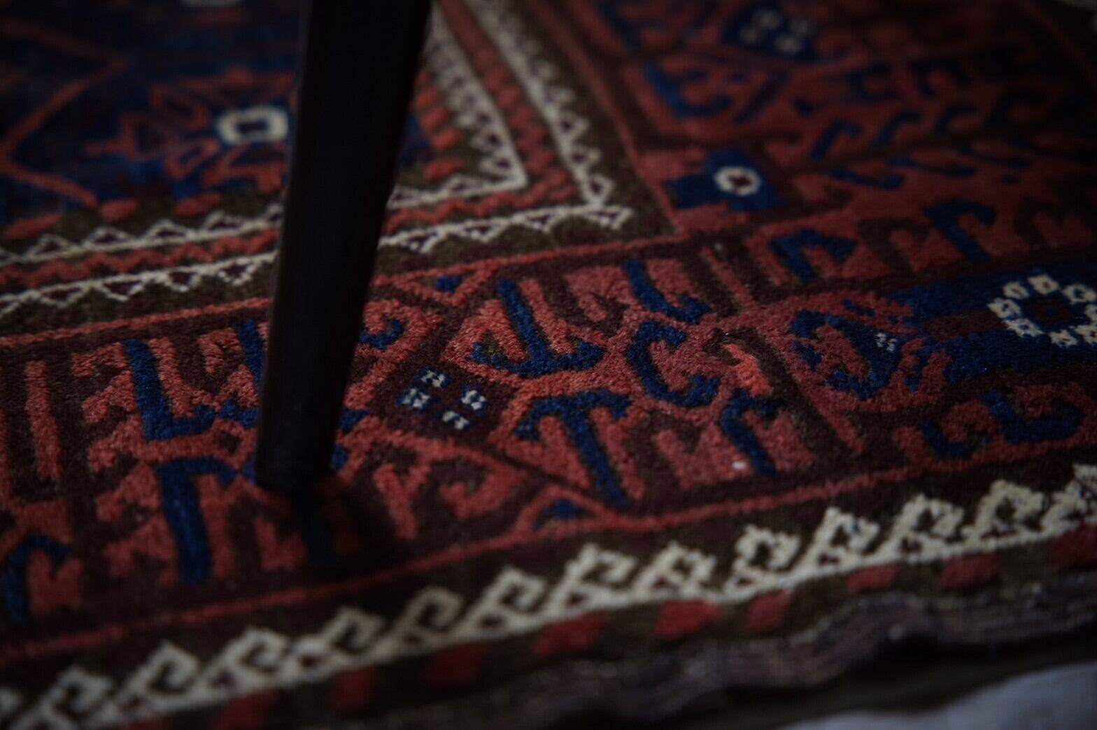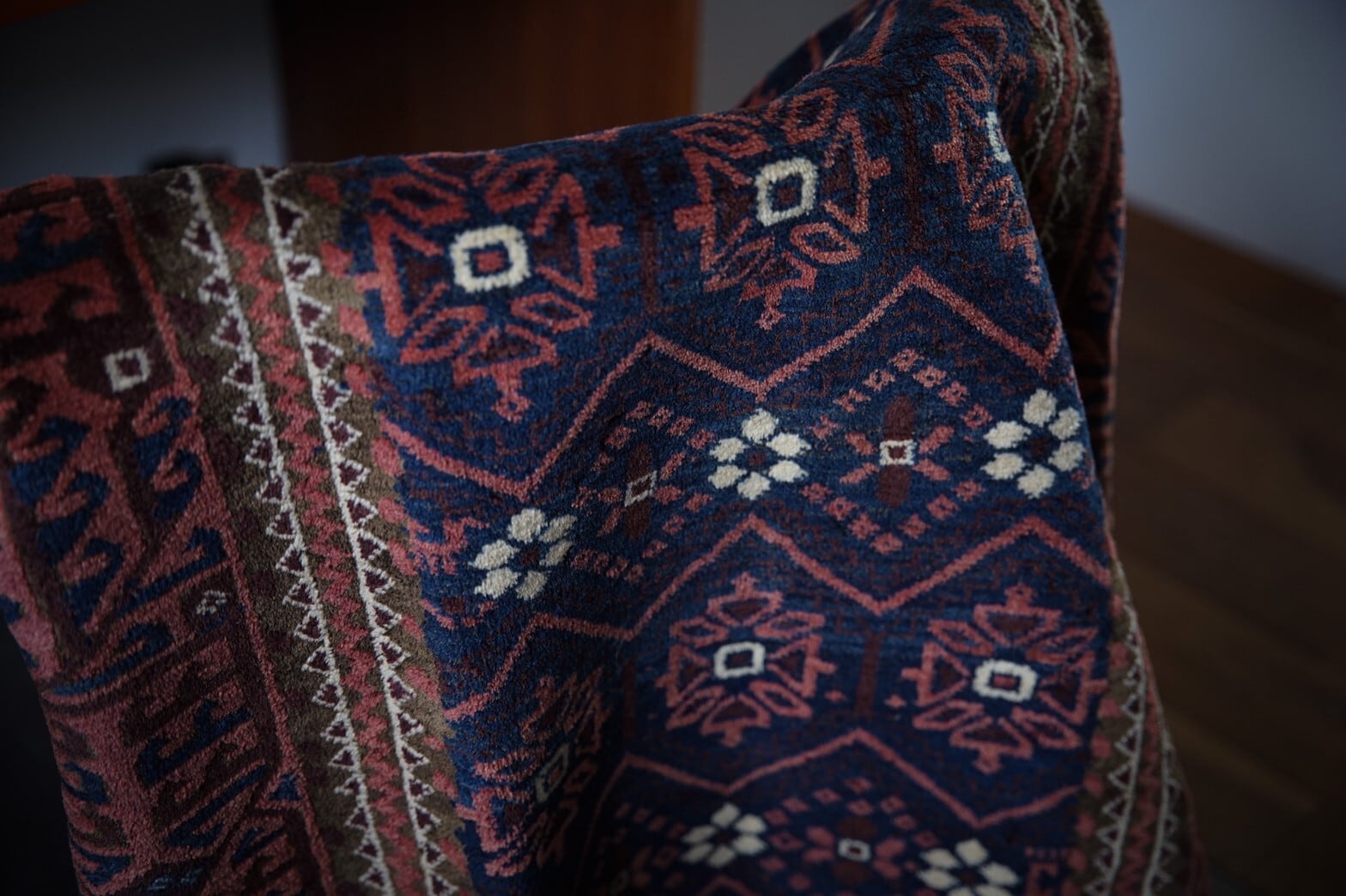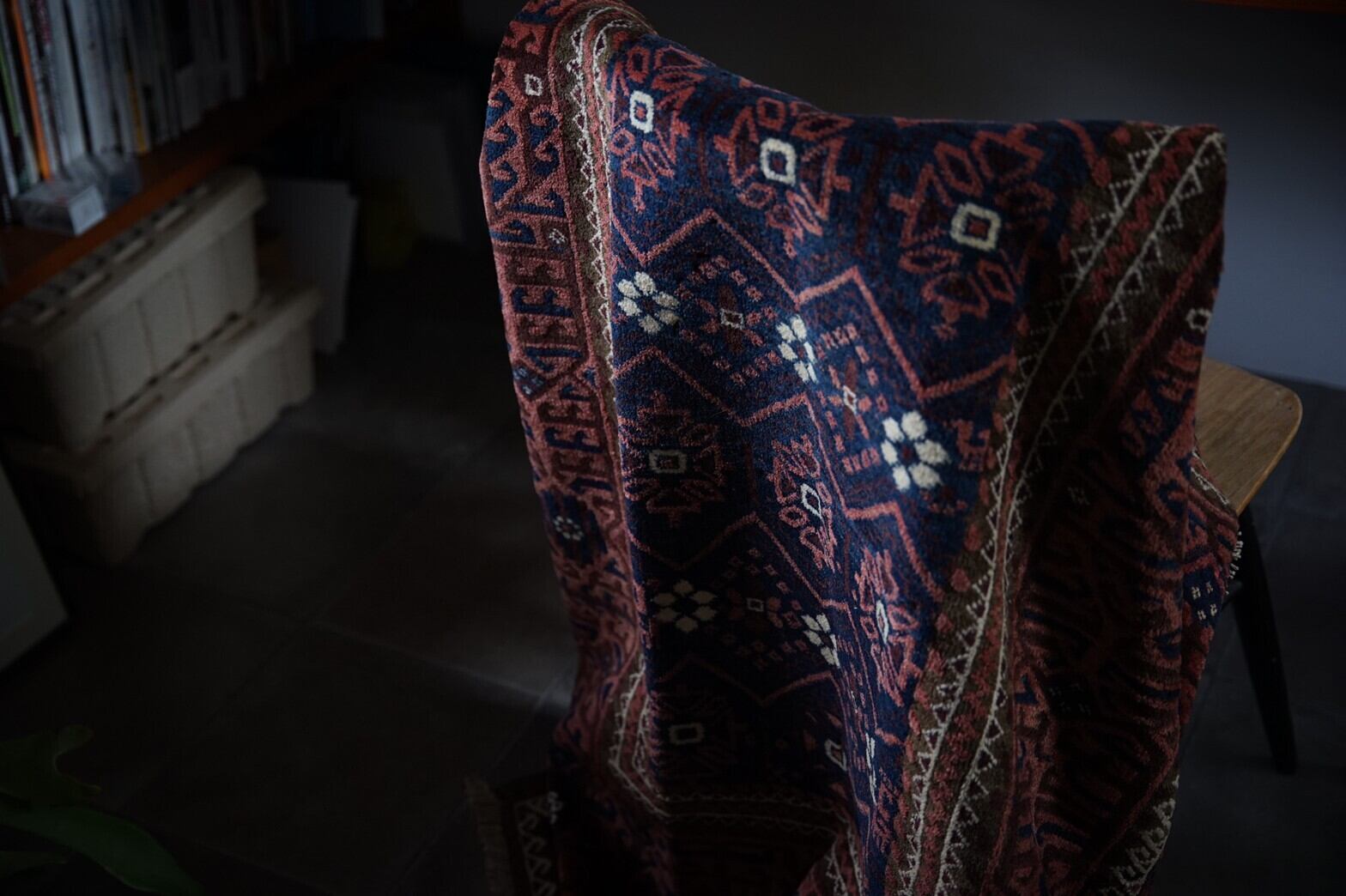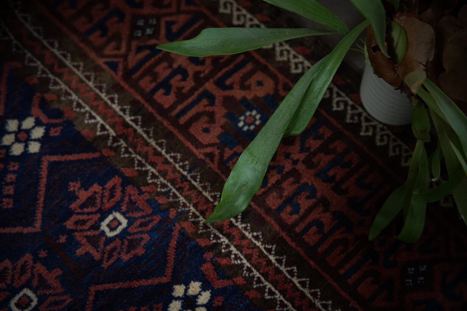 ネイビーのフィールドに浮かび上がるのは曙色のようなくすんだピンクとオリーブグリーンがとても美しいラグ。画像を見て頂くとわかりますが、模様が立体的に浮かび上がっているように織られています。そして真ん中に並ぶ白い小花が全体の雰囲気をとてもかわいらしくしてくれていますね♪手織り特有の歪みは多少ございますが、目立ったダメージや補修跡もなくグッドコンディション。リビングに敷いたり、ベッドサイド、キッチンラグとしてオススメのサイズです。