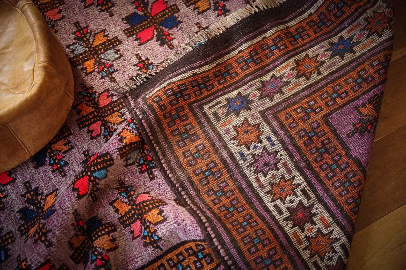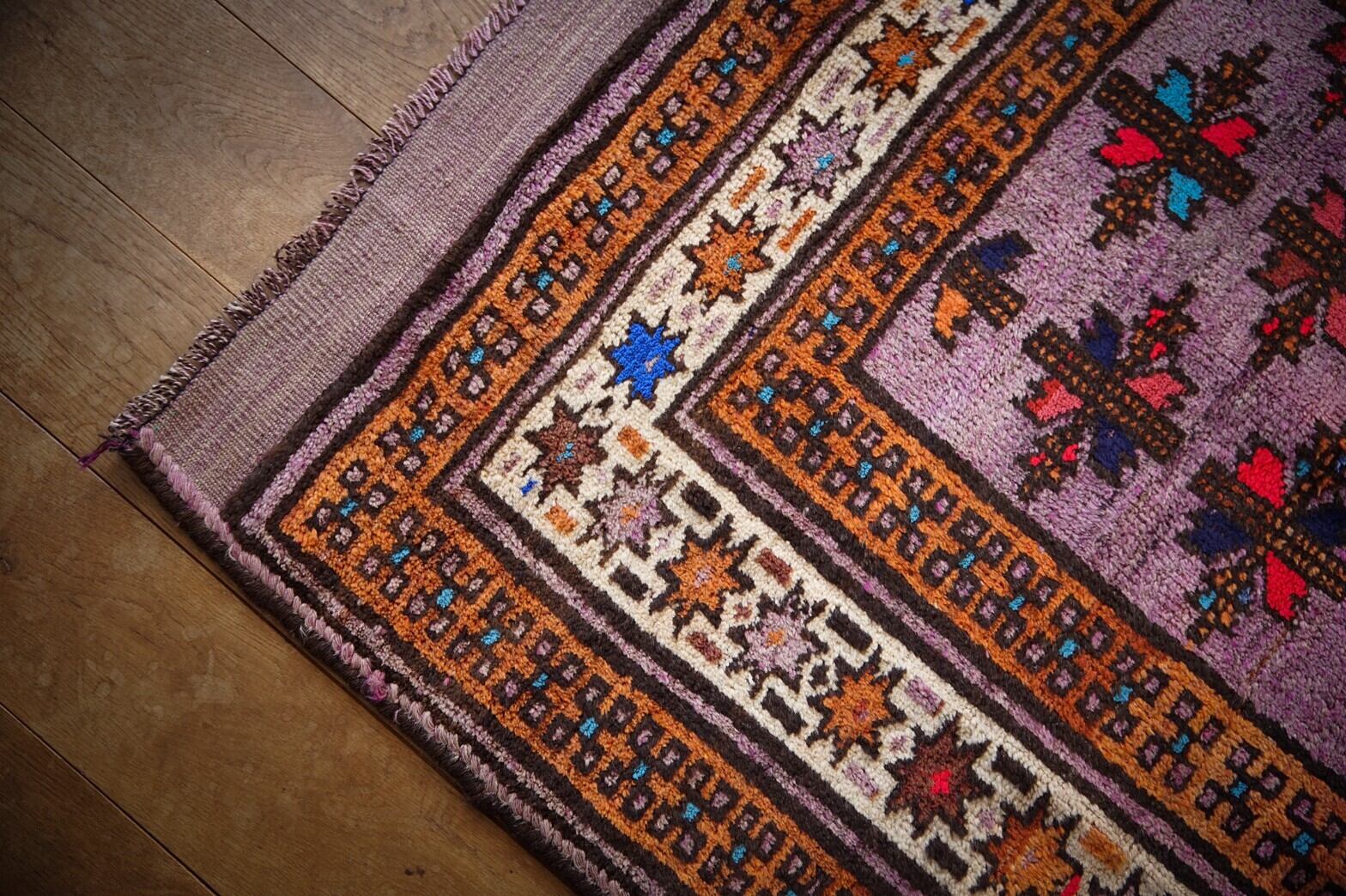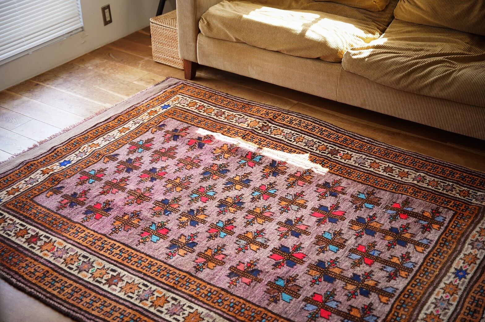カラフルでポップな雰囲気がとてもおしゃれなタイマニラグ。ピンク〜パーブルをベースにフィールドにはチナールと呼ばれる葉っぱ紋様がカラフルな色合いで描かれています。ボーダー部分の八角星もとてもかわいらしいです。フリンジ部分はキリムエンドとなっています。大きなダメージや補修跡は特になく、パイルは少し長めでフカフカ。持つと重量感あります。リビングに敷いたり、ベッドサイド、キッチンラグとしてオススメのサイズです。子供部屋に敷くのもおすすめです♪