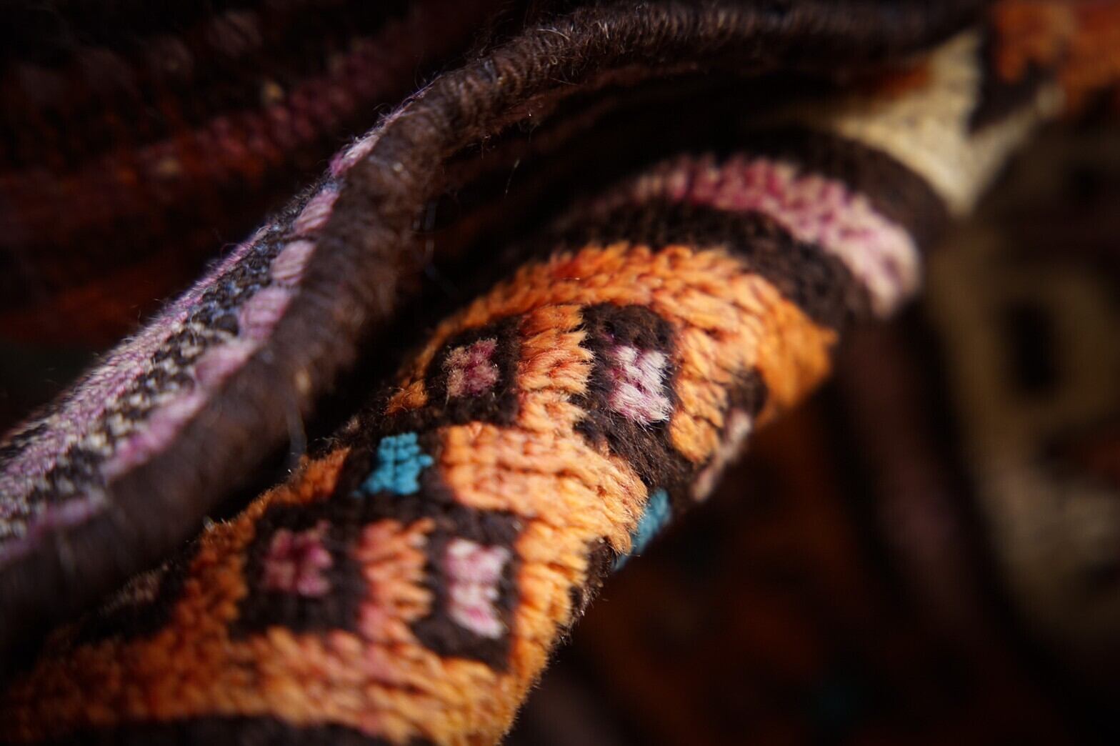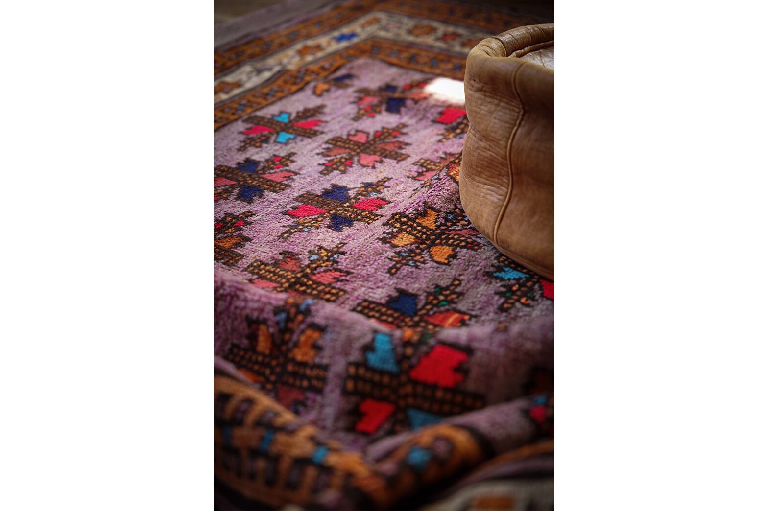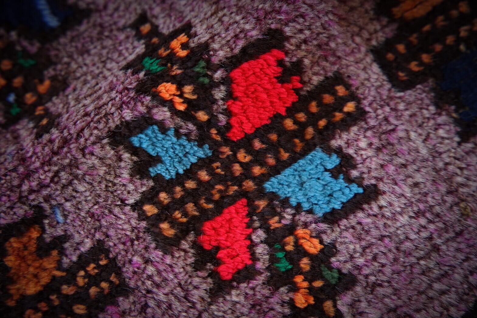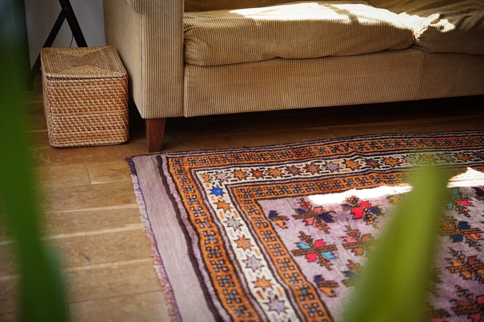 カラフルでポップな雰囲気がとてもおしゃれなタイマニラグ。ピンク〜パーブルをベースにフィールドにはチナールと呼ばれる葉っぱ紋様がカラフルな色合いで描かれています。ボーダー部分の八角星もとてもかわいらしいです。フリンジ部分はキリムエンドとなっています。大きなダメージや補修跡は特になく、パイルは少し長めでフカフカ。持つと重量感あります。リビングに敷いたり、ベッドサイド、キッチンラグとしてオススメのサイズです。子供部屋に敷くのもおすすめです♪