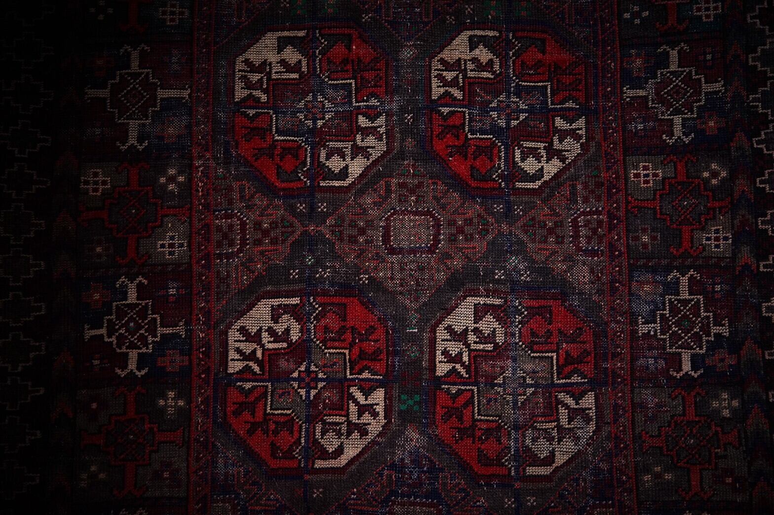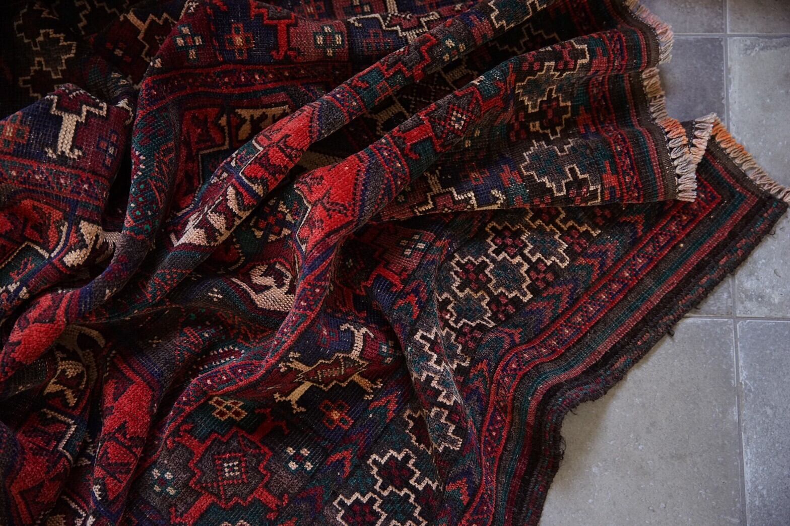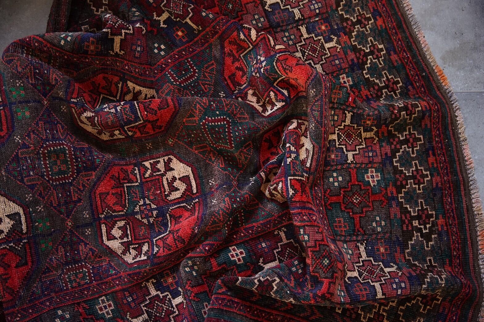 擦れてクタクタになったヴィンテージ感あるラグに惹かれる方へ。80年前のアフガニスタン、ザブールで作られたバルーチラグ。赤味がかったブラウンとカーキがベースにギュル部分に使用されているグリーンがとてもかっこいいです!ラグの半分は擦れがありパイルが低くなっておりますが、もう半分はパイルもキレイに残っており一枚で色んなニュアンスが楽しめます。経年変化による擦れが本当にかっこいいです。パイルは短めで少し薄手ですが触り心地も気持ちよく丈夫な作り。ソファの前やリビング、書斎、ベッドサイドに置くのにちょうど良いサイズです。