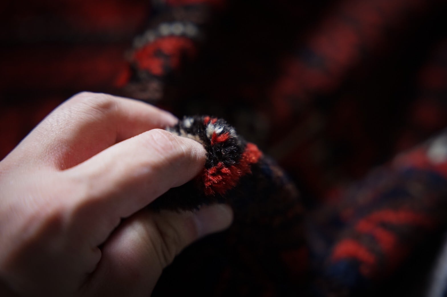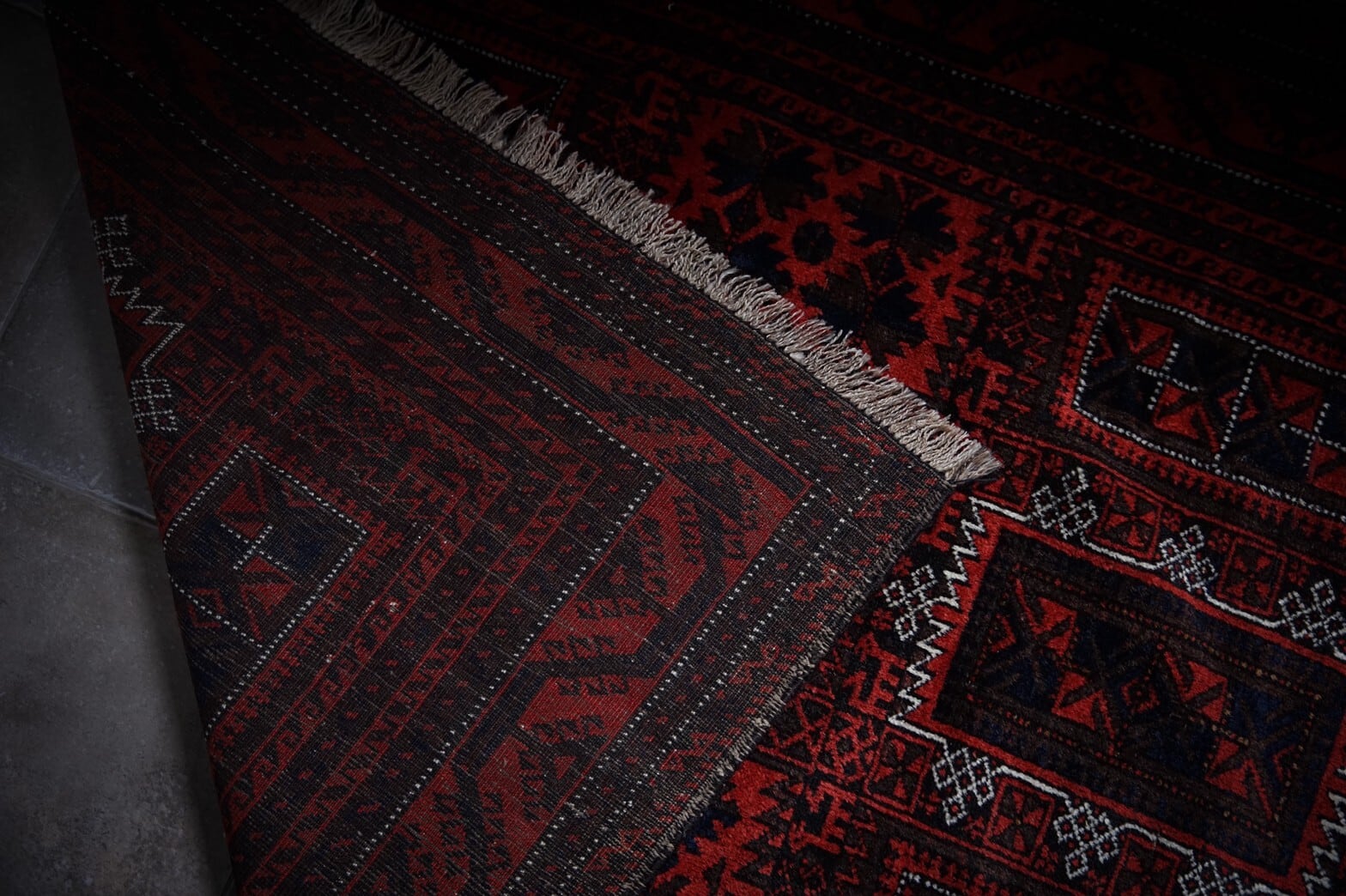 80年前のラグとは思えないぐらいとてもコンディションが良く艶もあり美しいラグ。赤系のラグをお探しの方でかっこいい雰囲気のものがお好み方におすすめなラグ。配色も赤ベースにネイビー、アイボリー、ダークブラウンのシンプルな色使いだからこそデザインのかっこよさがとても引き立っています。ダメージは特になし。パイルは長すぎず短かすぎずのちょうどいい長さでツヤツヤ。触ると滑らかですべすべと気持ちいいです。ソファの前やリビング、書斎、ベッドサイドに置くのにちょうど良いサイズです。男性のお部屋や無骨な雰囲気のインテリアにもかなりおすすめです。
