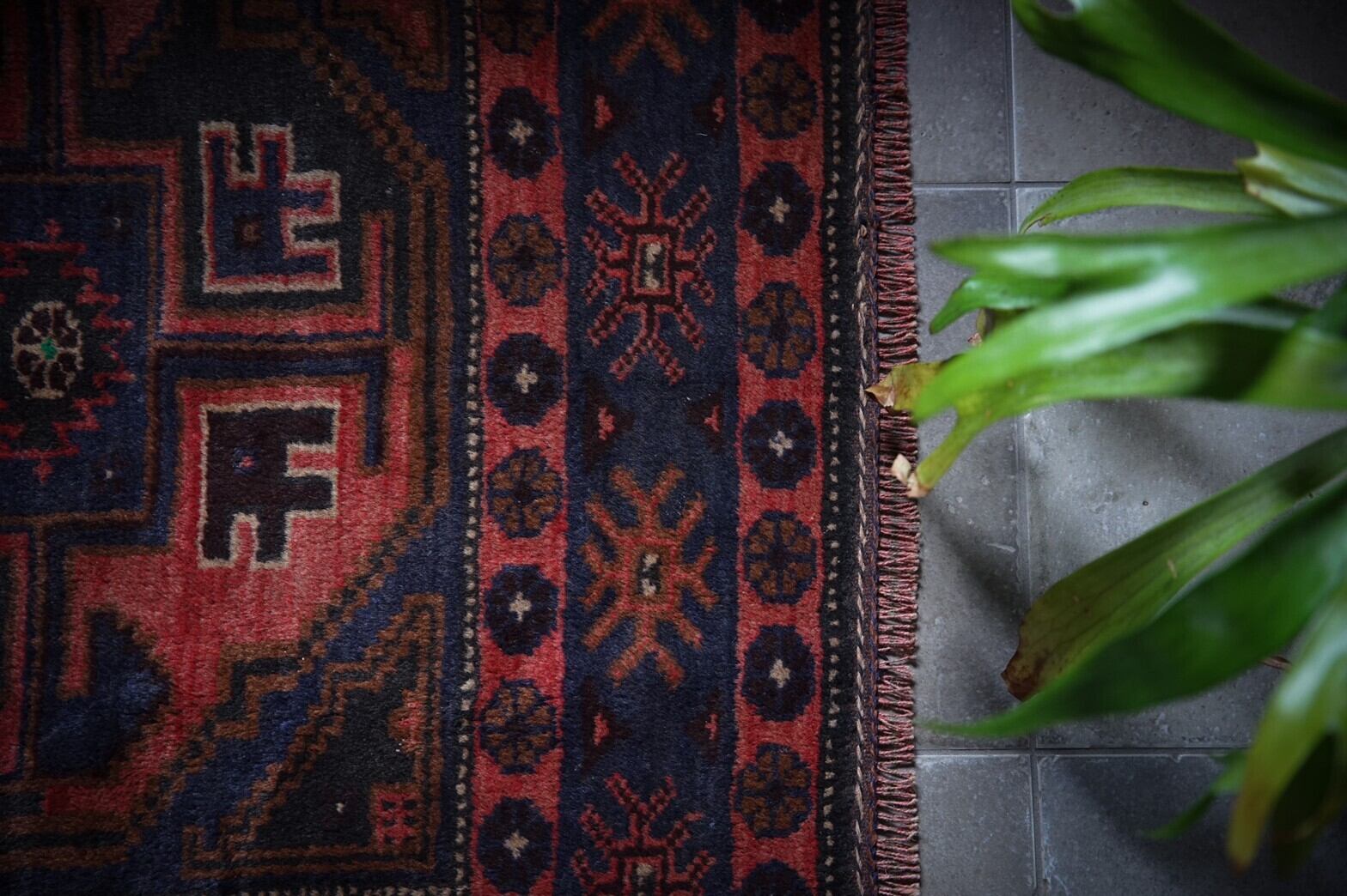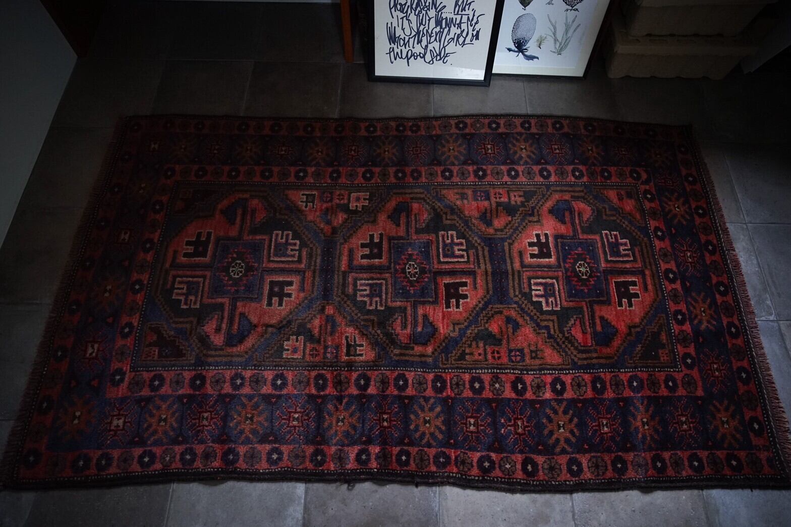 アフガニスタンのヘラート地方で60年前に作られたラグ。赤ベースにネイビーやブラウンの落ち着いた配色とツヤ感が魅力です。ボーダー部分にたくさん並んだトゲトゲの模様はごぼうの花。人々の洋服や動物の毛にくっつくいことから災いから身を守れるようにとの願いと豊かさを願うモチーフ。程よい厚みでツヤツヤなウールは経年変化でキラキラと輝き、手触りはすべすべと気持ちいいです。リビングに敷いたり、ベッドサイド、キッチンラグとしてオススメのサイズです。